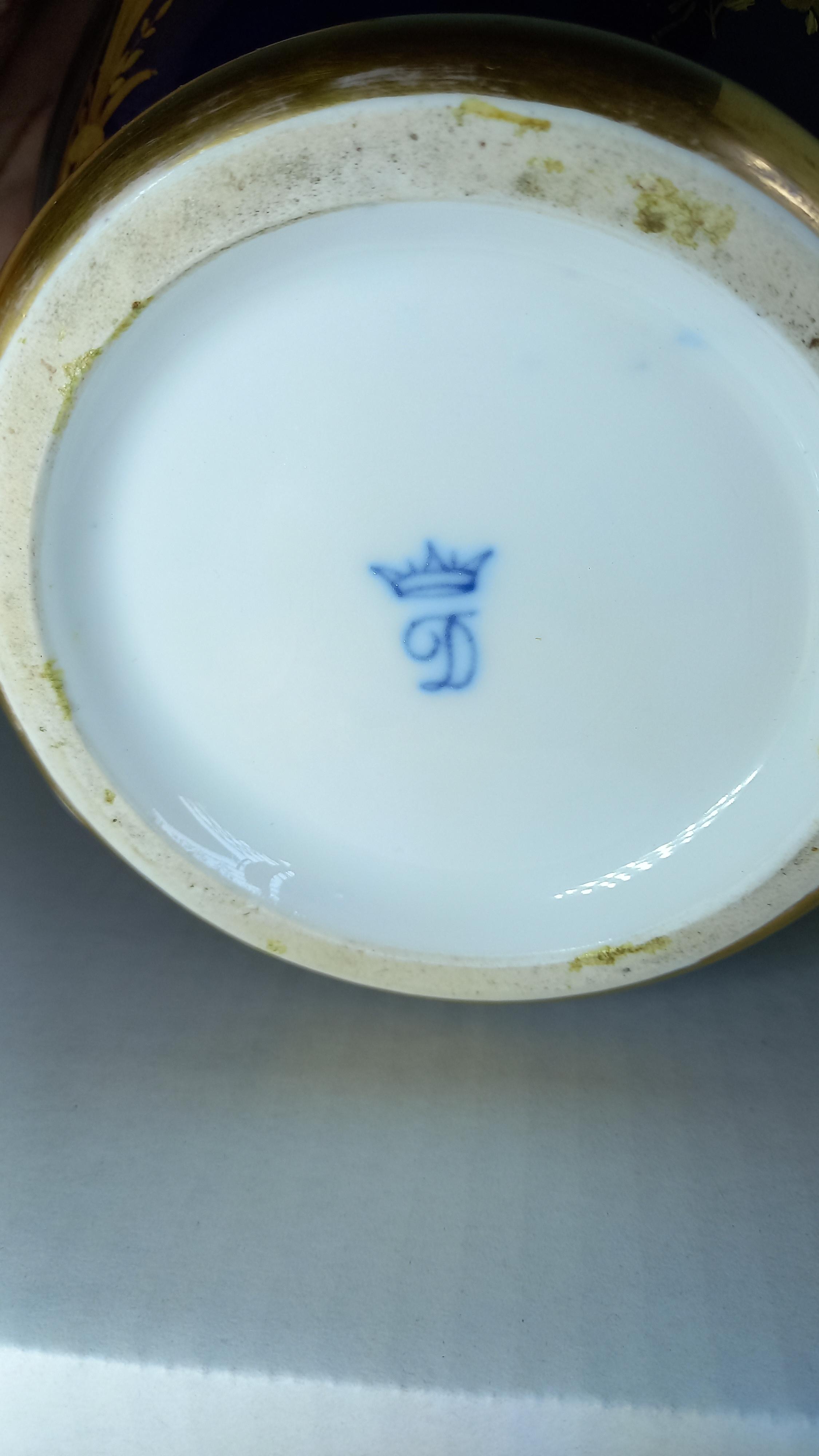 I suspect it is a Dresden, Helena Wolfsohn piece, although I was unable to find any similar in terms of color (cobalt) or the chosen scene (cherub). Possibly early 1800s? Mark is a blue crown underscored by a capital "D", seemingly below the glaze.