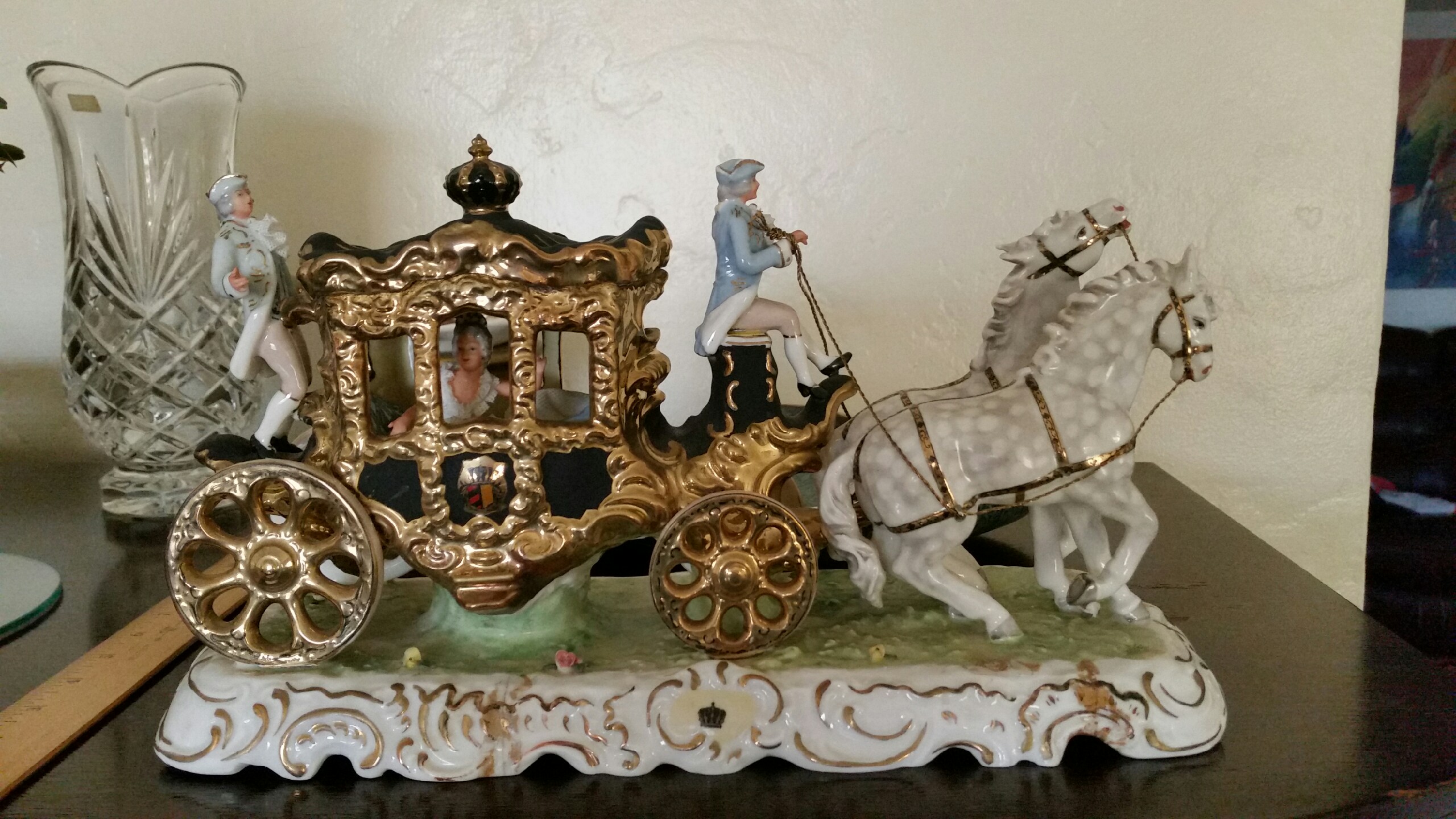2 horse gold carriage with driver and man in rear. Also has women inside carriage. Excellent condition. On bottom has letter N with a crown