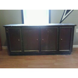 This item is made of sold wood with metal lion handles and the top of the dresser is leather