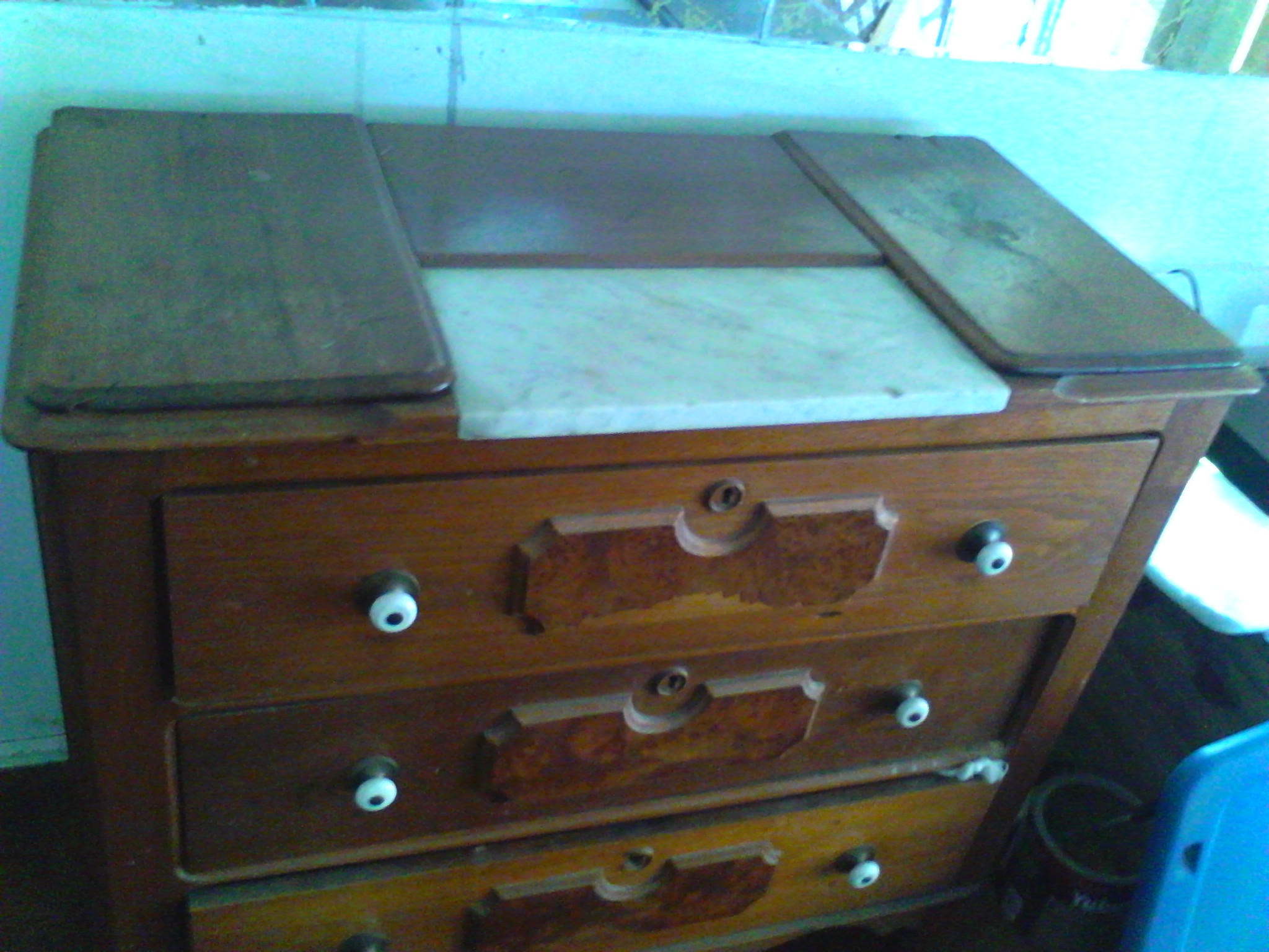 Wood Dresser with Marble top, all knobs present.