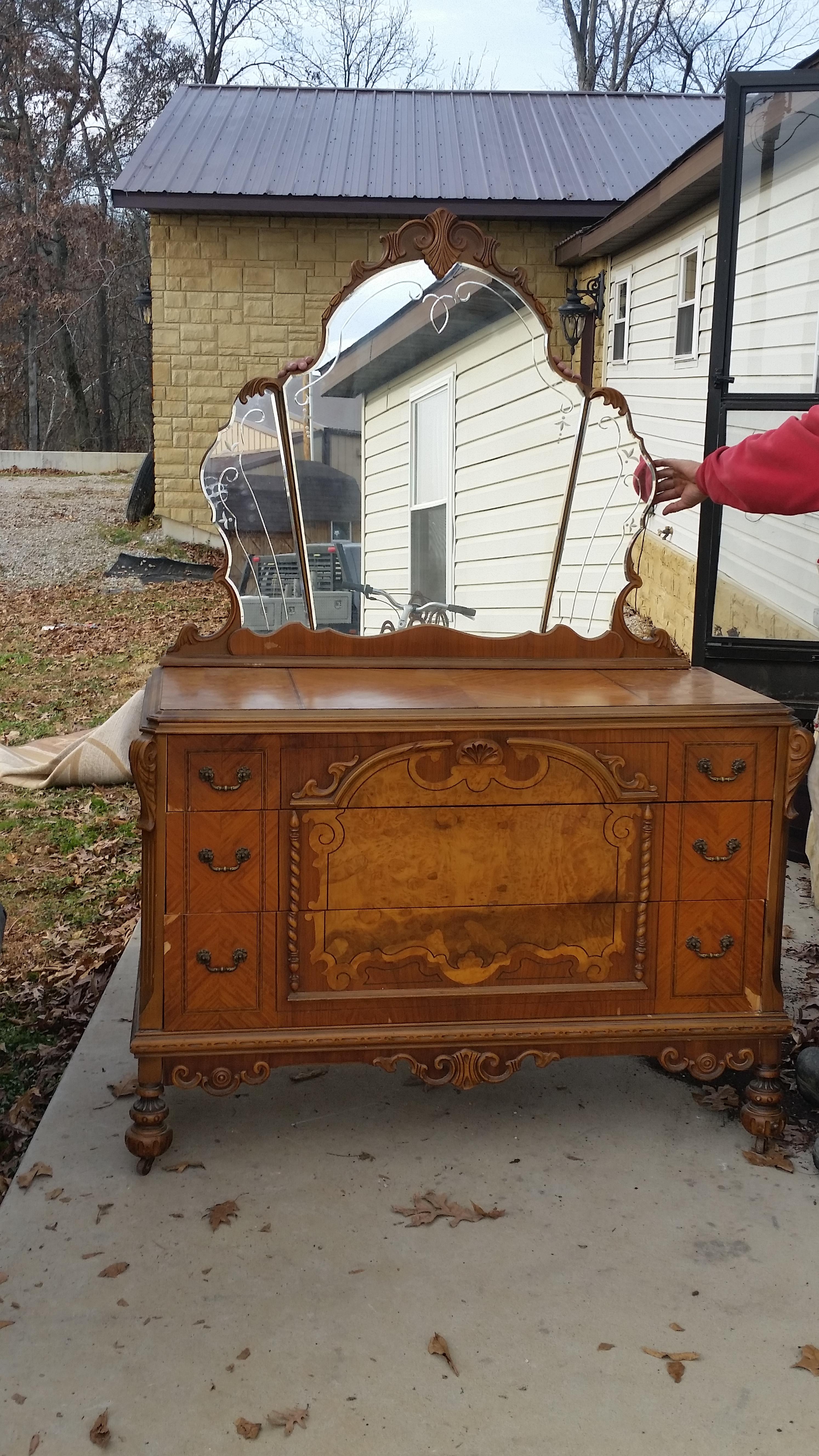 Antique chest of drawers and dresser. Functionality on both pieces is excellent. Cosmetics: The chest of drawers is in excellent cosmetic condition. The dresser has a couple small veneer blemishes that could easily be concealed. I have not done so because I was afraid I would deminish the value by restoring. I purchased the pieces approx 20 years ago. They have been in a non smoking home. I intend on selling the pices as a pair and am hoping to find a fair value or more information about the pices. Thank you for any input provided.