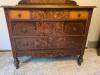 found this dresser and mirror at an estate sale last summer. it is an incredibly heavy piece of furniture, the beveled glass mirror itself weighs over fifty pounds. some edges are a litttle banged up and there is a paint spot on the dresser top that I was afraid to try and remove for fear of ruining the beautiful finish of the wood. dresser features turned wooden knobs and functional brass keyholes.
