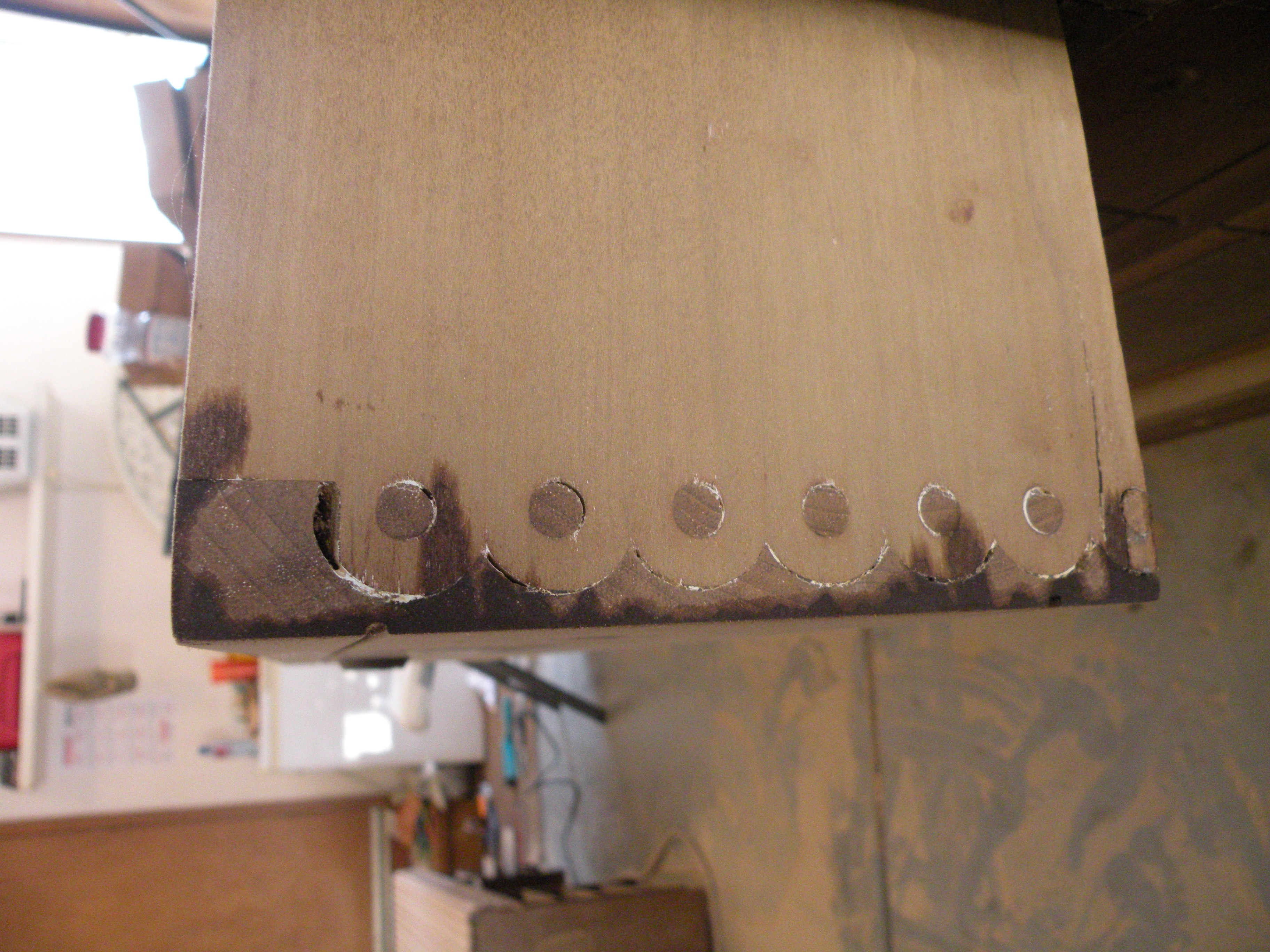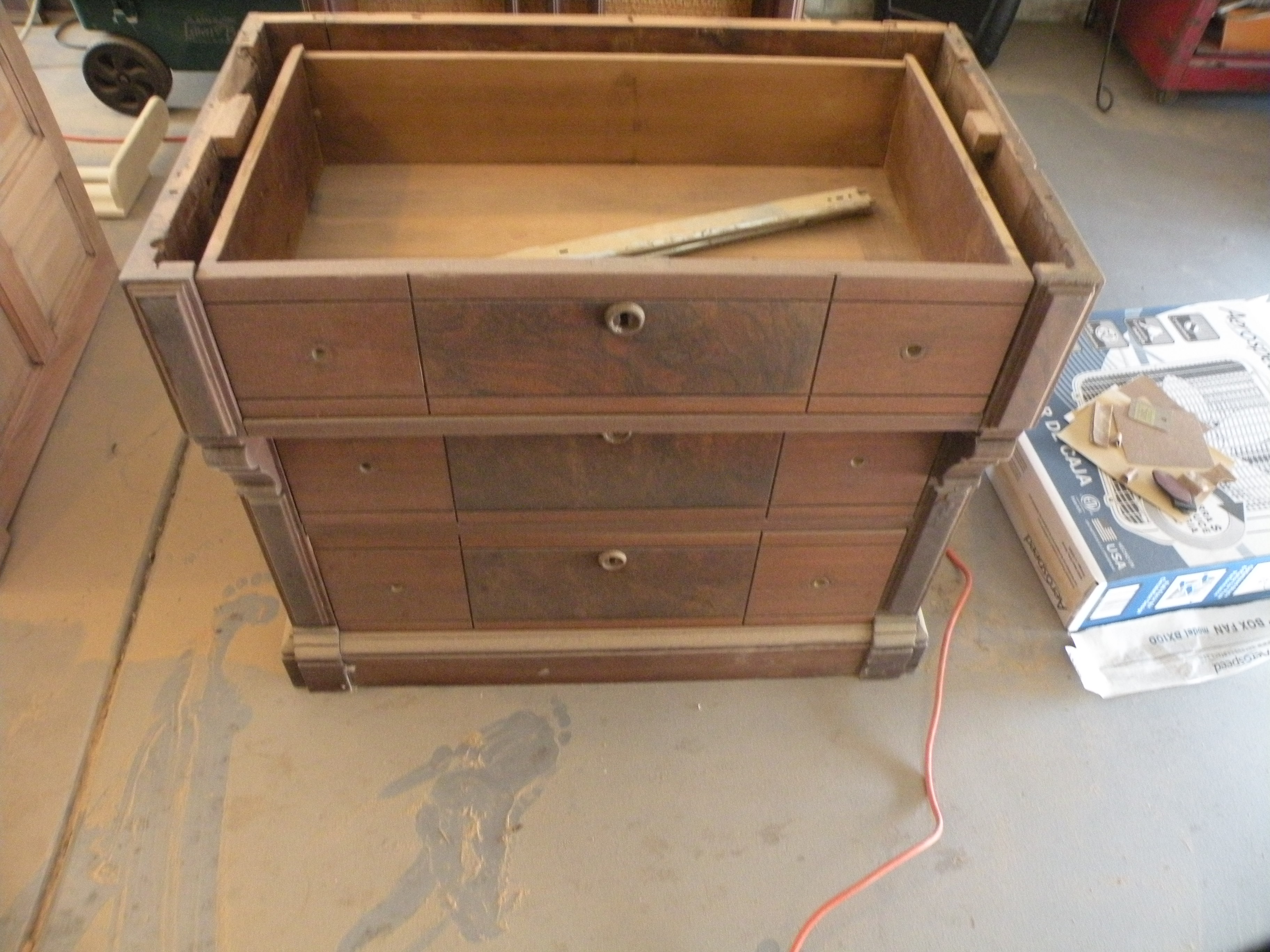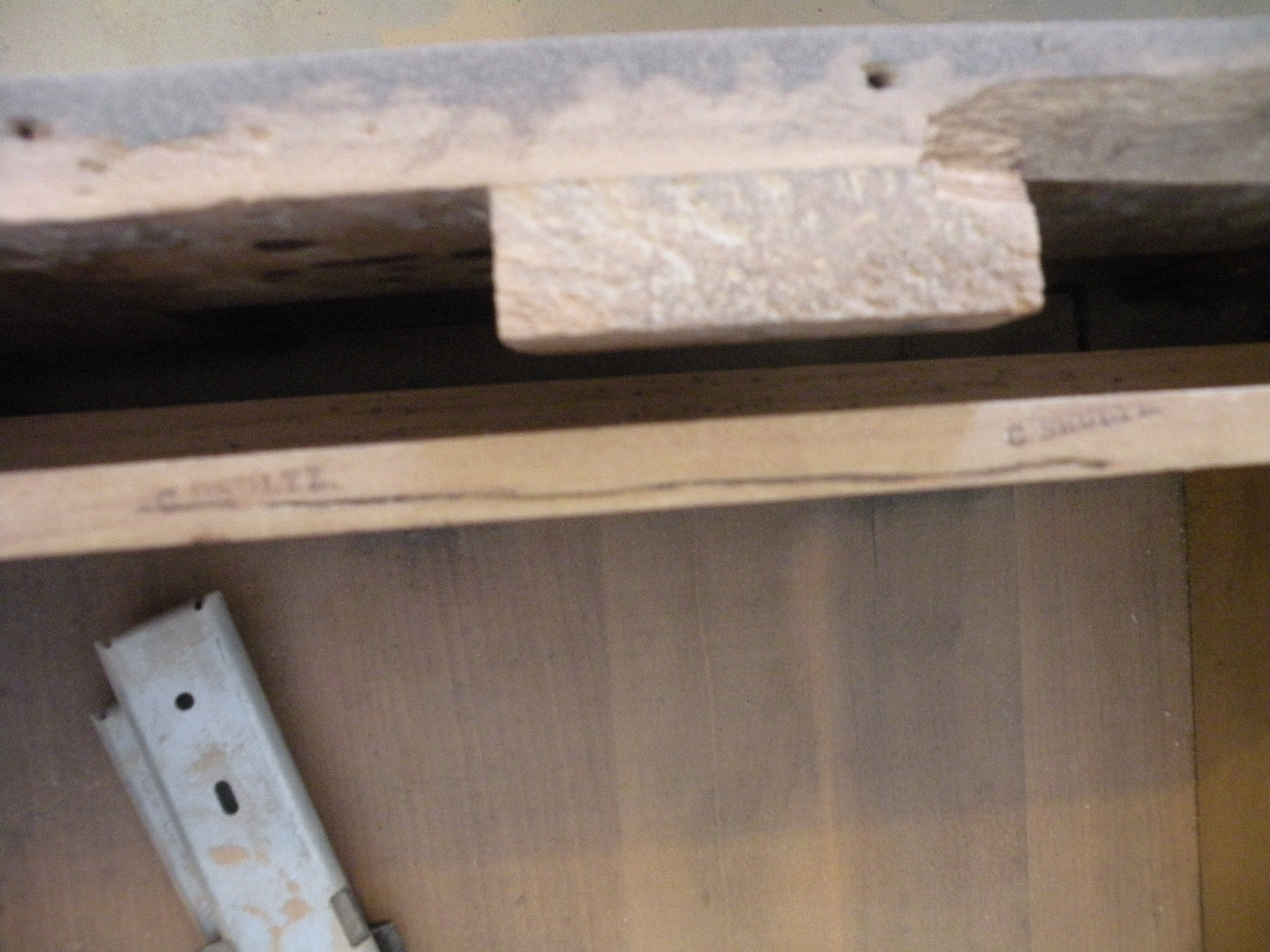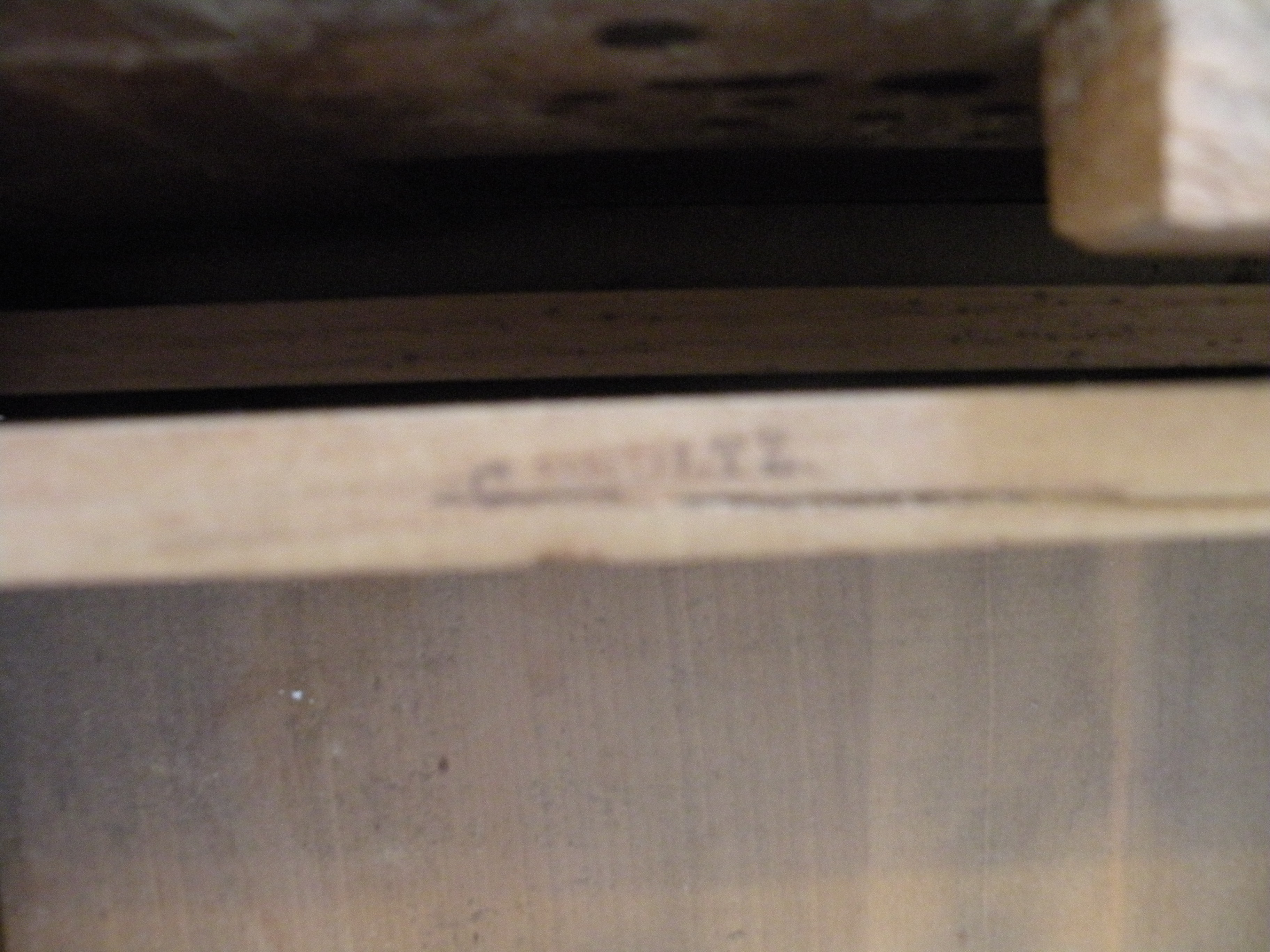 Three drawer low-boy dresser with veneer inlays in drawers.  No idea time period, value or maker.  Drawer was marked with what looks like a typeset burn c. shultz.