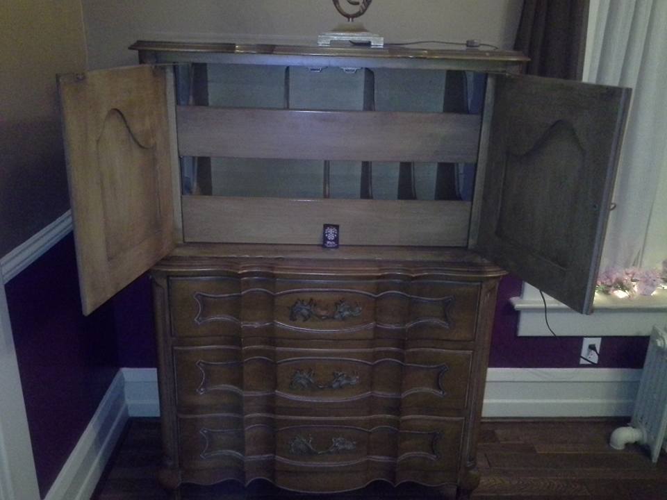 Has two slated drawers in top hutch , bearing legs and brass scrolled hardware.