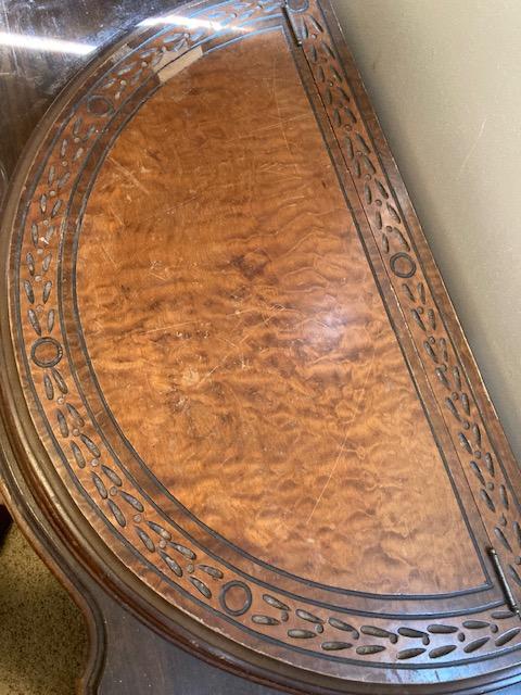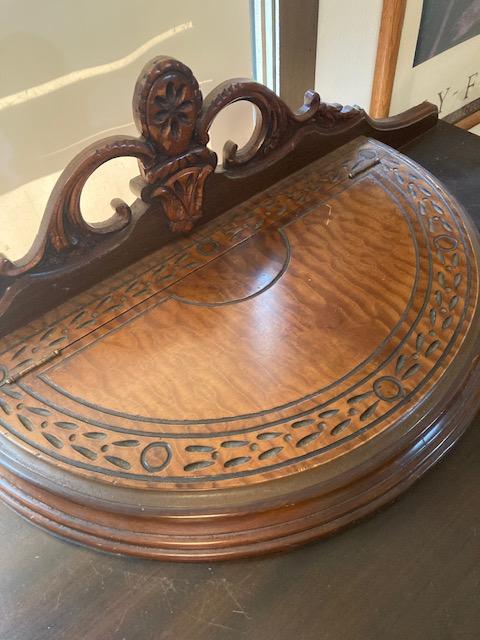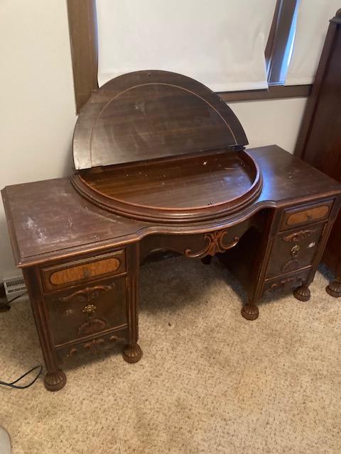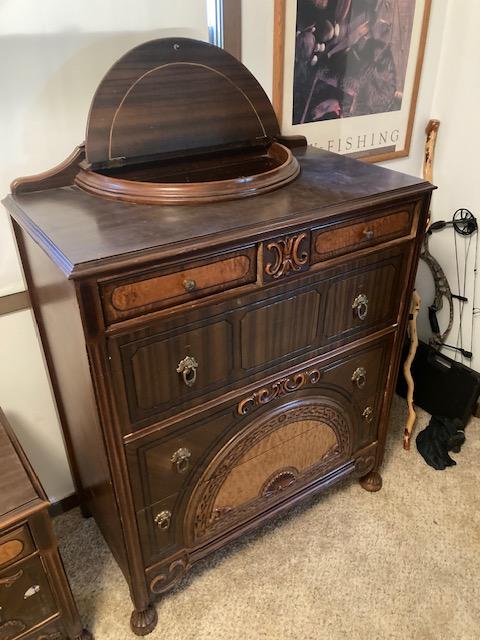 1920's or 1930's dresser with flip up top. Make-up vanity with flip up top and mirror. Appears to be made of walnut and maple burl was given to me from a friend. Also has castors