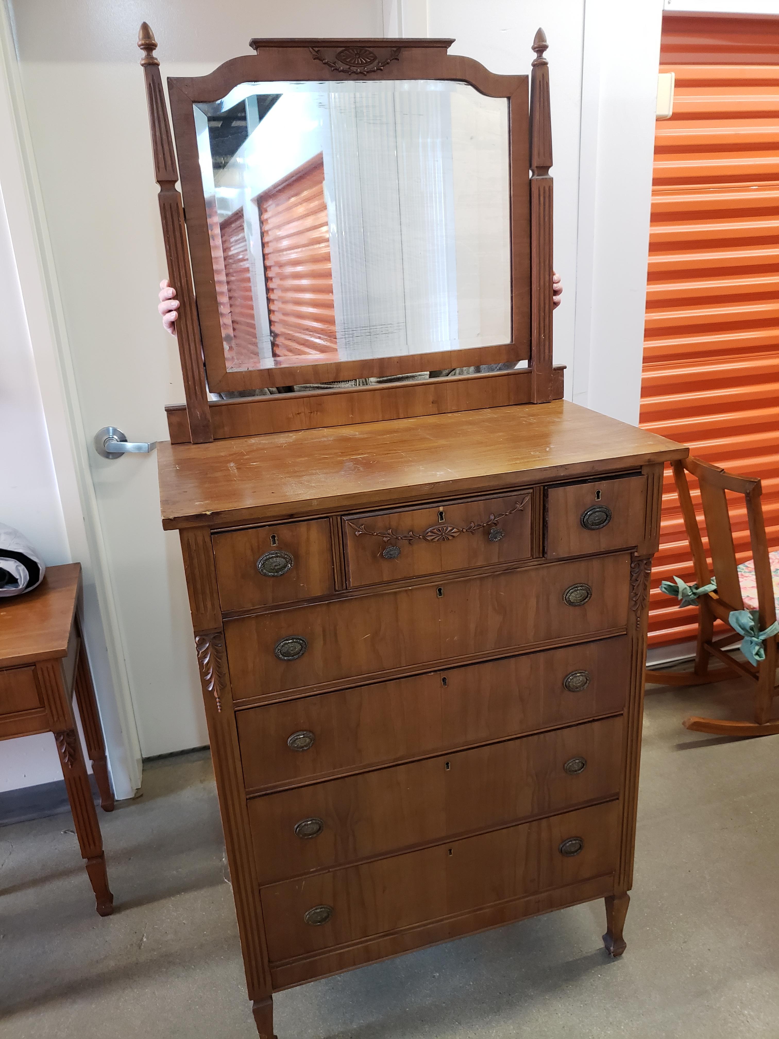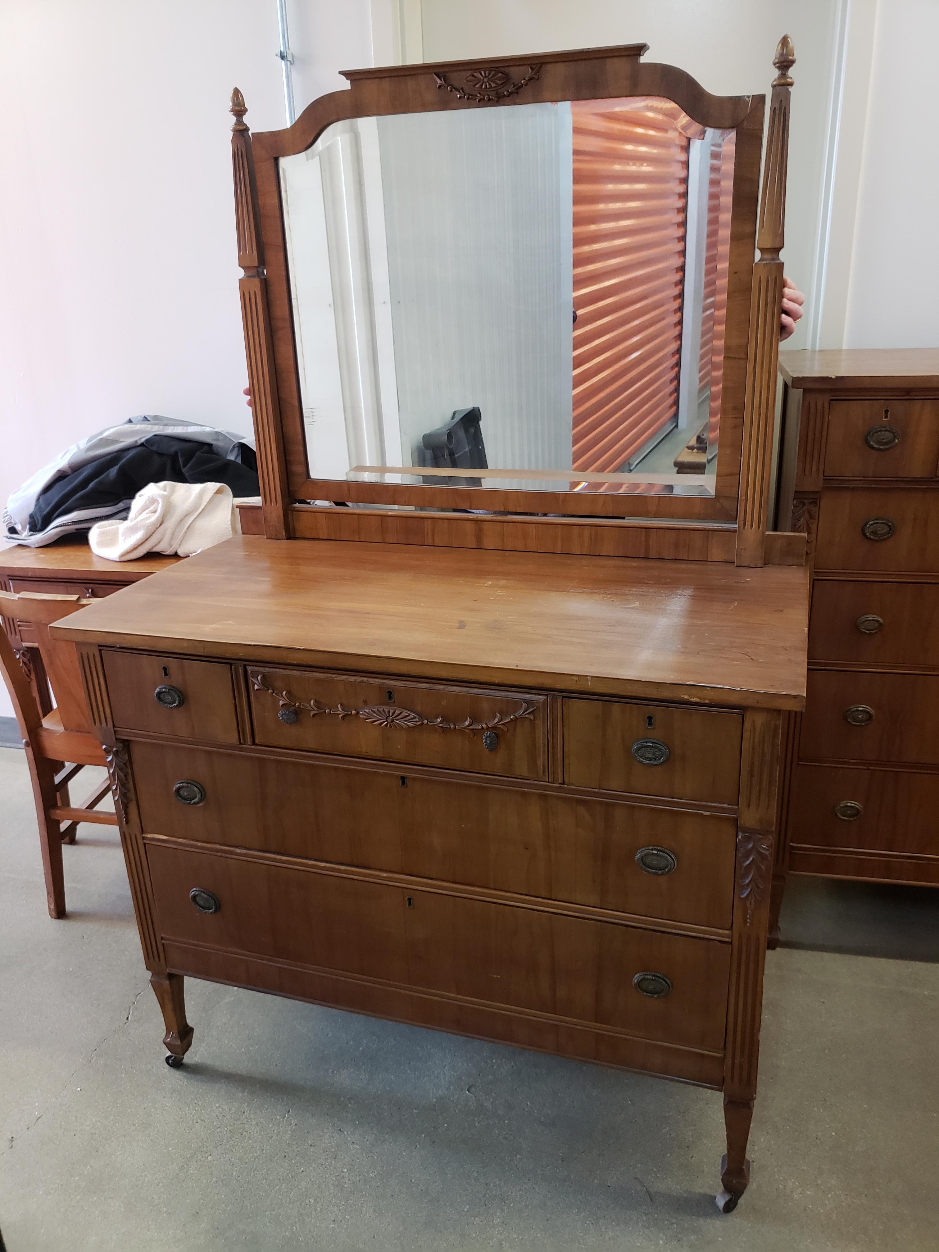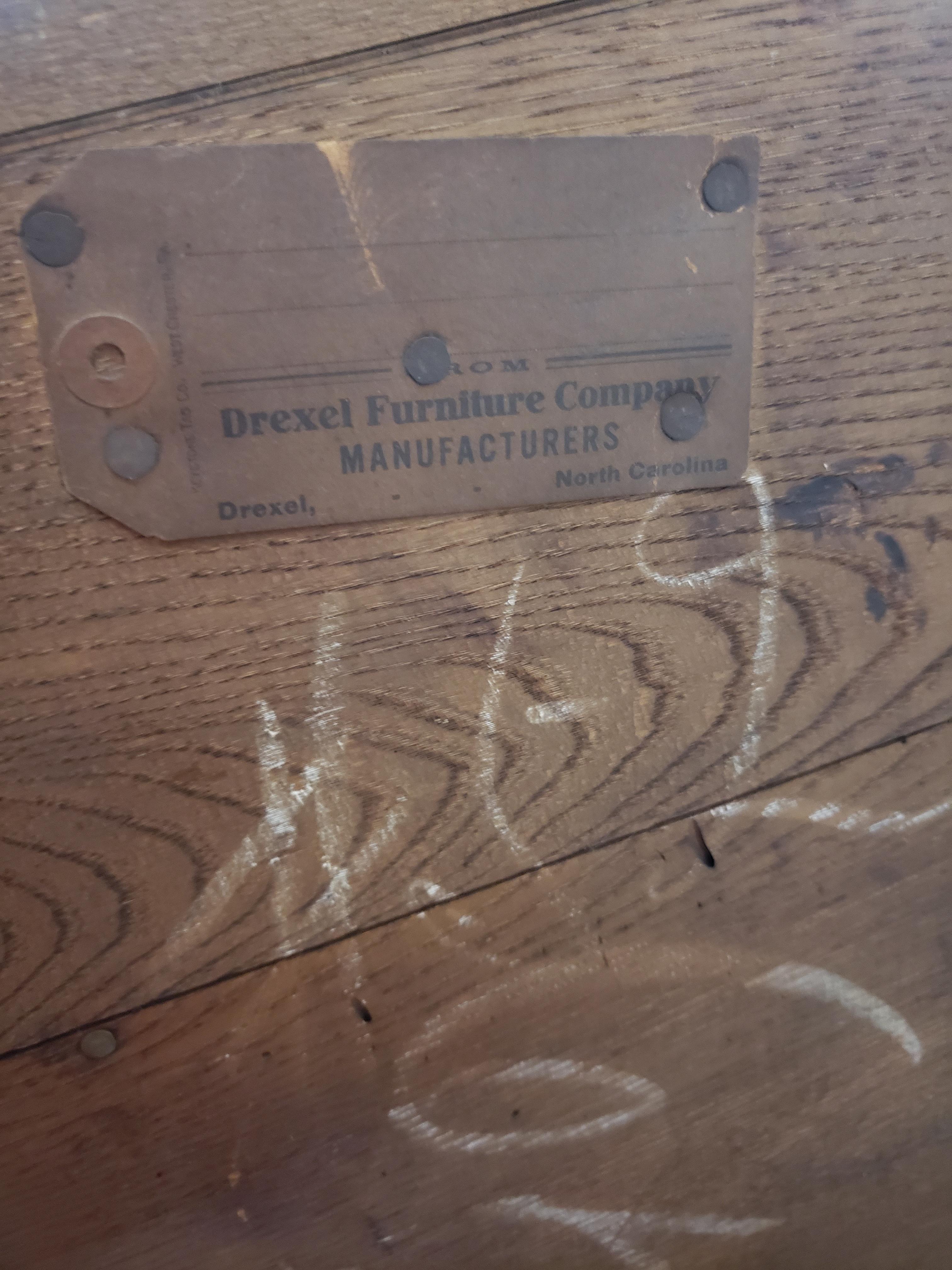 I am looking for an appraisal for a Drexel bedroom set belonging to my grandparents that I believe dates back to the early 1900's. The pieces include a double bed with headboard, footboard and side boards, a tall dresser, a shorter dresser with mirror, 2 desk/dressing tables, one chair, and a rocking chair (I believe it may be a nursing chair because it sits low to the ground). There is a second mirror but I cannot recall if it goes on the tall dresser or on the dressing table/desk. The set has never been refinished.