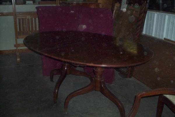 4 side chairs and 2 arm chairs. One arm chair shows sign of repair. 2 pedestal table, 2 21 inch leaves. Have protective padding for table top and storage for leaves. Set shows normal wear and tear. Unknown what the type of wood is, perhaps cherry? Stamped Drexel on the bottom of chairs.(Sorry about the spots on the pictures, my camera needs cleaned it looks like!)