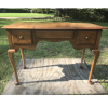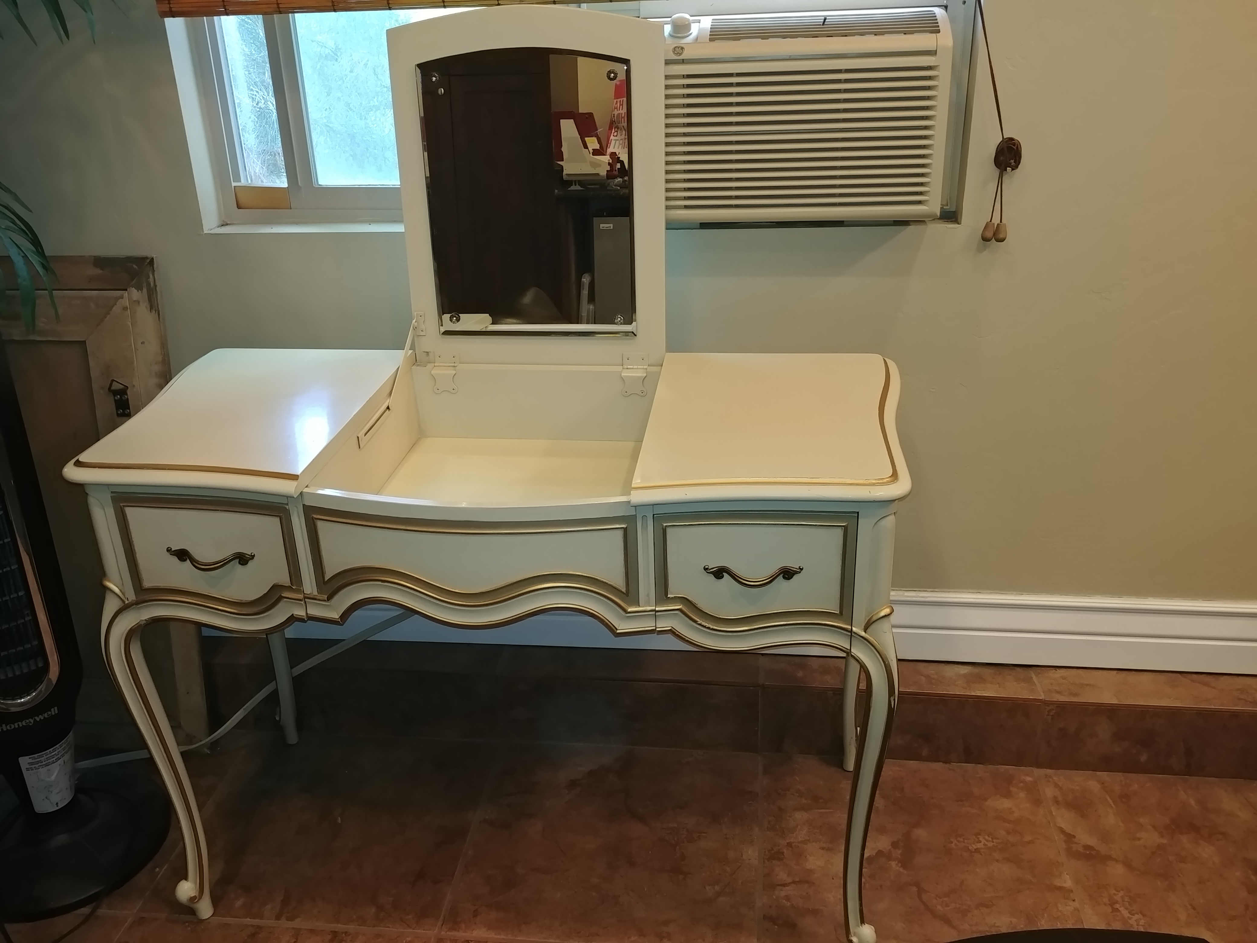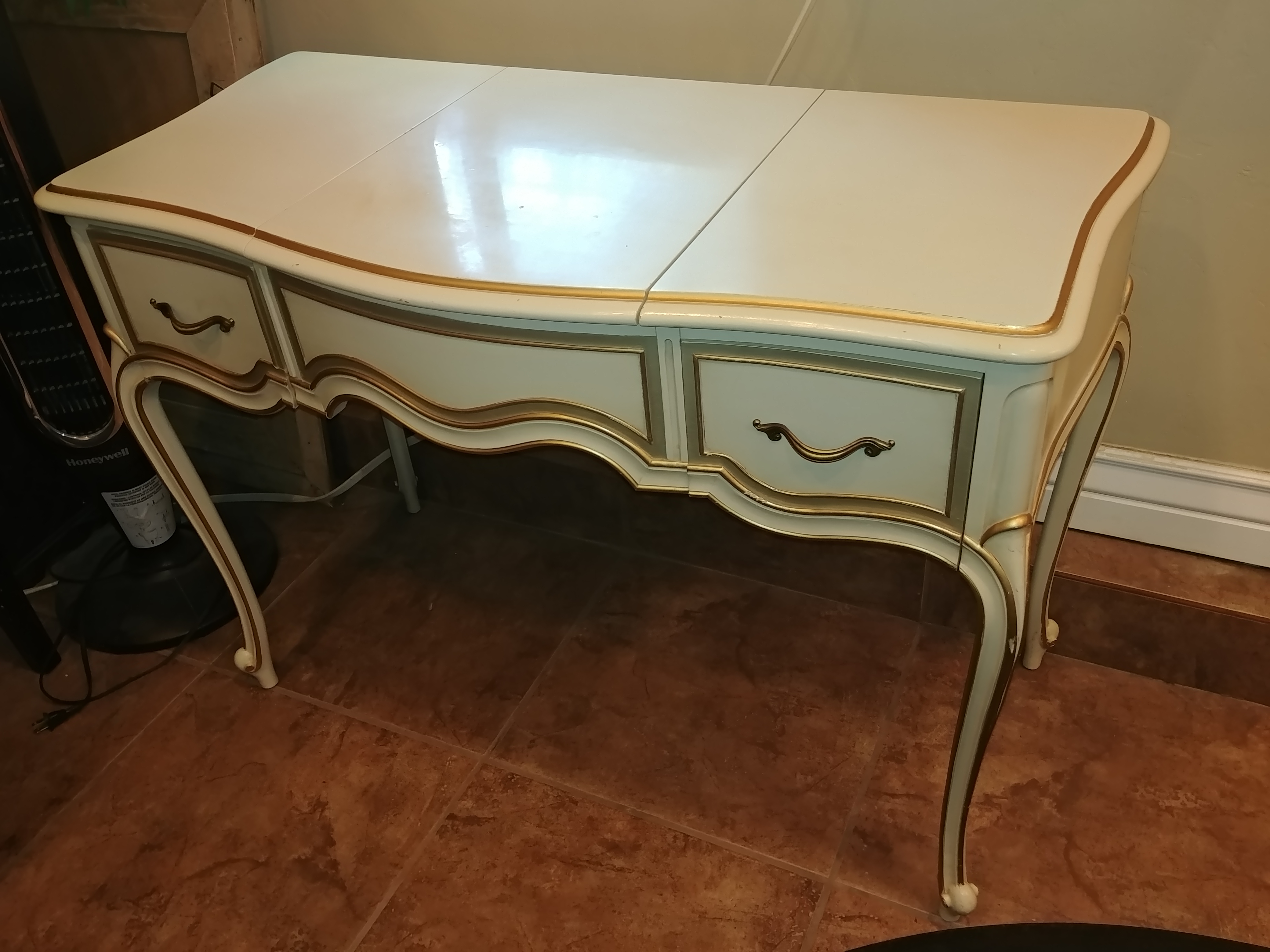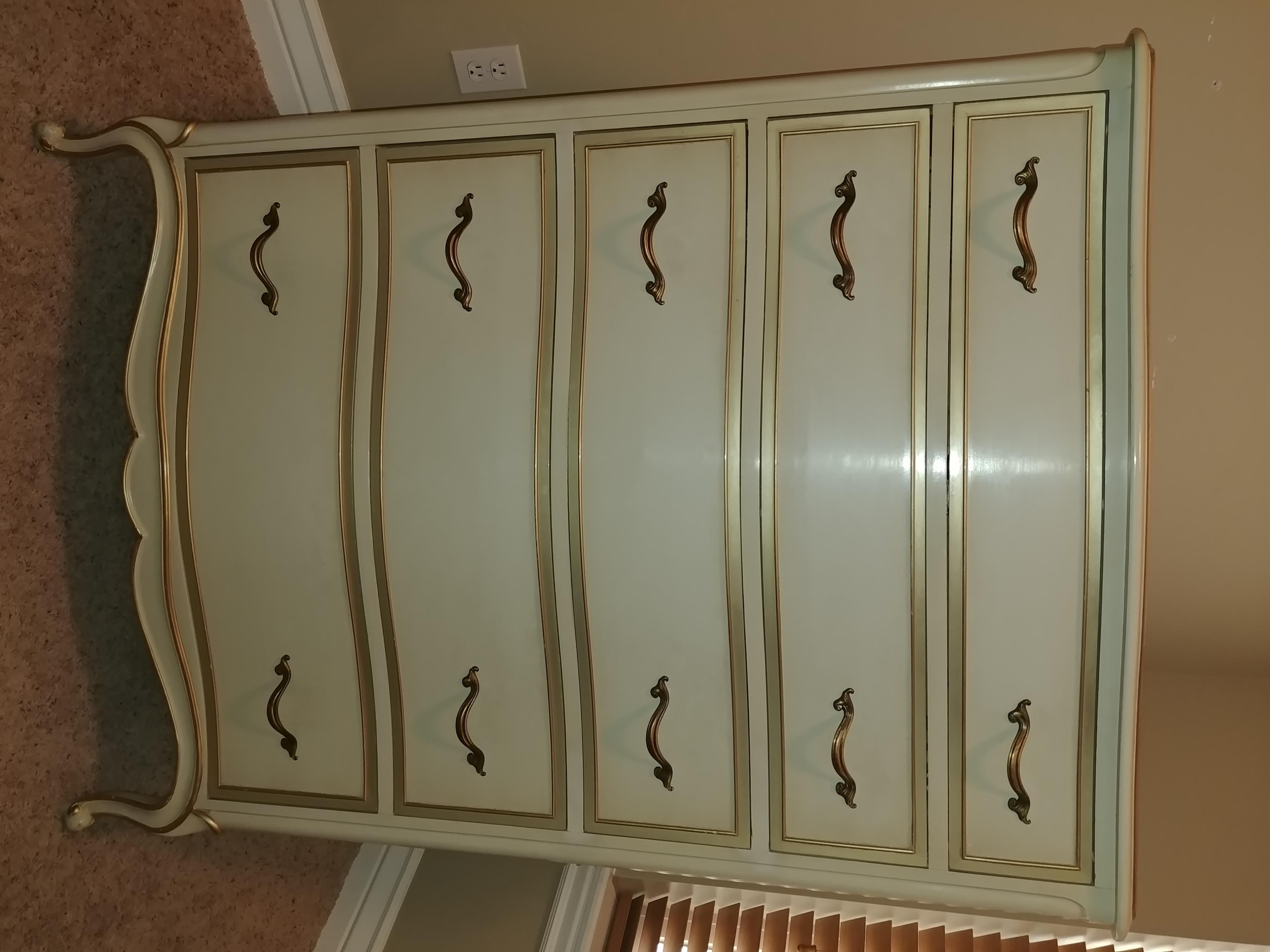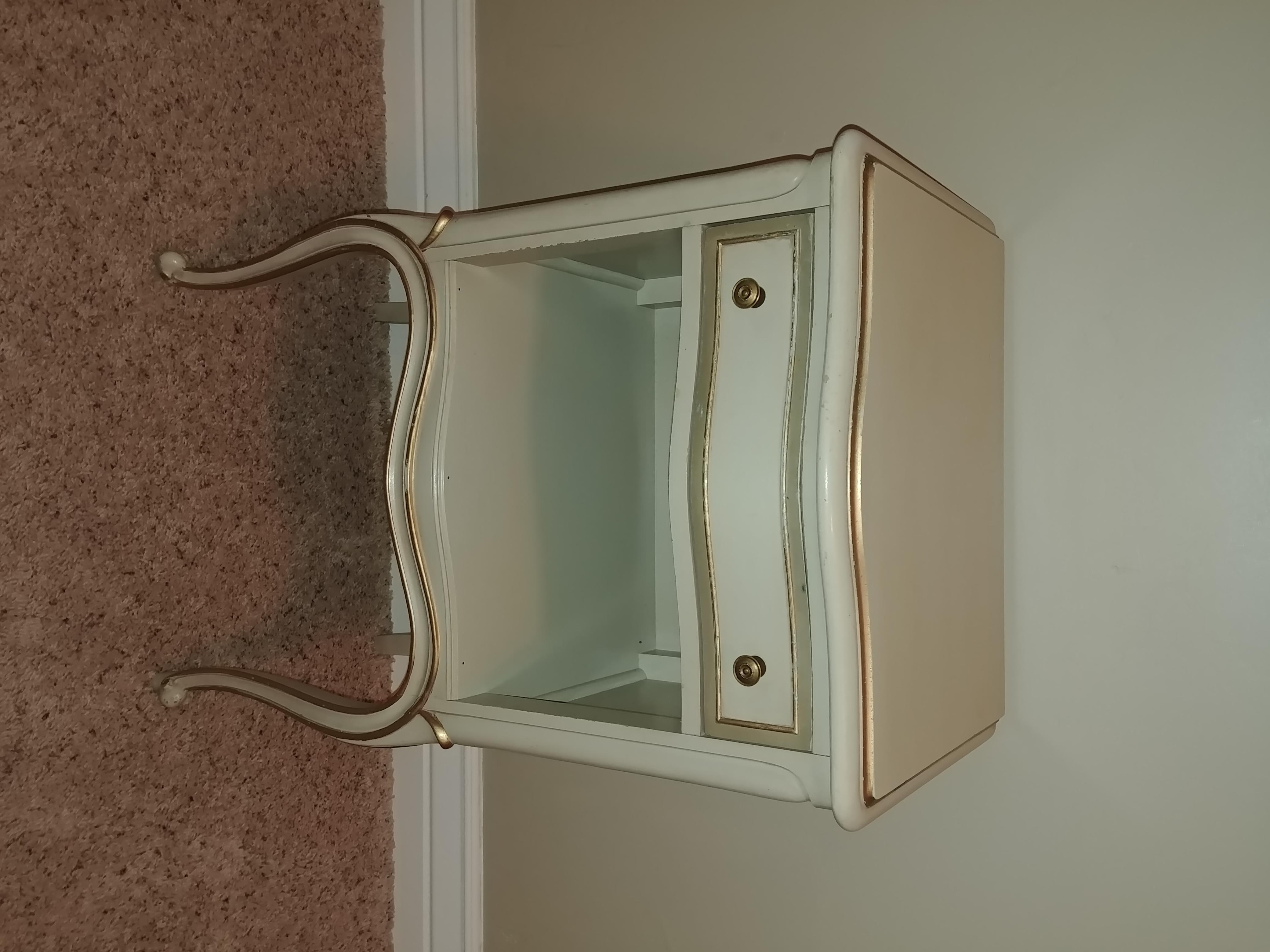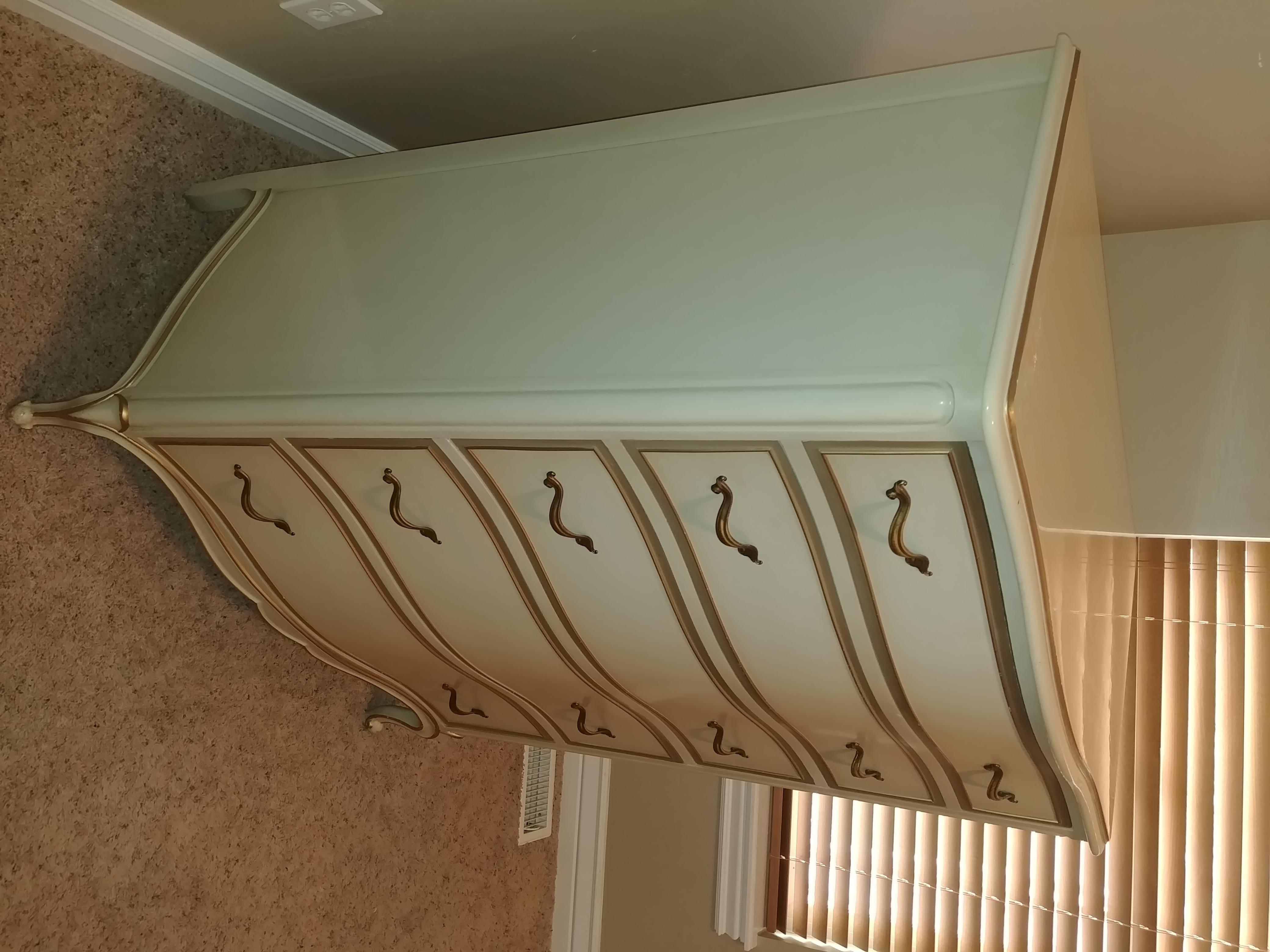 I'm not sure on the date of these pieces. I inherited this Drexel dresser, vanity & nightstand from my great grandmother. She was a wealthy women that had great taste in fine furniture. They are a glossy cream color with I believe gold leaf brushed around the front frame of the drawers and around the bottom and top edges of the dresser, nightstand and vanity. Everything is in excellent condition. The drawers all work perfect. There is a little peeled paint on the top of the dresser. I'm sad to see this set go. Its really beautiful.