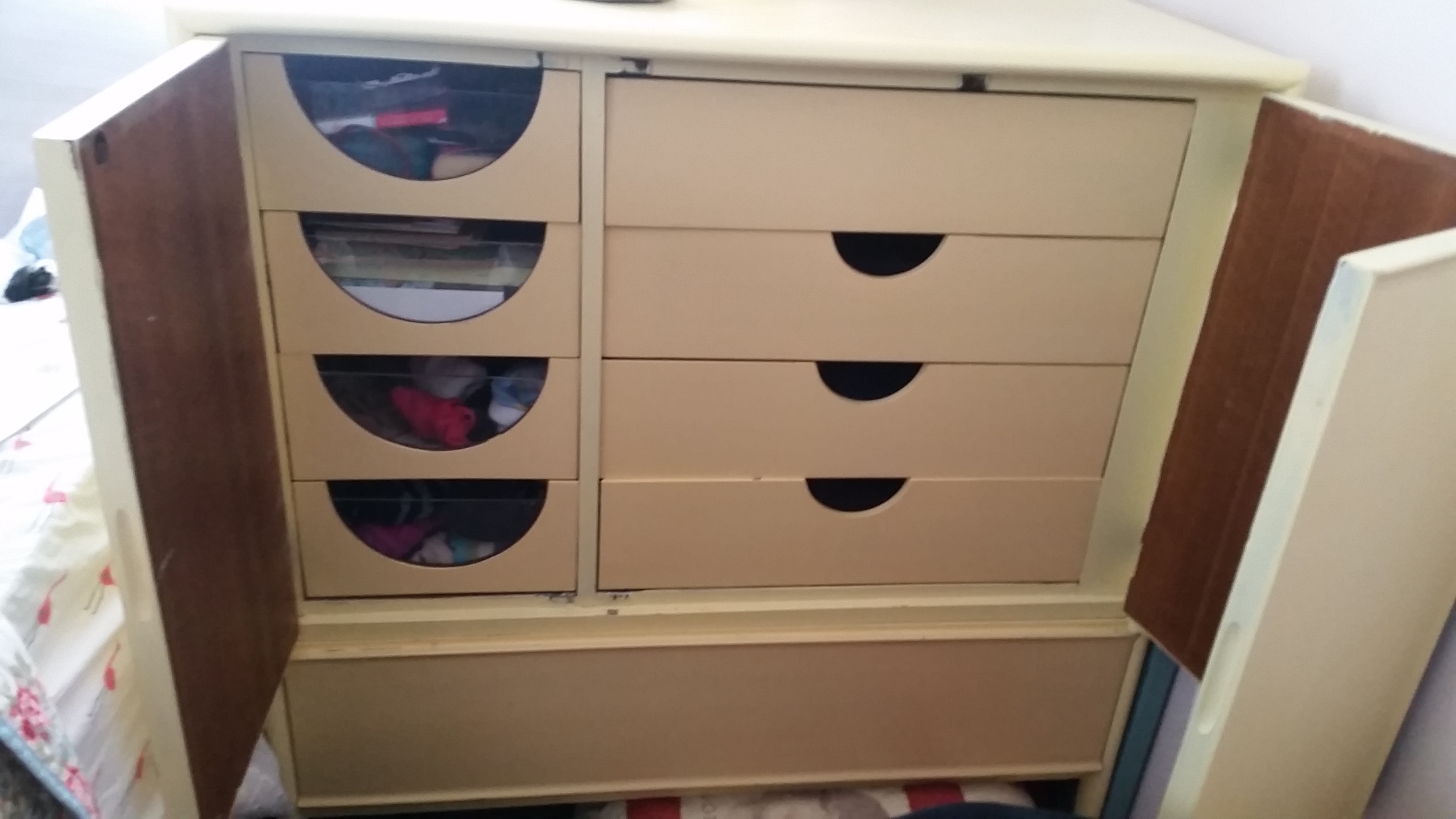 Description This piece has been painted. Received it free off side of road a few years back. Excellent condition except one leg is cracked a little . Please excuse the mess
