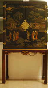 Liquor cabinet, mirrored inside w lighting and both sides of interior have places to hand wine glasses, also 2 drawers inside.
