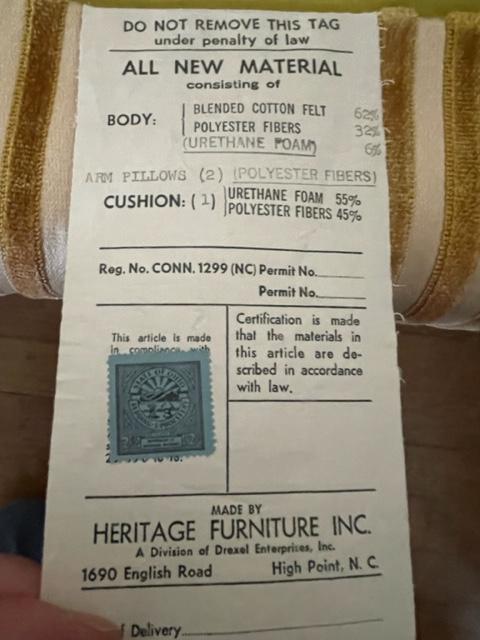 I have a Drexel Heritage upholstered sofa that I need appraised to sell. Besides the pictures I have attached, and the product tag within the pictures, I don't have much information. From what I can see it looks to be in the Sheraton Style with Inlaid Mahogany along the arms, sides and back of the sofa. The sofa is very long and I can get you the dimensions if needed. The sofa is in fair to good condition. The upholstery is scratched up along the back corners.