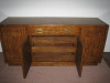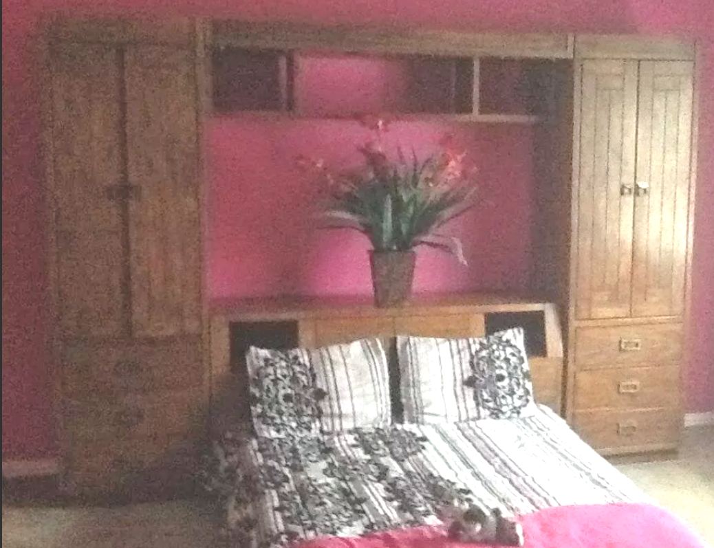 4 piece wall unit head board w/ 2 yall side armoires mirror and above track lighting