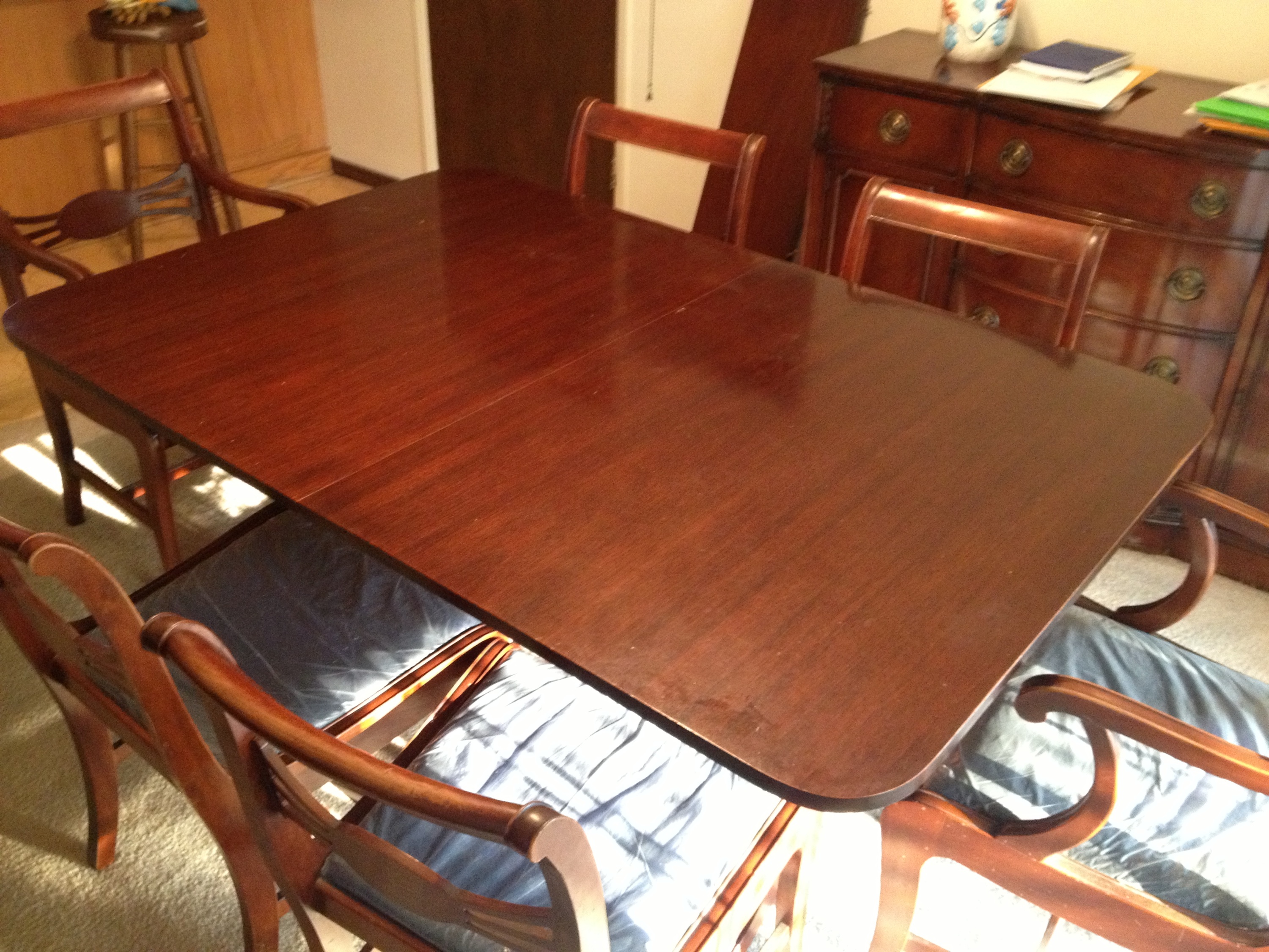Late 1940s or early 1950s cherry, dining set. Includes: 6 chairs, 2 table extensions and a credenza.