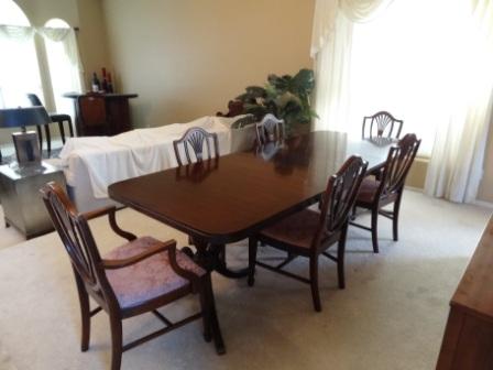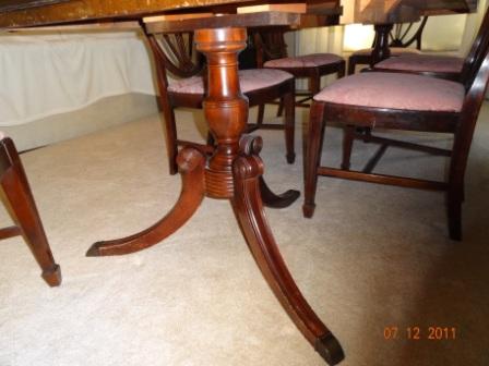 Table has 3 leaf extensions to max length of 102".  Full table pads for table plus each leaf.  Chairs are shield back, purchased separately: 1 captain's chair, 5 side chairs.  Can you tell me the value of this for resale?