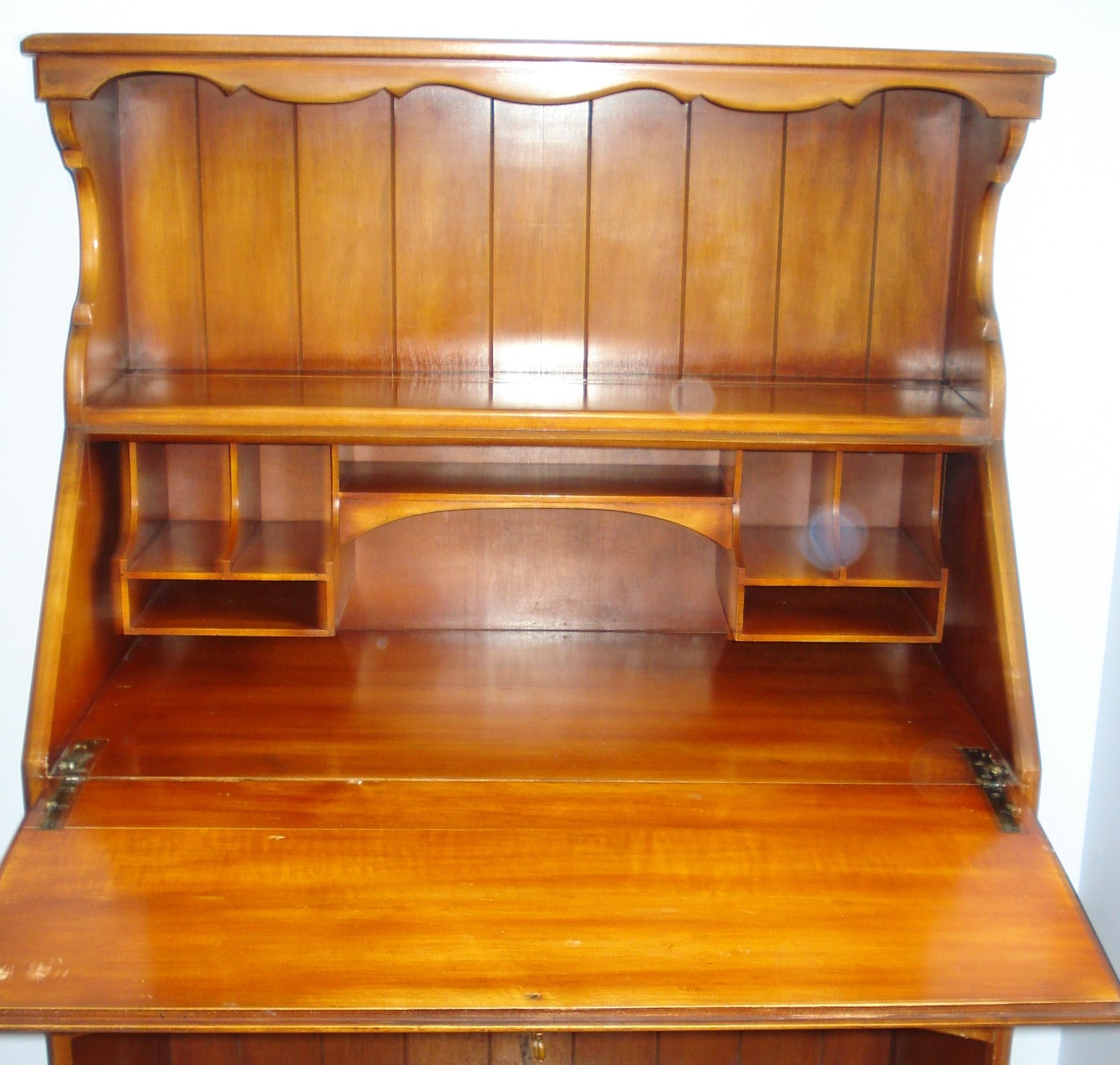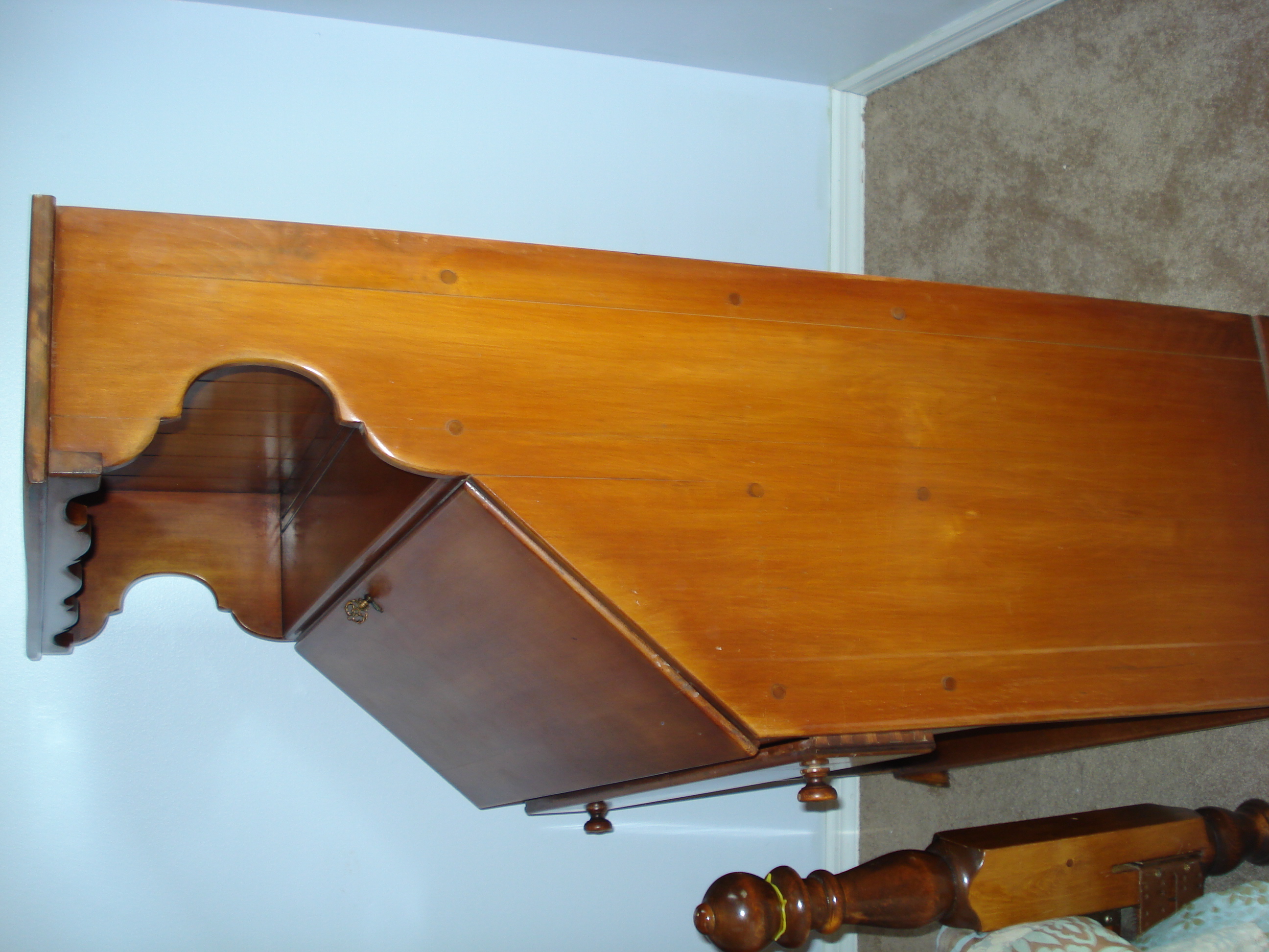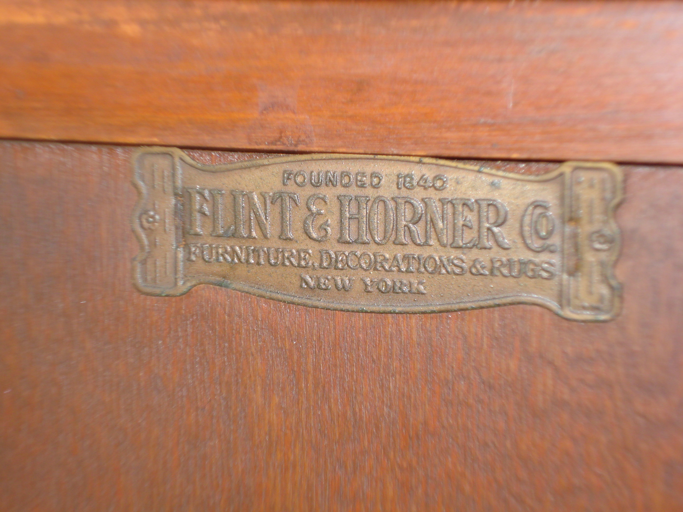 Desk with Drop down front made by Flint and Horner. Desk has one drawer (dove tailed) and one water mark from glass on the top. Otherwise, the finish is in excellent condition. I'd like to know the approximate value. Numbers printed on bottom of backside are 343-7MP 2192