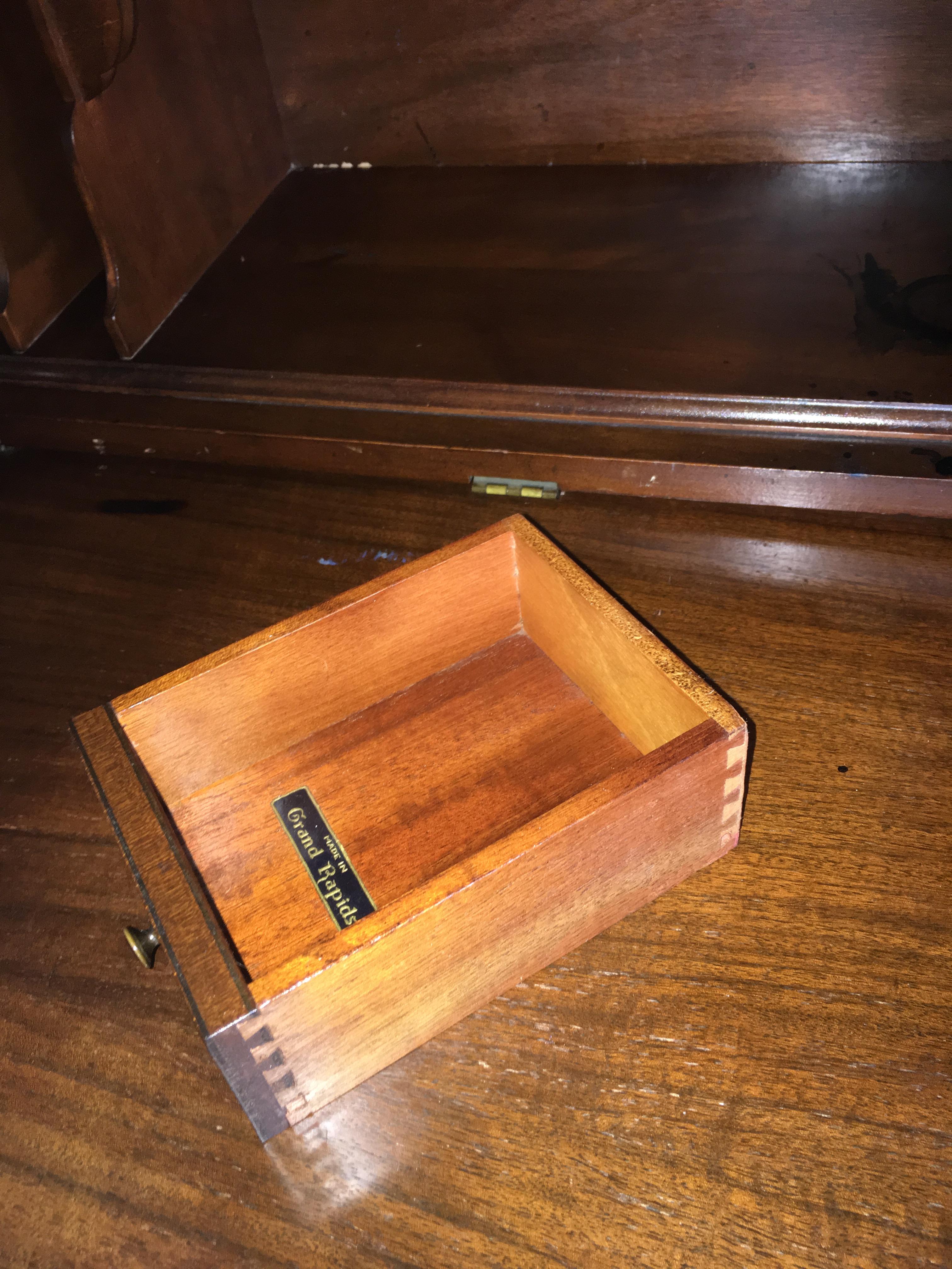 Your desk datwes from the first quarter of the 20th Century, Grand Rapids, Michigan then being the furniture production capital of the world. We retail comparables in very good condition for under $500.00 these days.
