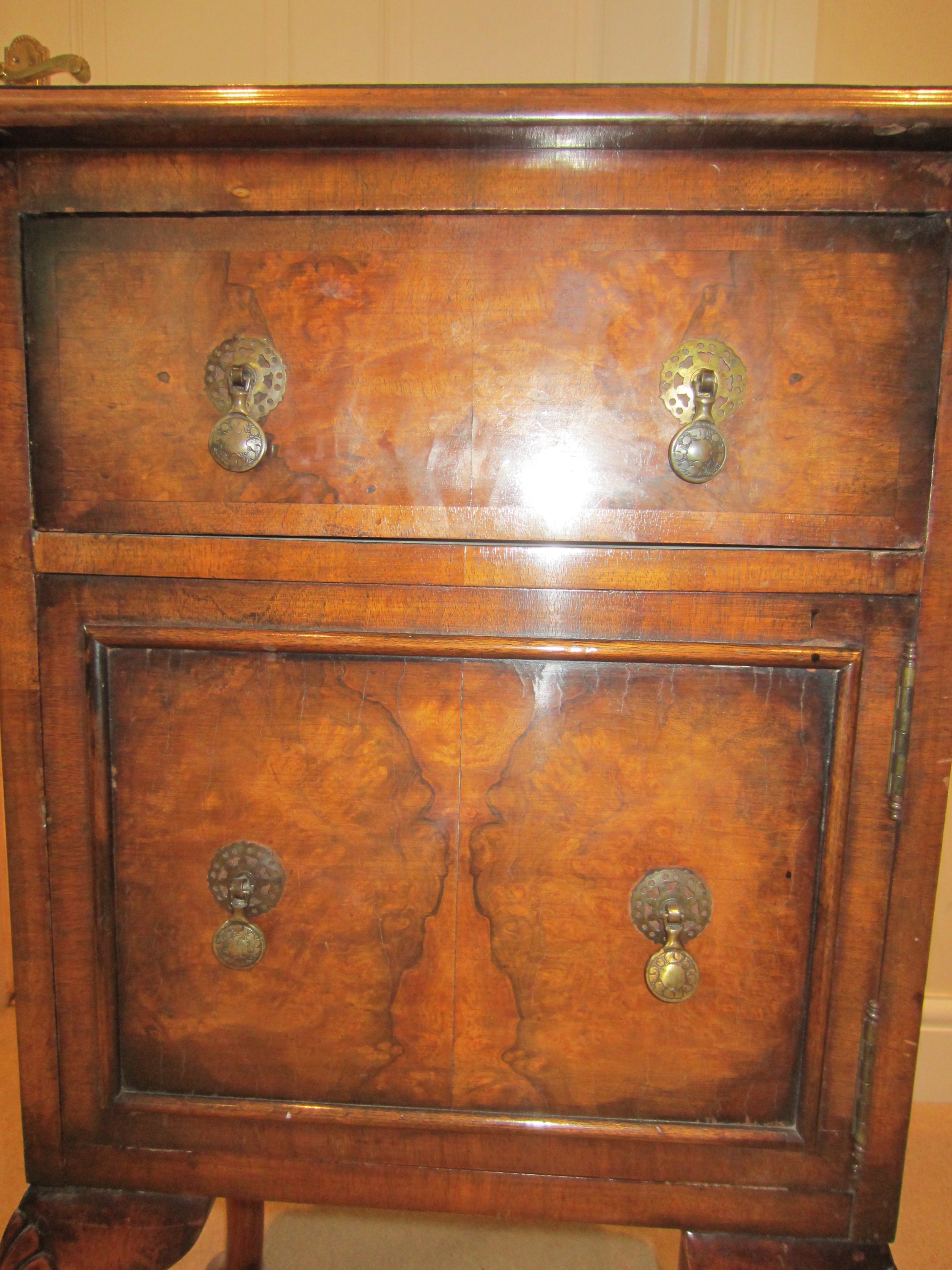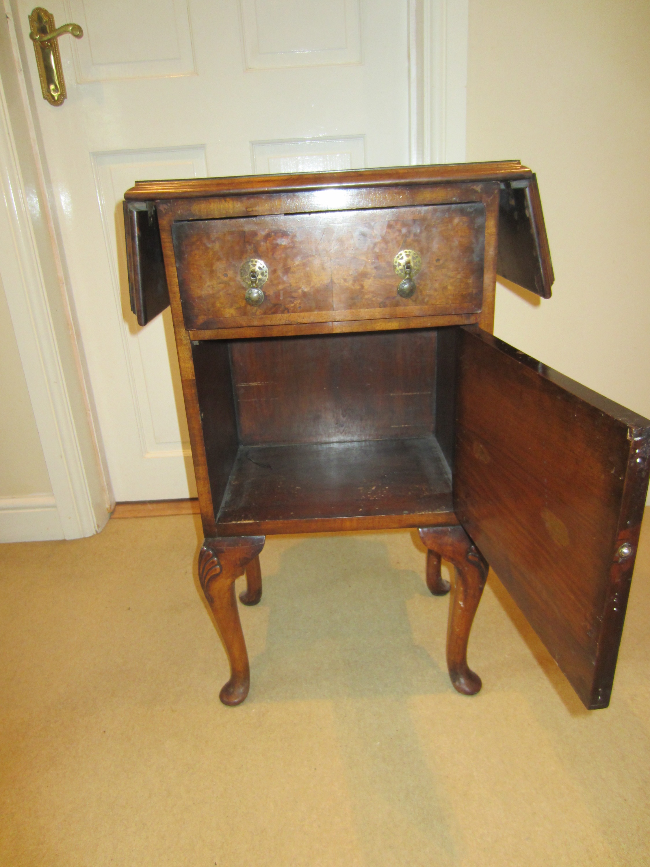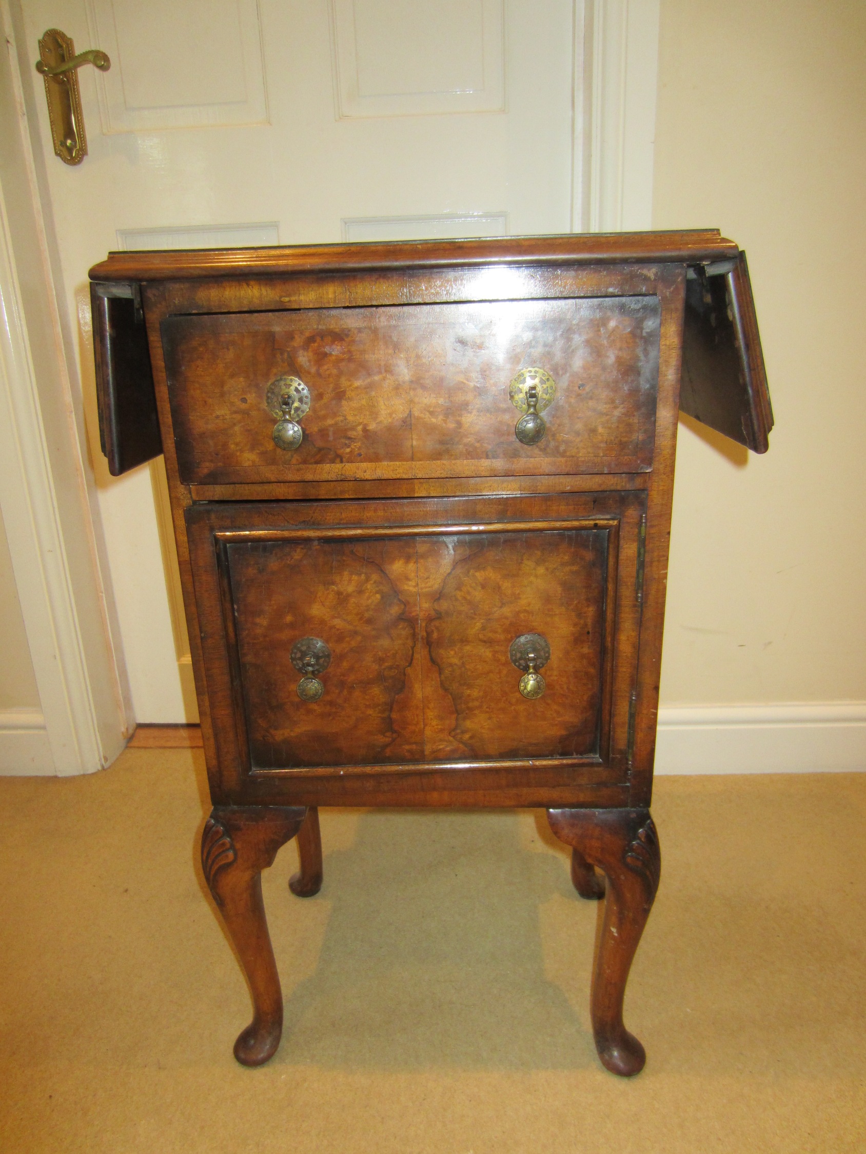 Figured walnut (I think) cabinet having shaped top with lift up ends above single draw and single door with brass tooled handles, the base fitted with cupboard raised up on four cabriole legs termination in scroll feet