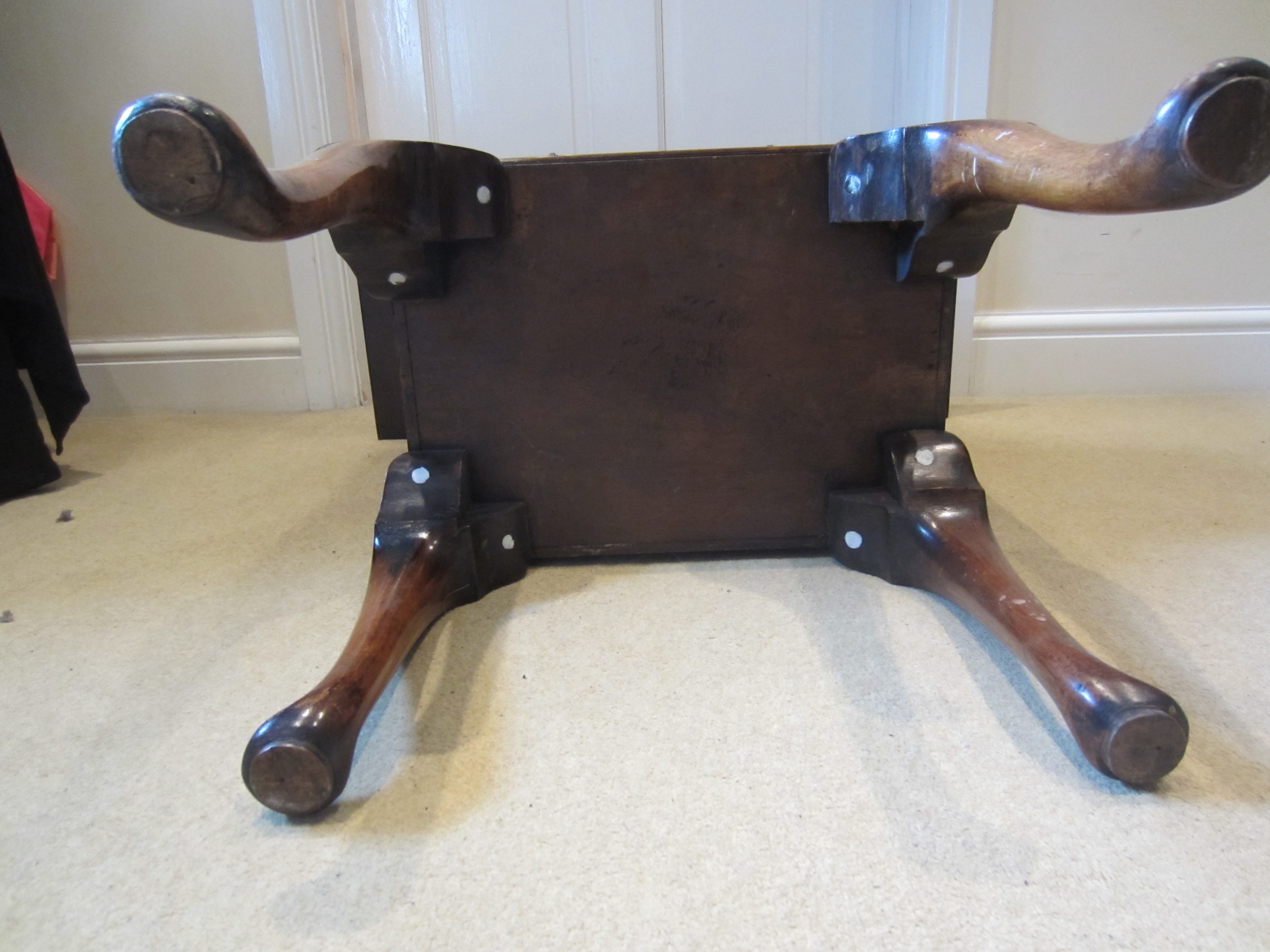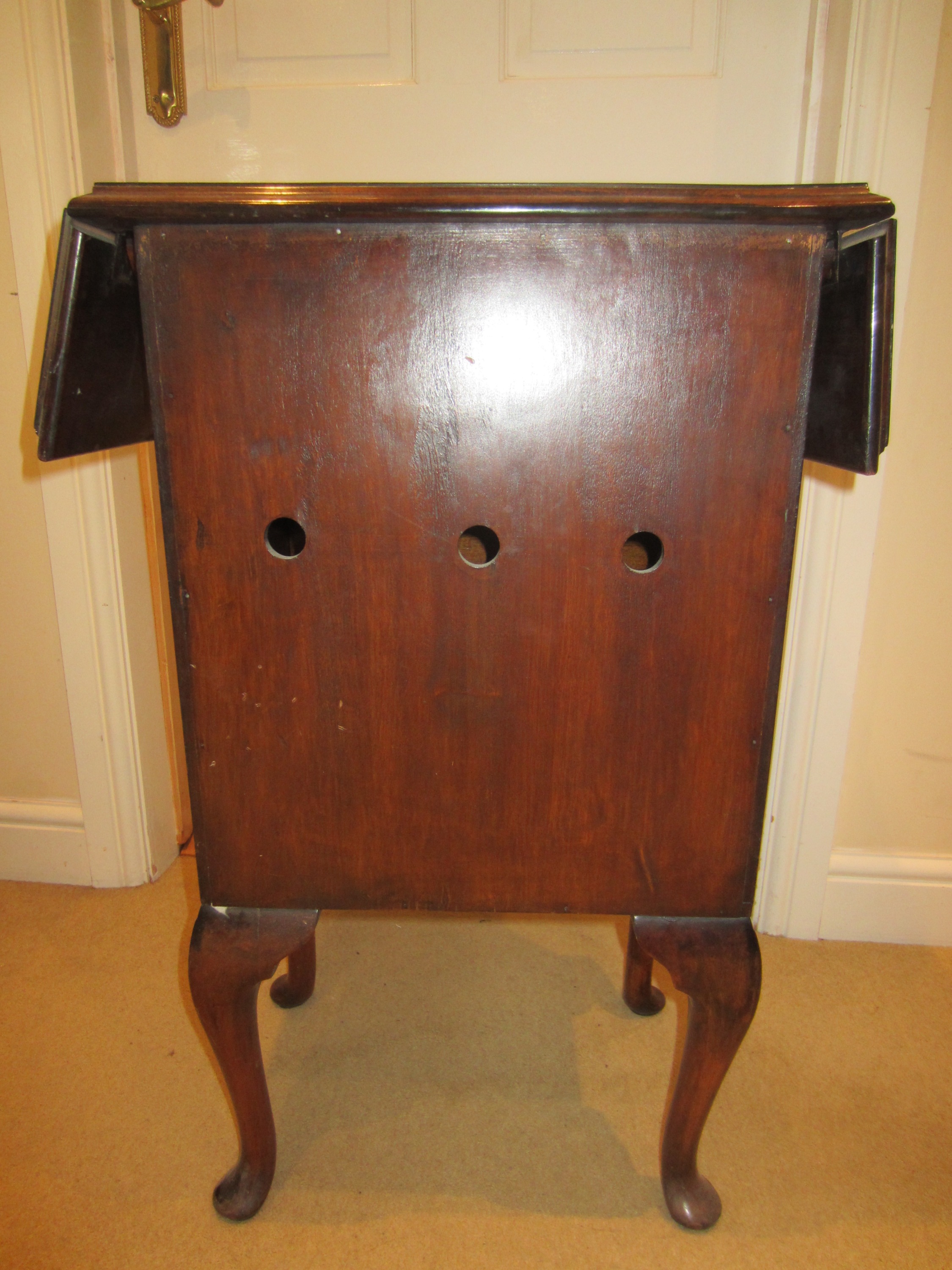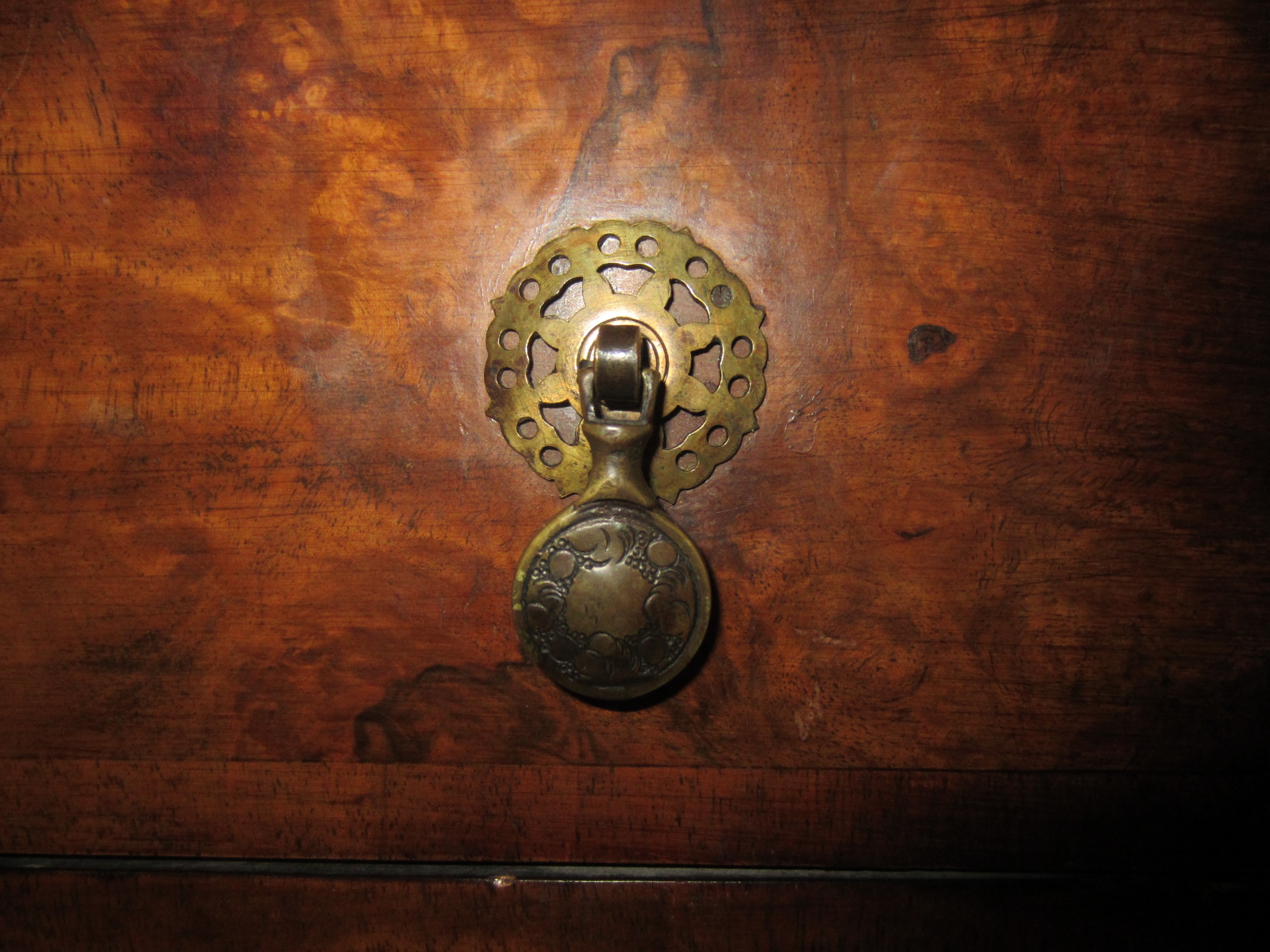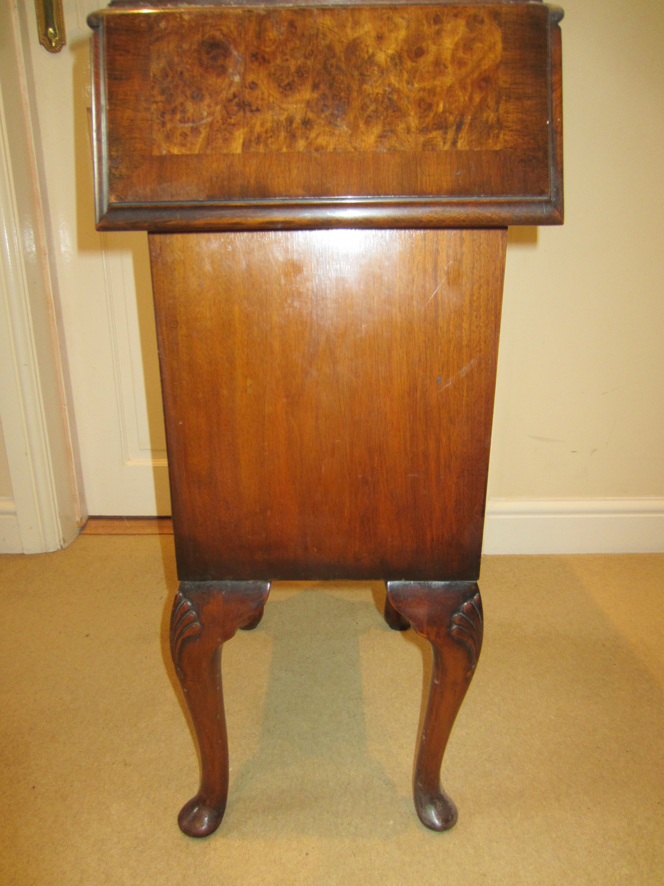 Figured walnut (I think) cabinet having shaped top with lift up ends above single draw and single door with brass tooled handles, the base fitted with cupboard raised up on four cabriole legs termination in scroll feet