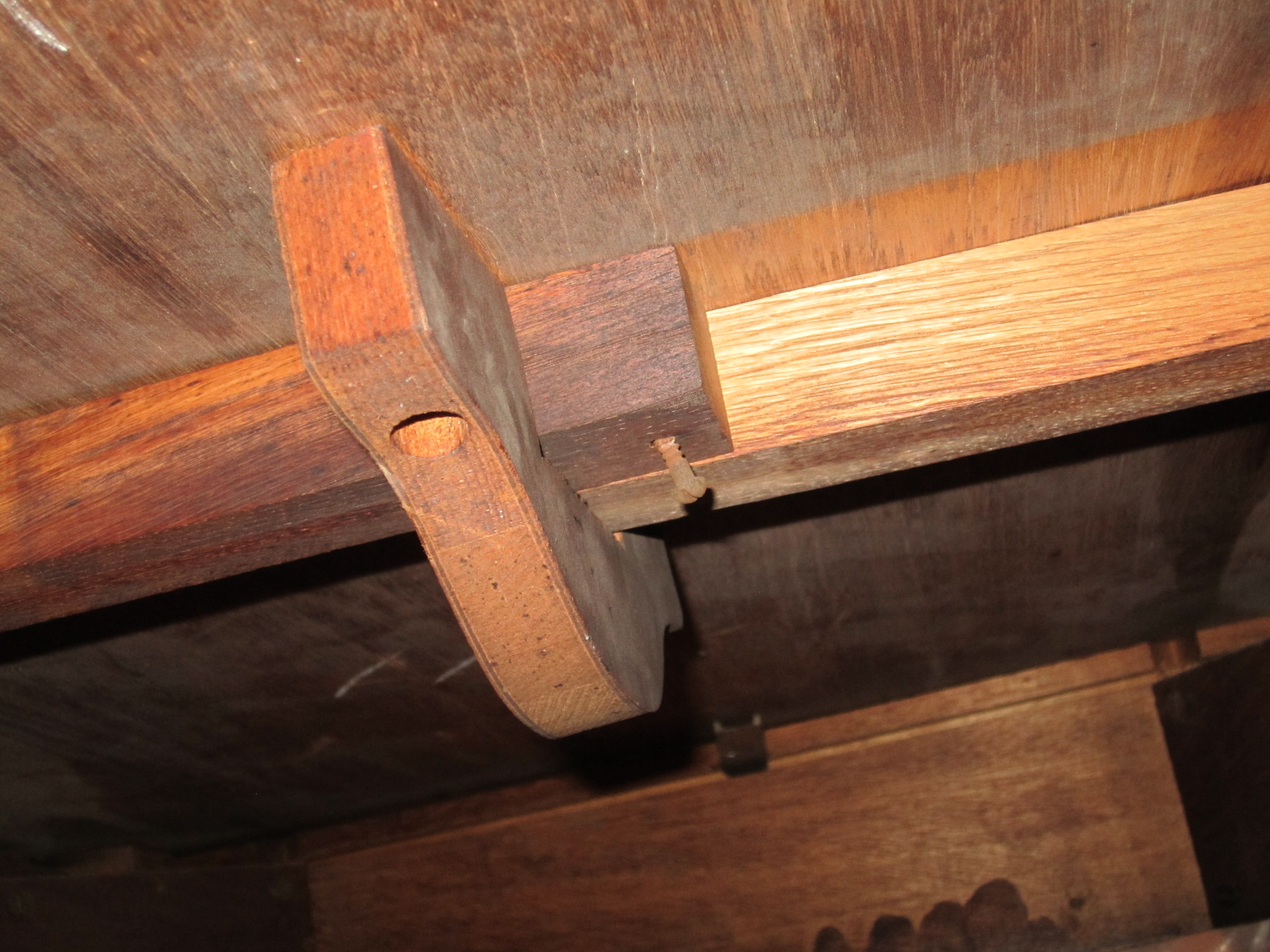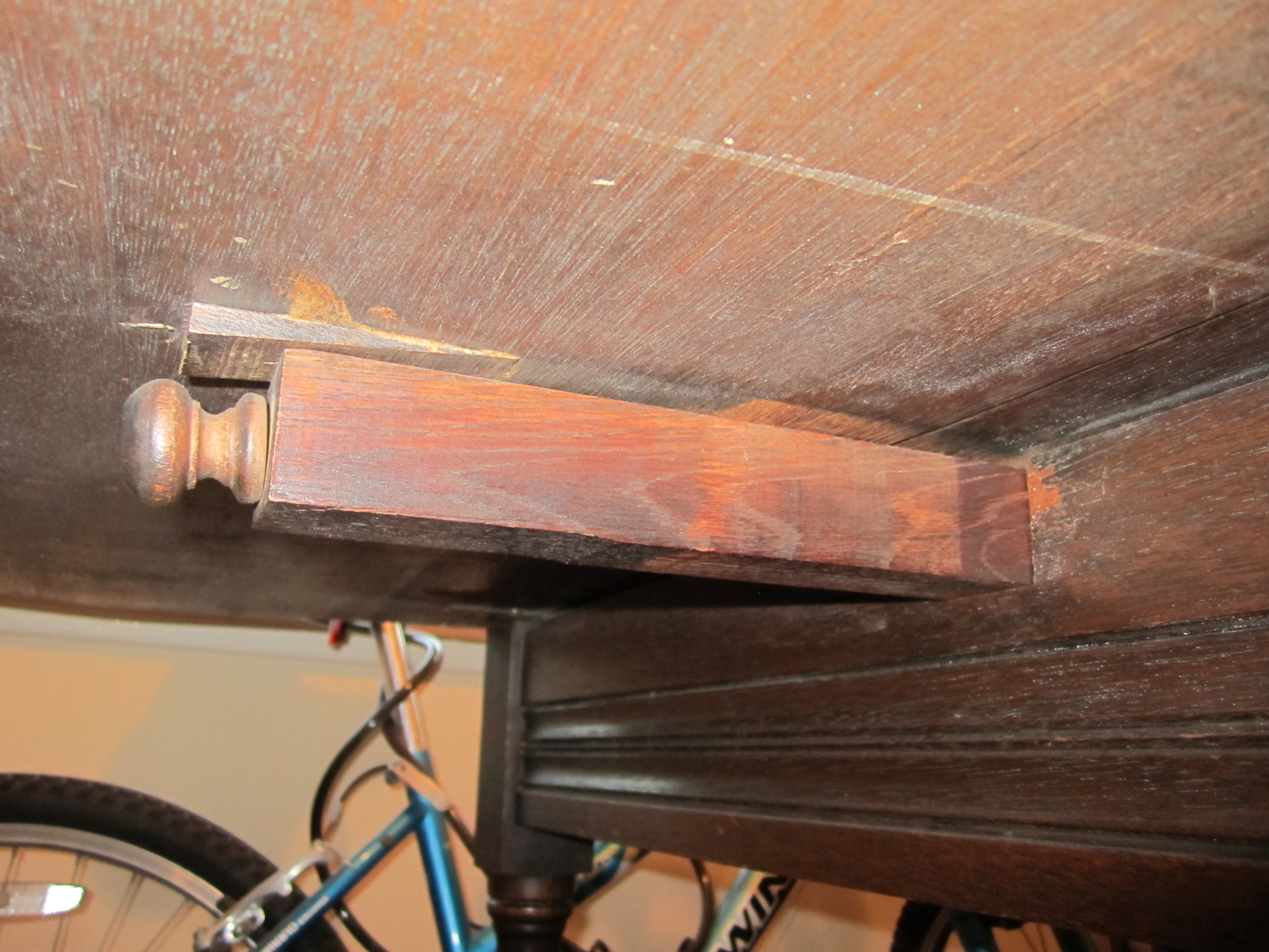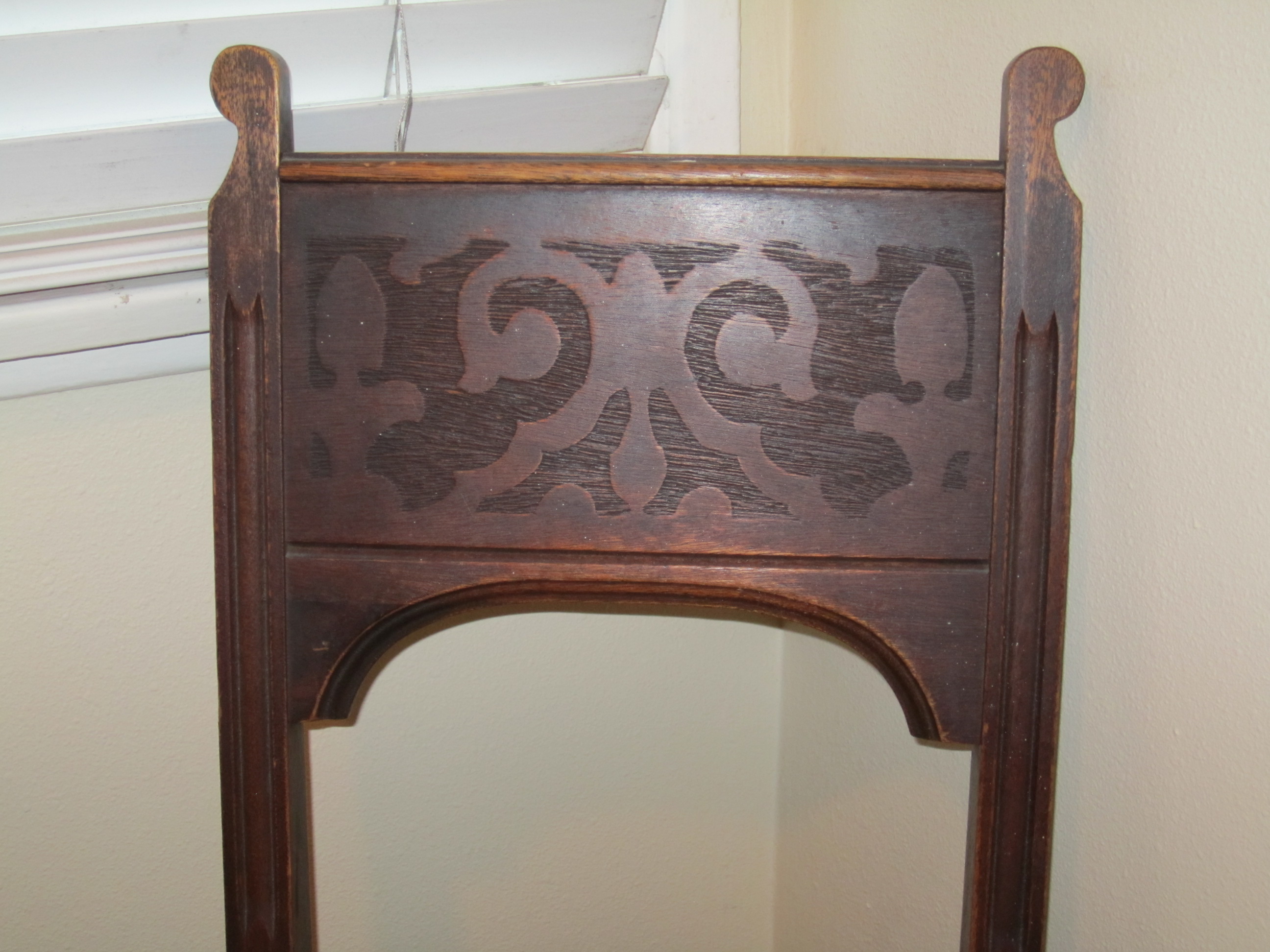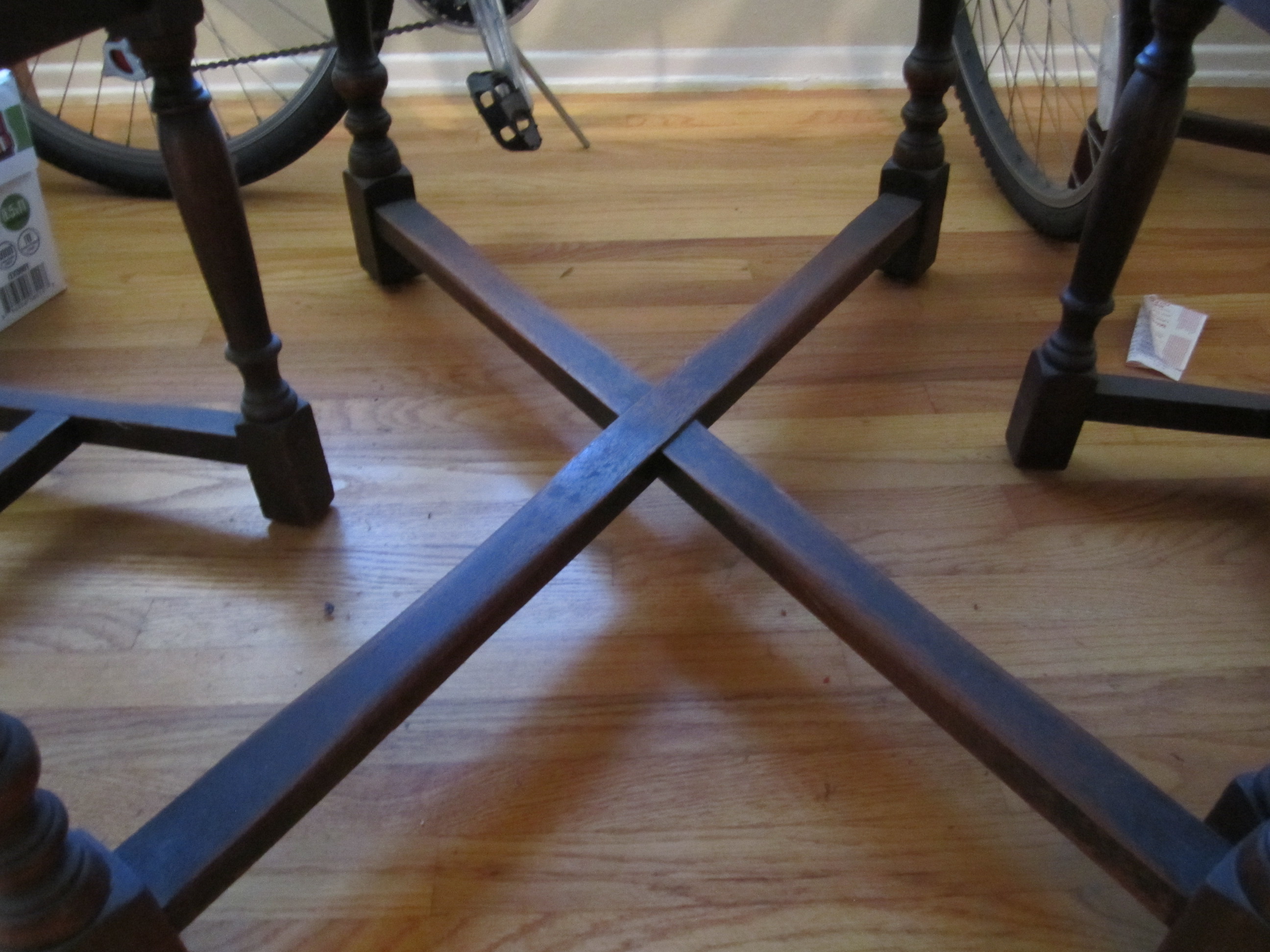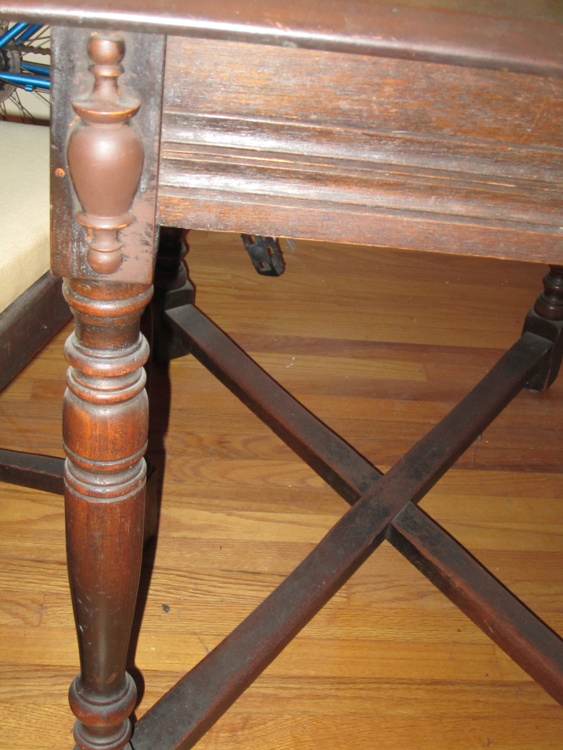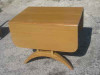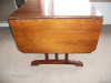 dining room table with 4 chairs. re-covered cushions. Drop leaf table with wooden pull out supports. Patterning on table border and front of chairs.