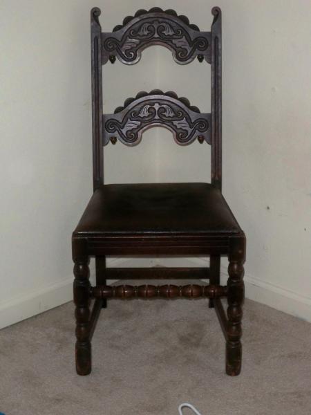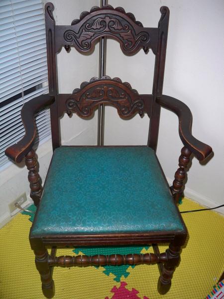 A very old and gorgeous table. This item was given to my sister by an elderly friend. The table has place for a leaf, but the leaf is not present. The mechanics to remove the leaf are still present and working. There was a matching hutch as well, but I no longer have that. There are 5 chairs remaining, one of which is a captain's chair. All pieces are very sturdy and extremely well made. The arms of the captain's chair are a little loose. The chairs were covered at some point with green fabric. I removed it from one of the chairs and found what looks to be original leather in awesome condition. There are no broken places, crack or repairs that I can find anywhere on the table or chairs. If you have any questions or need more information, please let me know. I wish I had more information, but I don't. This is a brilliant community of antique lovers and I look forward to your input. This is for sale in Houston, TX at my sister's home. Thanks so much!