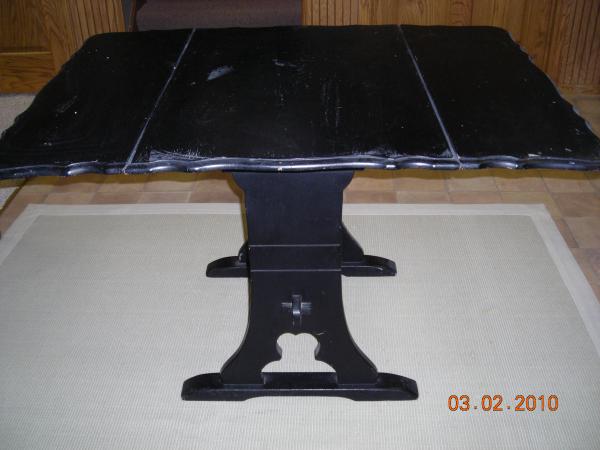 Drop leaf table, made of wood. 2 wood pull outs on each side to support leaves. It was painted black when I purchased the item.