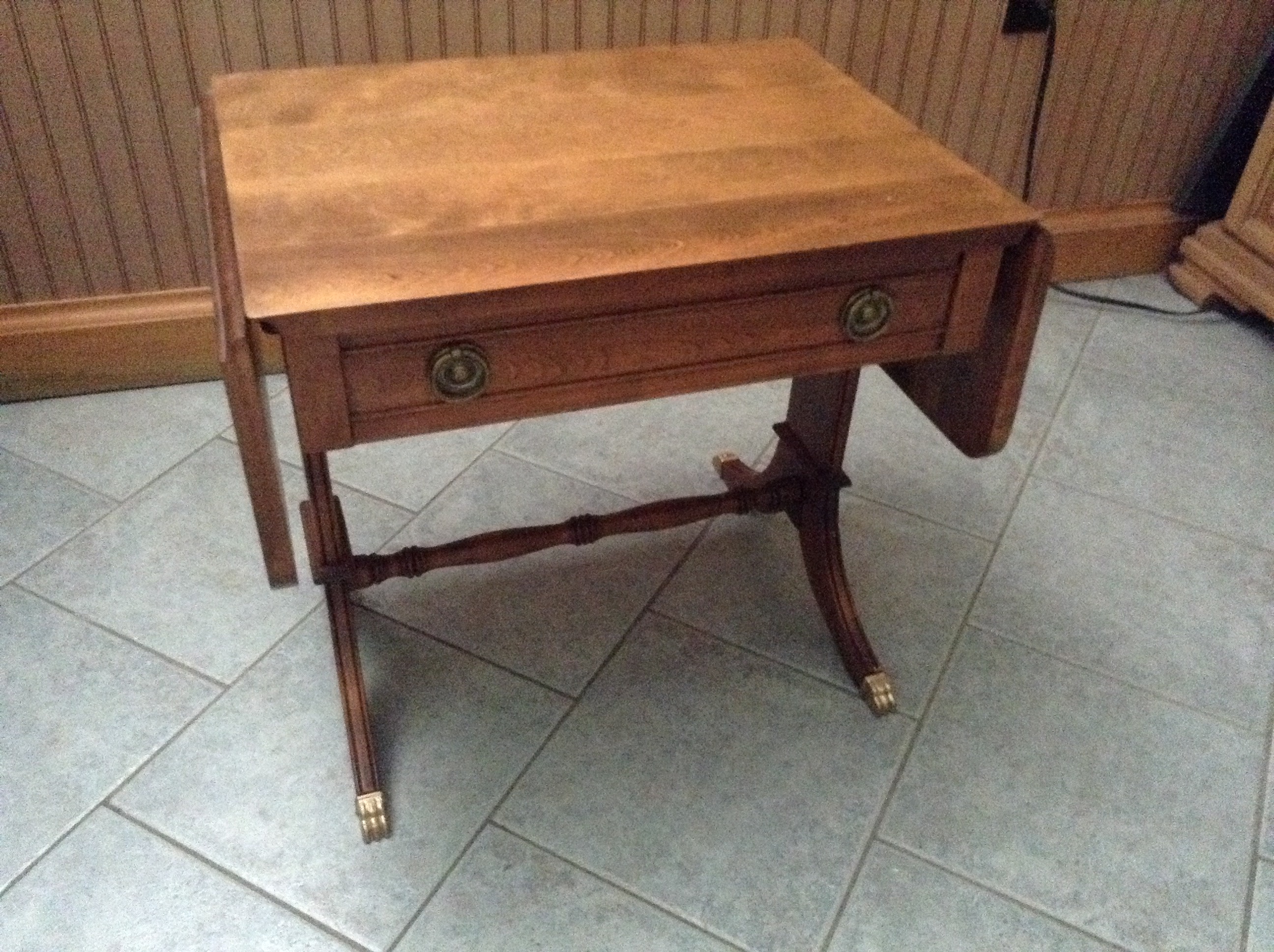 Small table the size of an end table with drop leaf. Has brass feet like a Duncan Phyfe. The top lifts up with a silverware chest nside