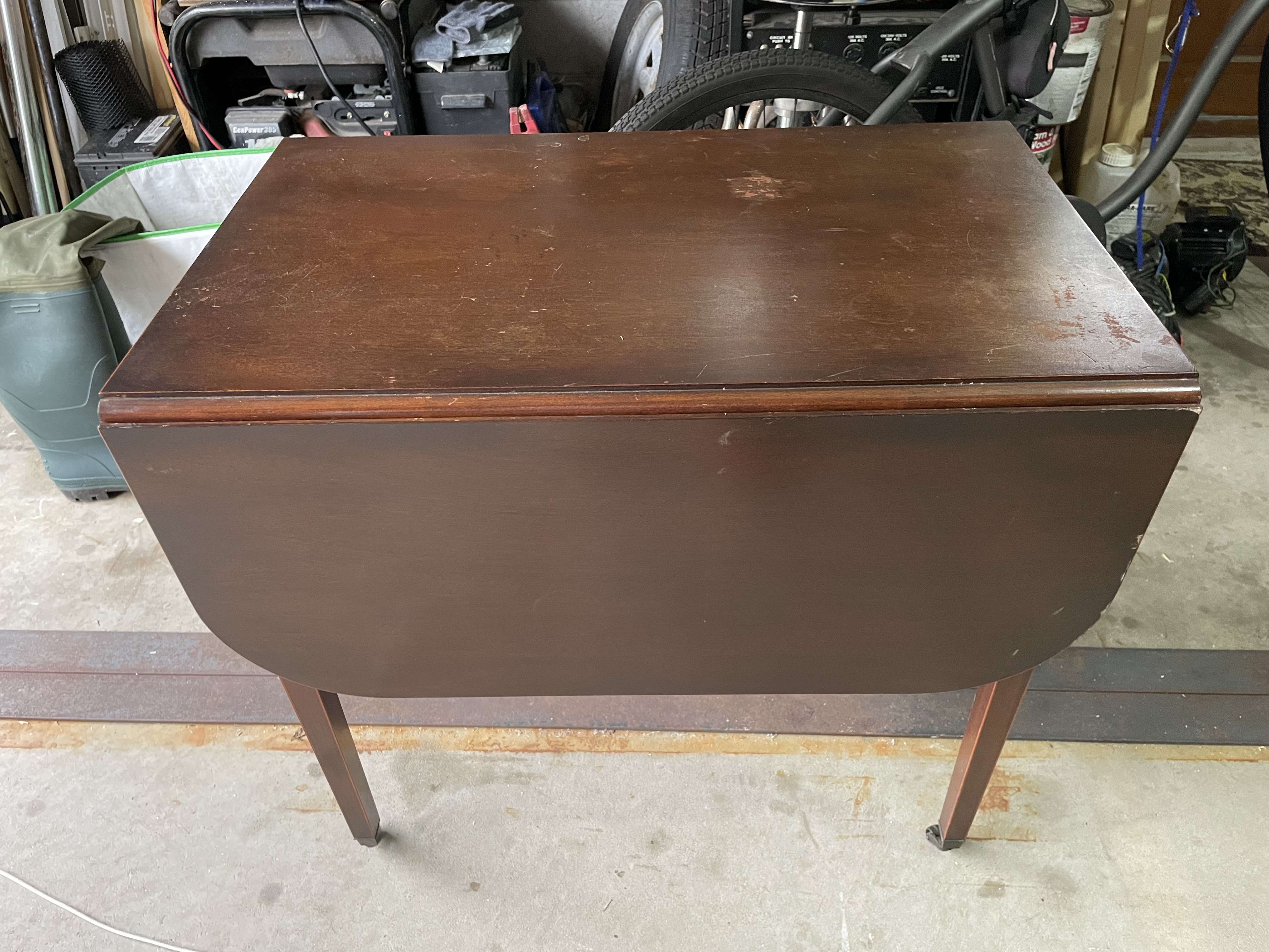 Brandt mahogany dropleaf table with wheels.