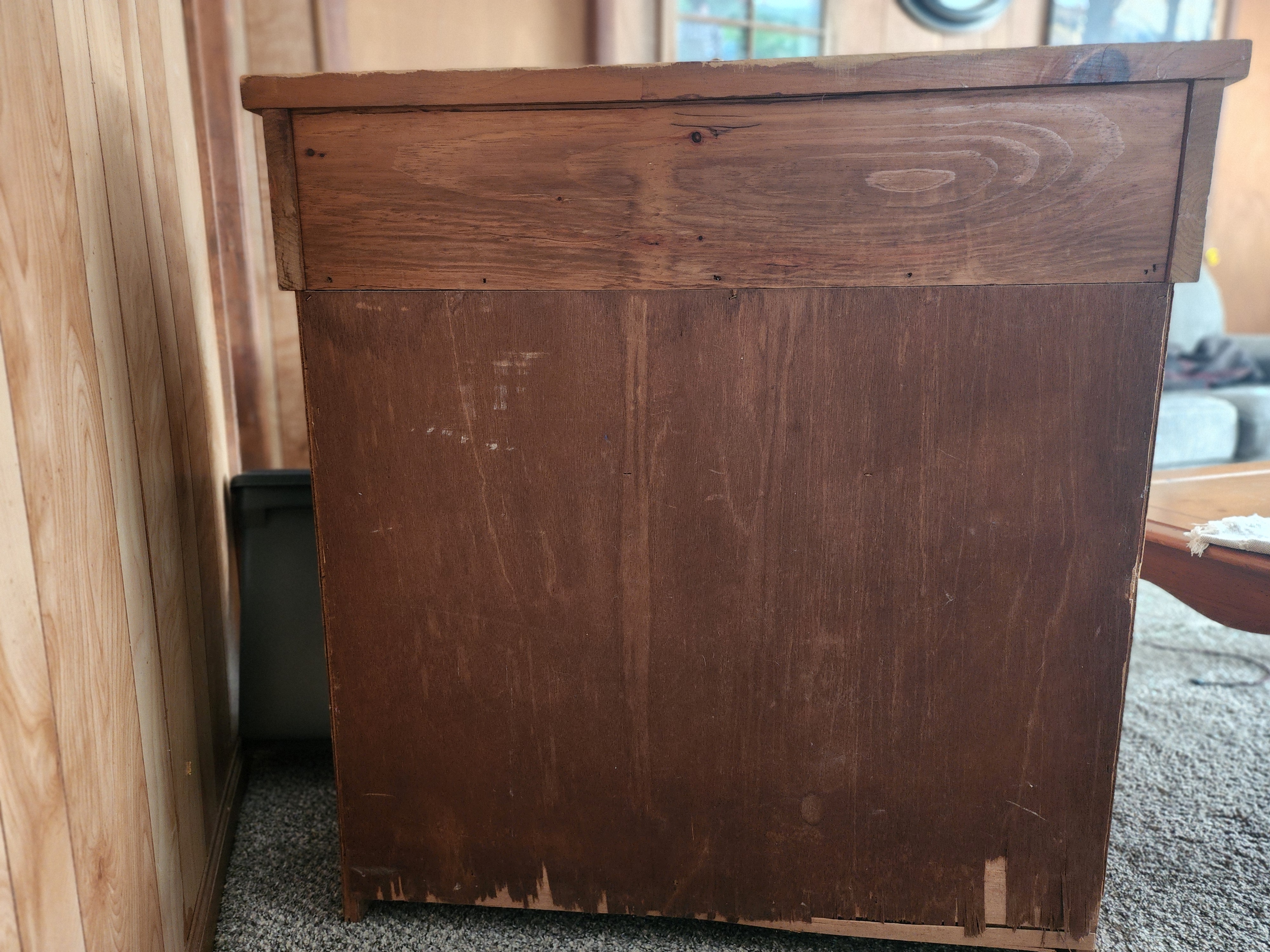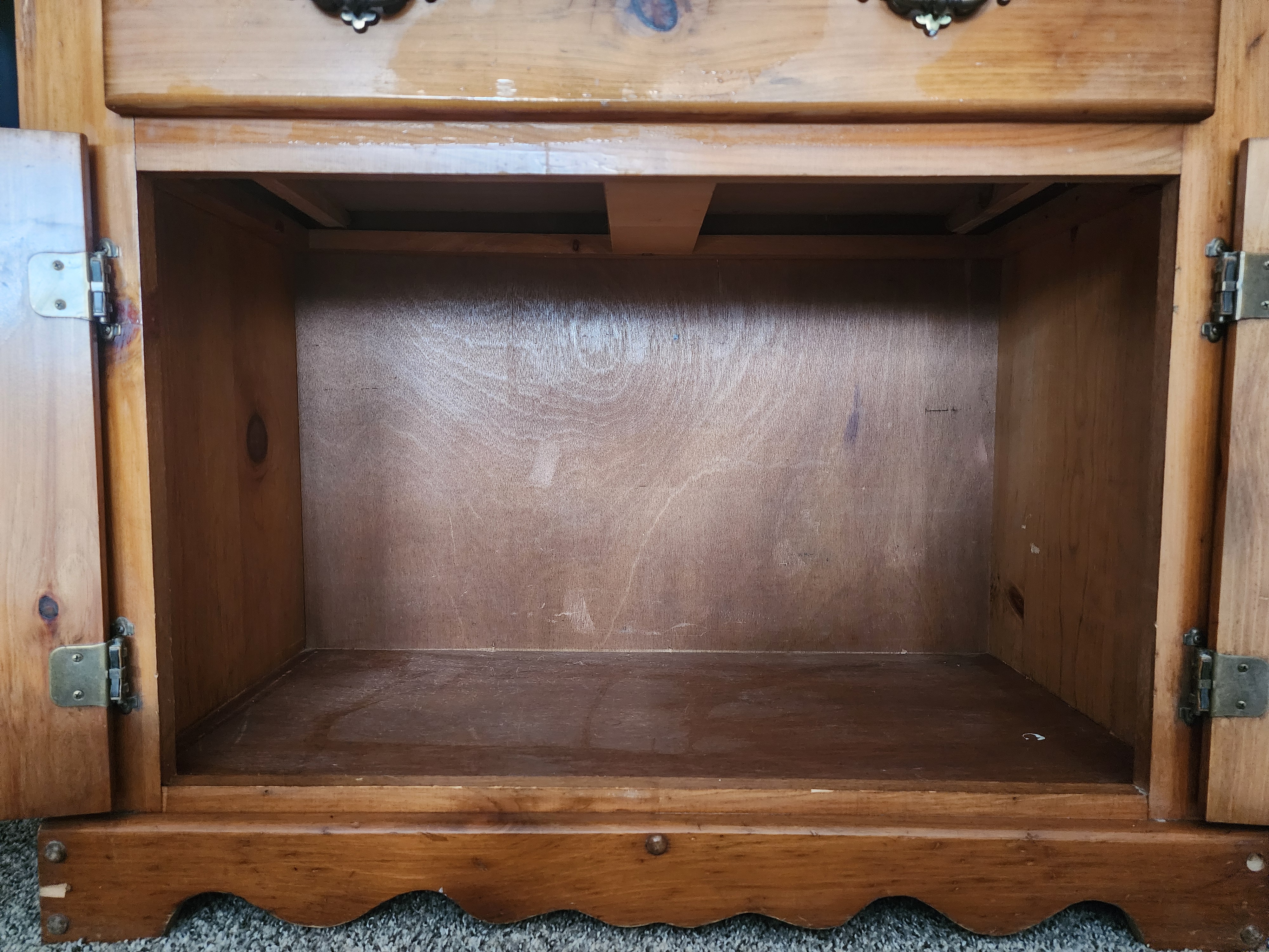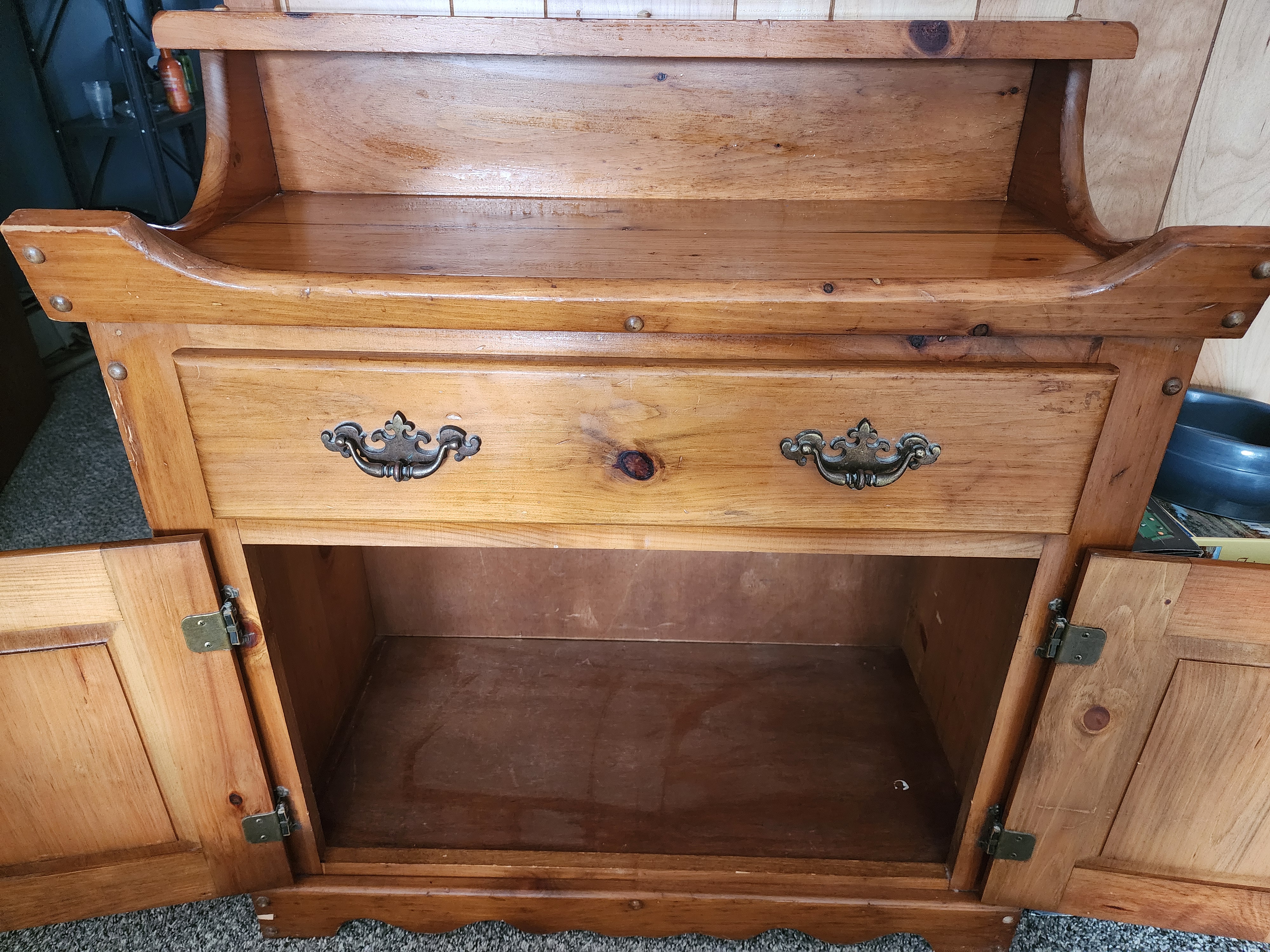 Description Antique, 1 large drawer and 2 cabinet doors. Wood pegs