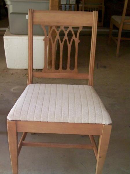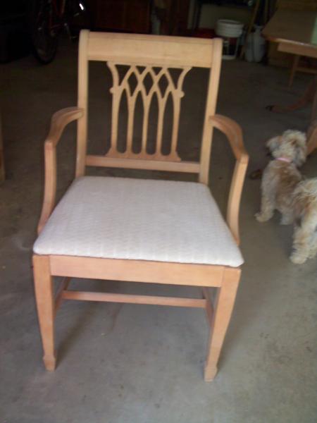 Unfinished except for table top. Upholstered chair seats with beige chenille.