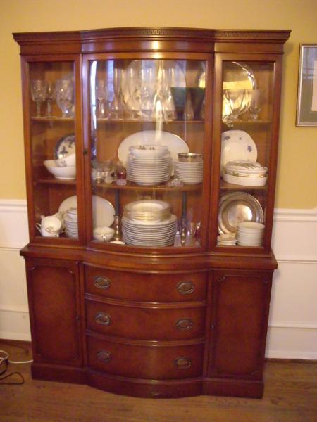 Grandma's dining room set in very good condition with the exception of the table which has some minor wear. I have the drop leave table, four chairs, two arm chairs, the china cabinet and a buffet. In addition, I have two leaves and all the accompanying table pads.