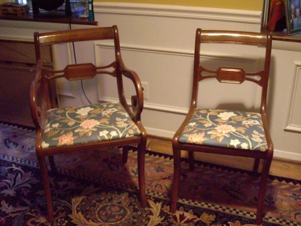 6 chairs, 2 with arms, covered in dark green waverly print fabric, original which is orange, brown and turquoise in underneath
