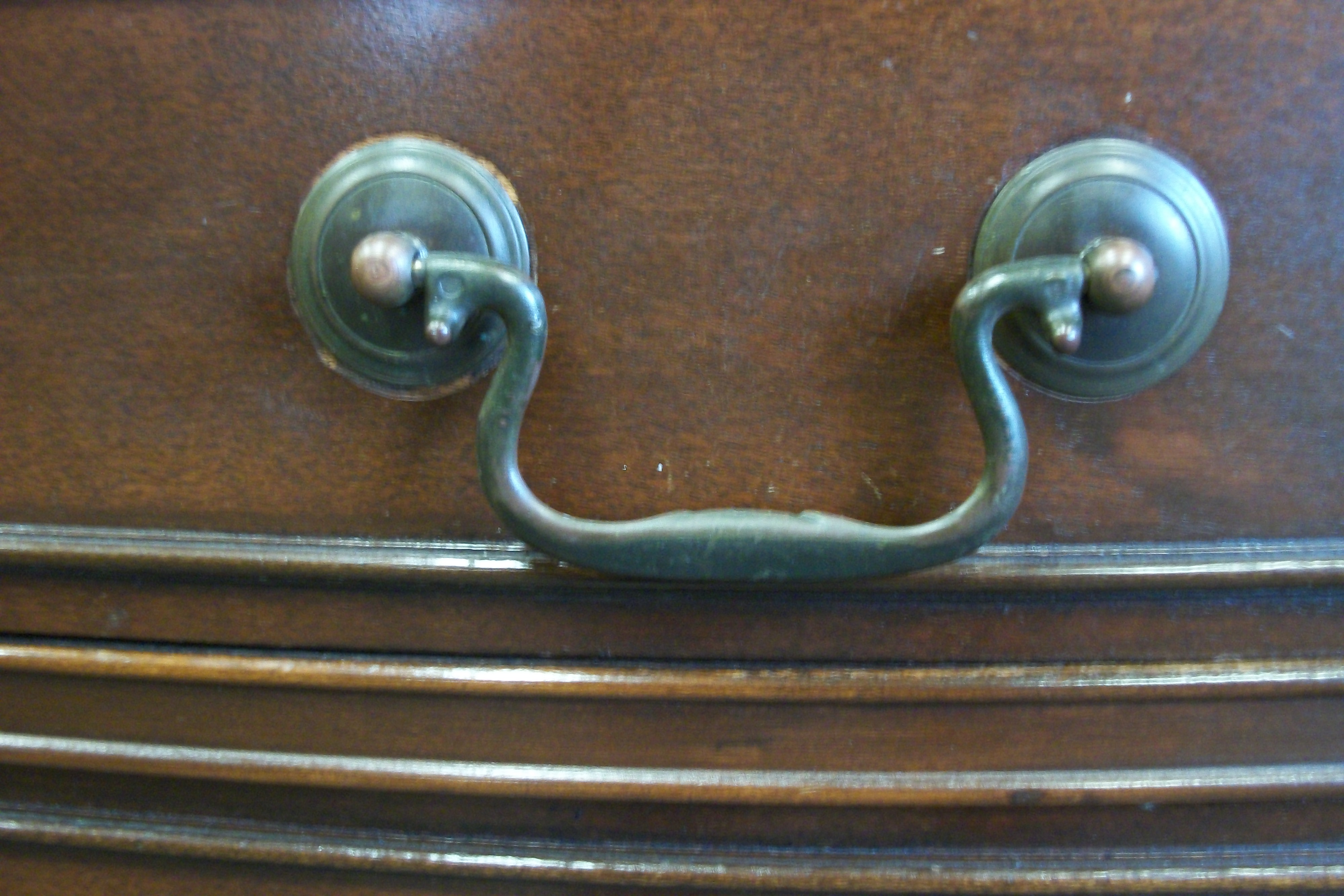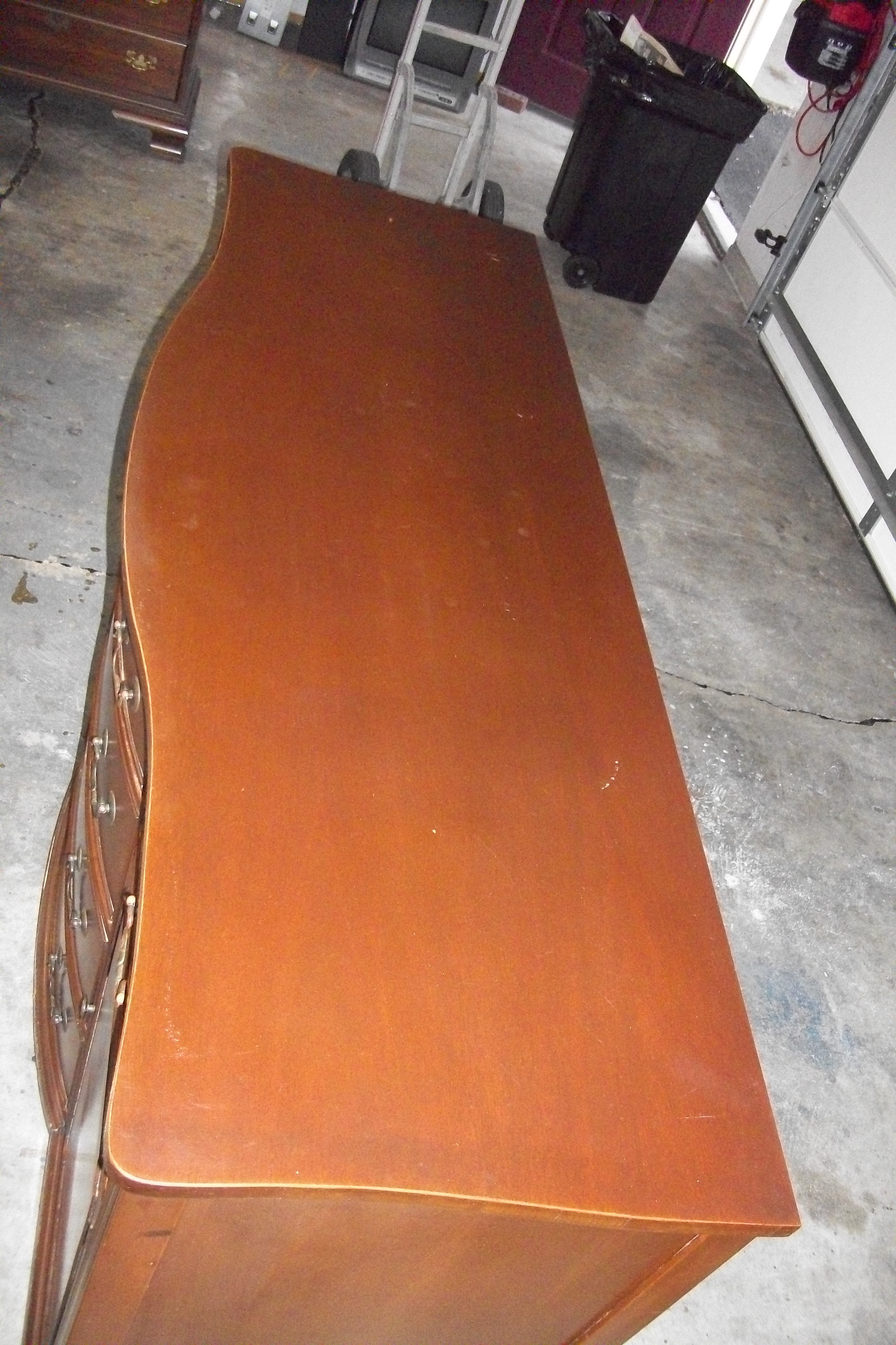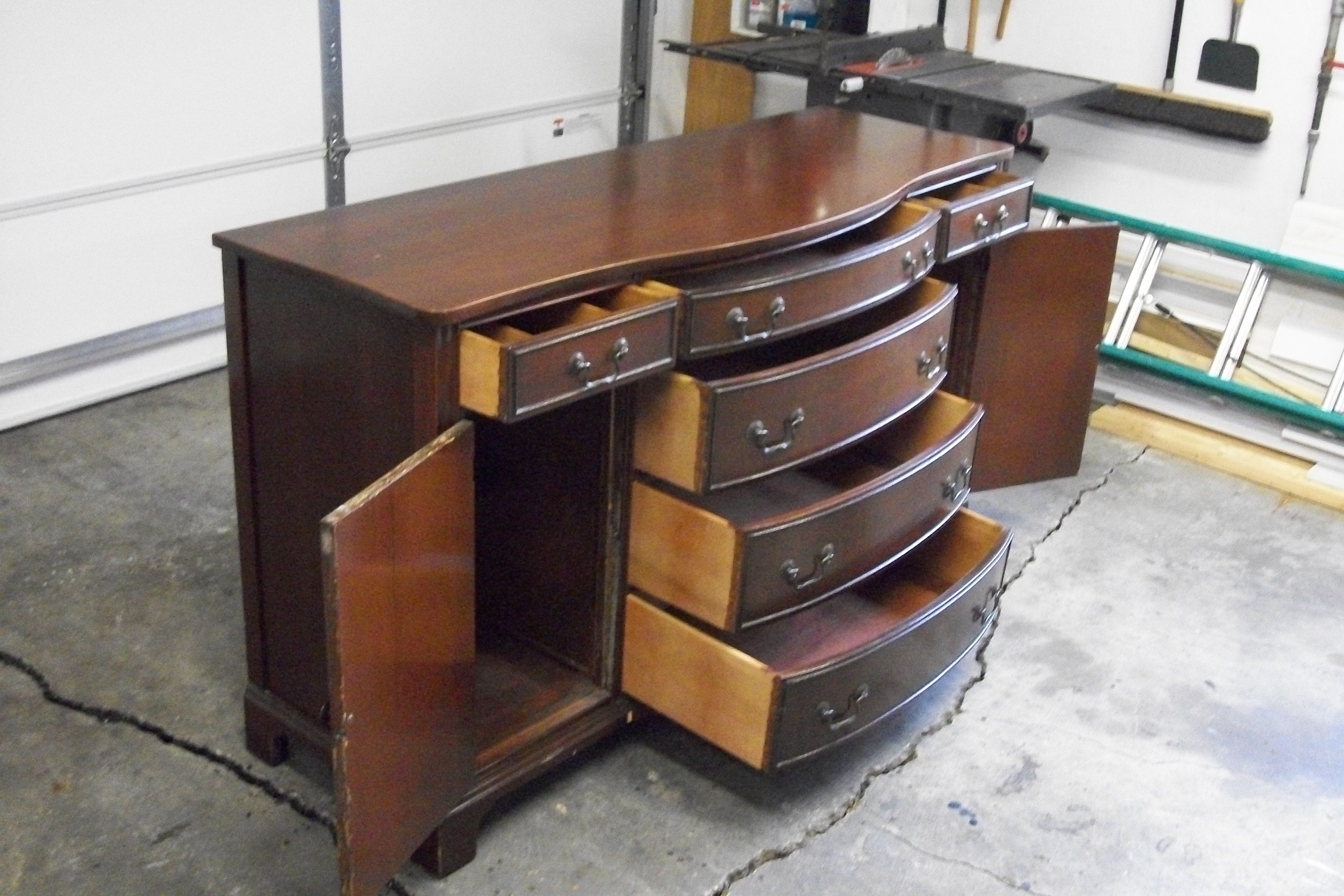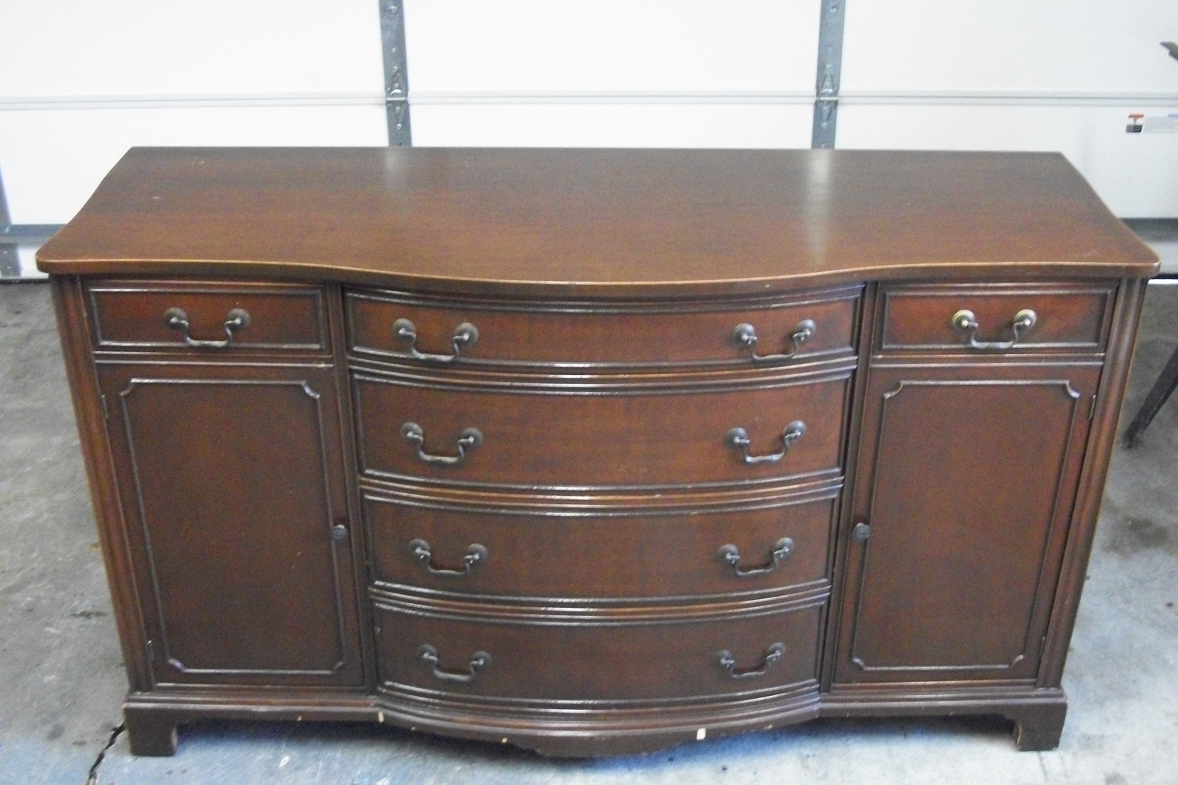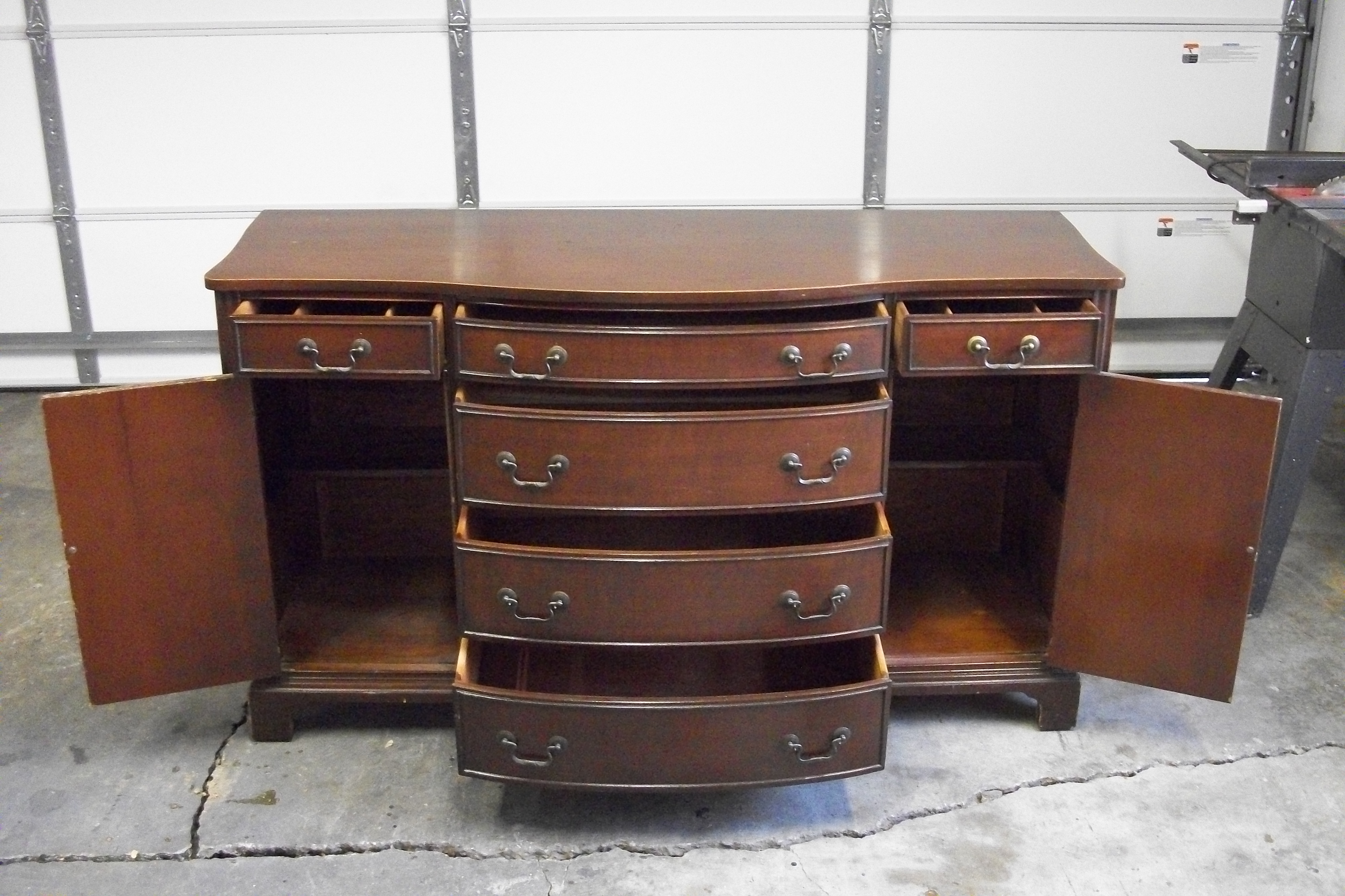 Duncan Phyfe "style" Buffet. Measures 62" wide x 21 1/4" deep x 35 3/4" tall. All drawers have dovetail joints. Outer drawers are lined with purple felt like material which looks original. Top is attached to backside by pocket screws. All screws are slotted throughout (none are philips). Backside is stamped 10.724-11 MAH. Who would have manufactured this? Approximately what year? What is value as is? Would it be beneficial for me to place stain over obvious knicks and bare wood, or is it more desirable as is? Anymore information would be helpful. Thanks!