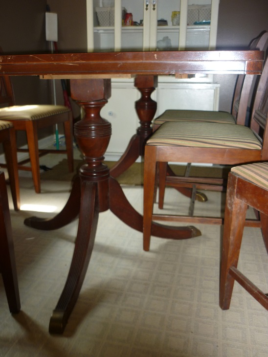 This set was given to me by someone who was about to just throw it out! When someone suggested to me that it may be a Duncan Phyfe set, I started to do some research. However, I cant determine a way to know for certain whether or not this set is genuine. It definately has some quality craftsmanship: it is heavy and sturdy. Unfortunately, I cannot find any markings. The table does not include a leaf, but looks like it did at some point. It has 2 pedistals which hold it up on either side with what looks like brass feet. The table top does have some scratches/chipping. The chairs are in wonderful condition. There are 6 total and one is a "captain's chair" with arms. The upholstered seats appear to be original with normal wear, but no damage (possibly some fading and a little thin around the edges from sitting). All 6 chairs are extremely sturdy with no damage that I've noticed. There are no markings that I can find, just some chalk numbers scribbled underneath the table top and chairs, possibly to match the pieces during manufacturing?