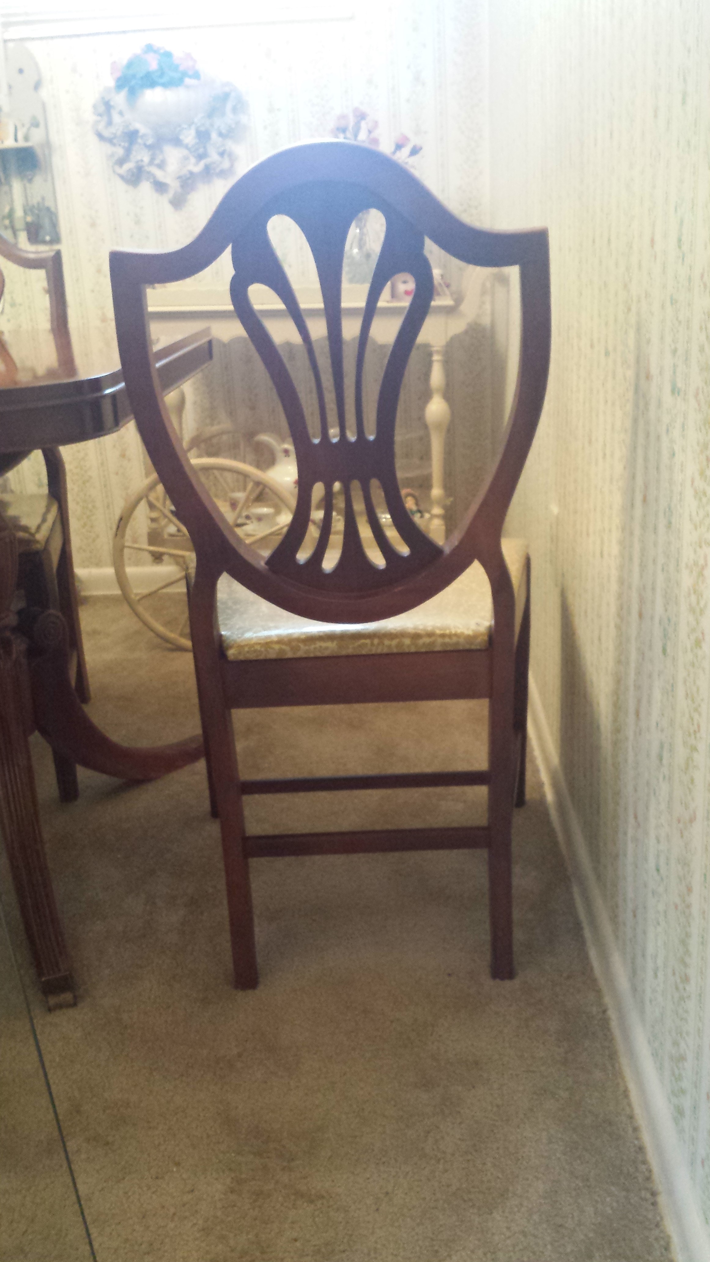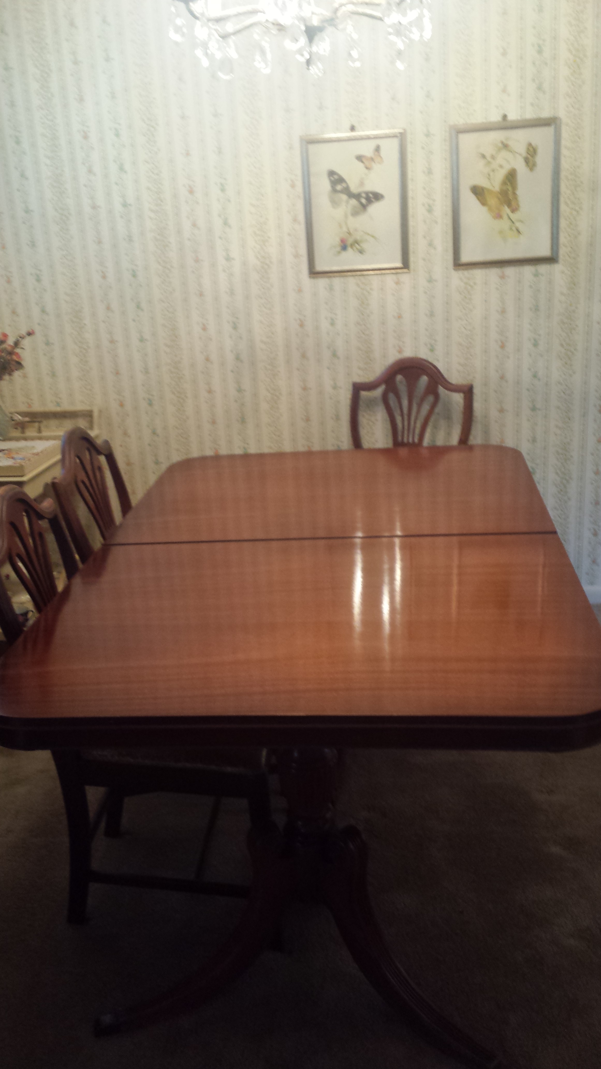 Hi I am interested on what specific set this is? It was my grandmothers. We know it is Duncan Phyfe but I'm struggling to find the exact match online. It is a mahogany table with six chairs. The chairs were originally cream colored but were reupholstered and plastic covered (does that drop the price? Probably. I don't know)