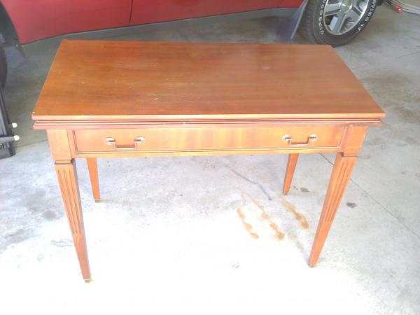 One end has two drawer pulls, making it appear like it has a drawer on the end, but it does not. It would also make a great table for putting up against a wall with a vignette of antiques or pictures, etc. It is made well and needs no work, as it is sturdy and has been well cared for.