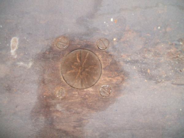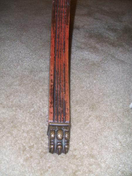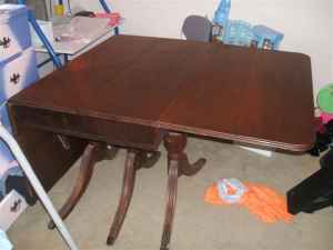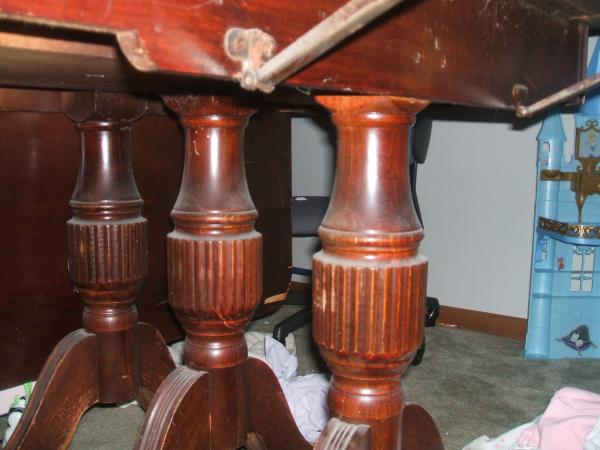 this table was given to me and i know nothing about it. it seems to be mahogany in color. it has 3 pedestal legs with 2 feet on each leg. it came with one leaf that is in really bad condition but the table itself is sturdy and well built. i think it might hold 2 leaves. the feet are covered with brass. it does have a curious mark in the center of the inside of the table which you will see in the pictures.