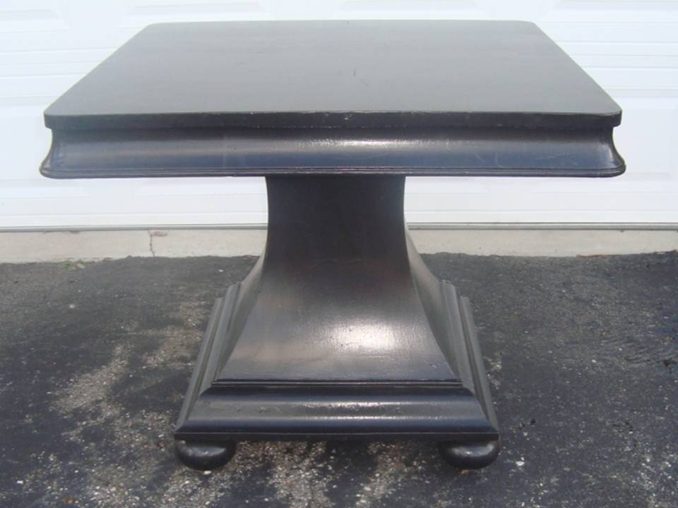 This table is solid mahogany with beautiful wood grain. It was painted black to update it for home staging. There are a couple of irregularities on the bottom of the base and table top edges, but the table top and sides of the base are in excellent condition.