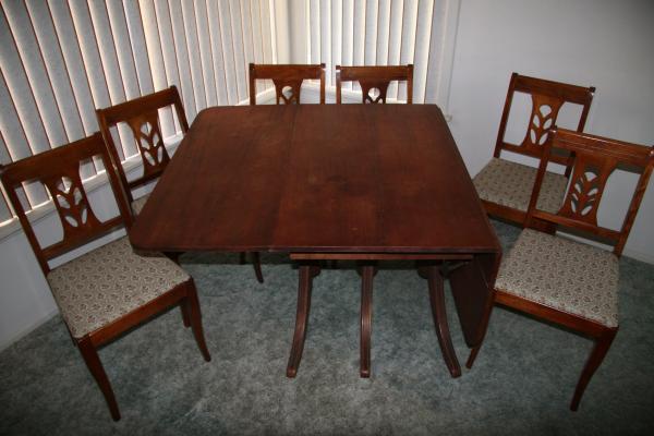 Duncan Phyfe Style Drop Leaf dinning table and six (6) chairs manufactured by Phoenix Chair Company circa 1940.