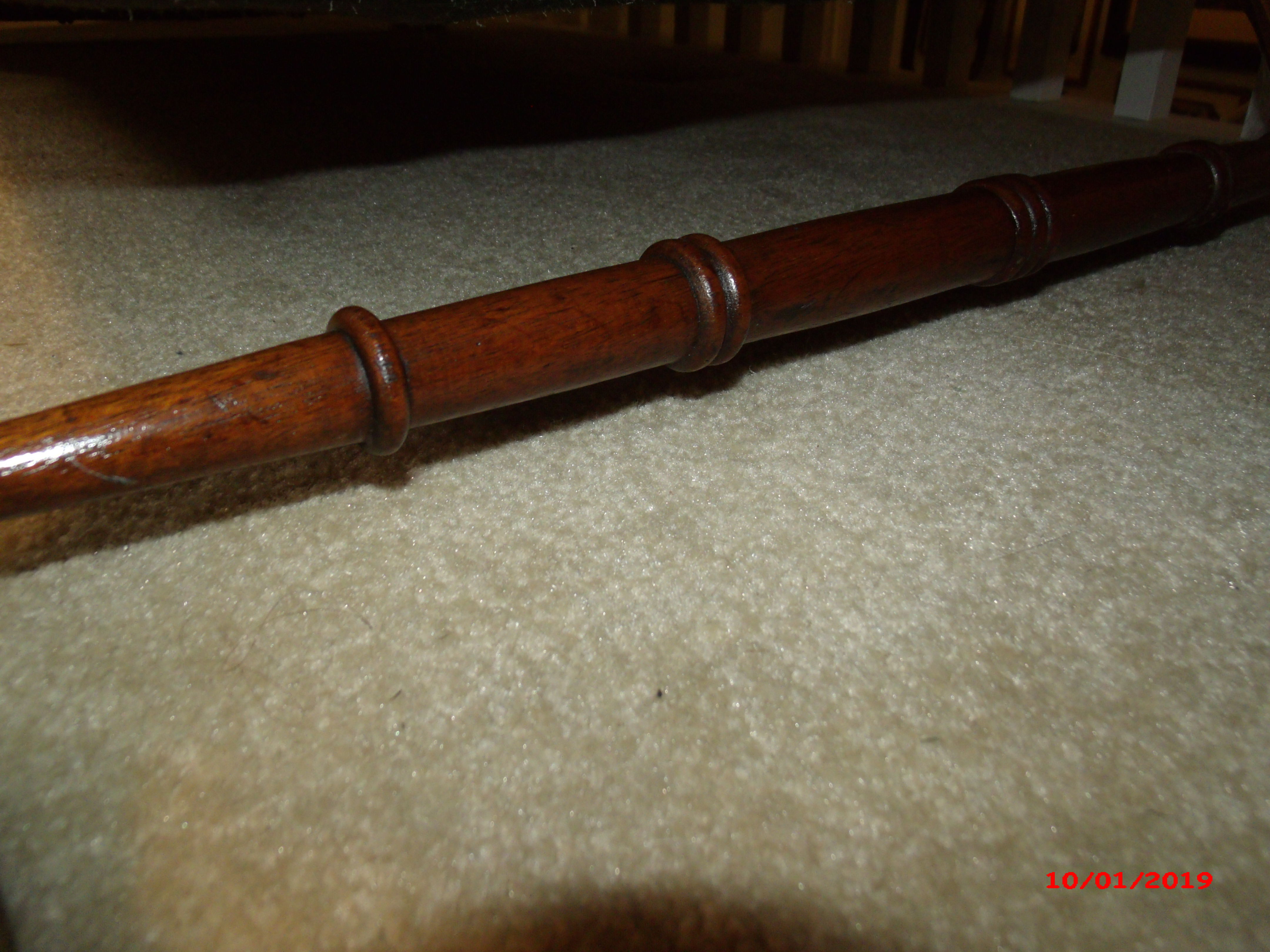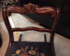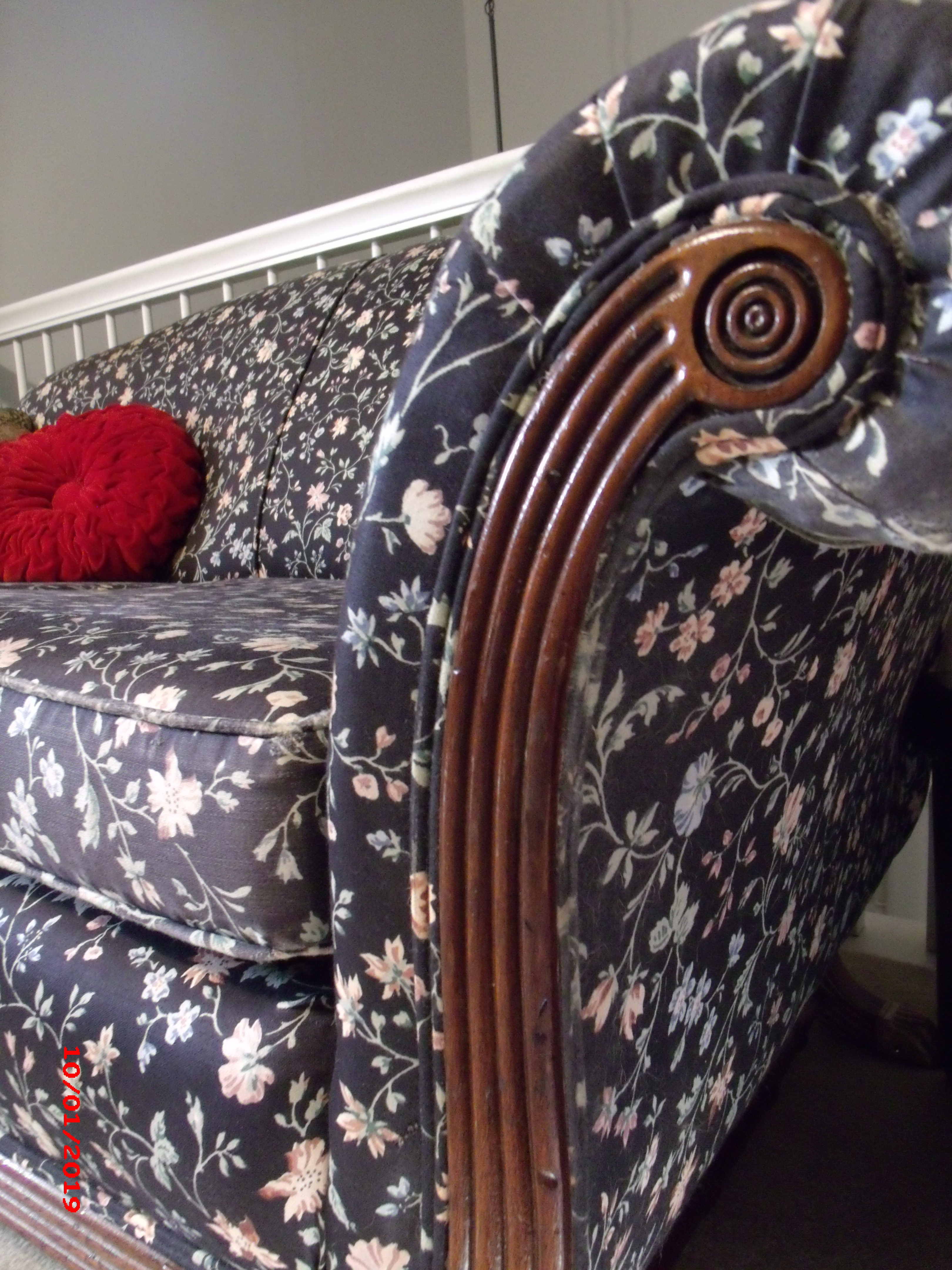 It was purchased in Kentucky about 40 years ago & has been in use since. The uphostery when I obtained it was a beige brocade, but was reuphostered in the black floral print shown in the photos. The photos also show the wood slightly lighter than it is in person. At a glance, it looks very dark brown but close-up you see the gold undertones & dark vein streaks. The grain looks more like Mahogany but I don't know that much about wood. It doesn't appear to have been restained & I've just used regular polish.