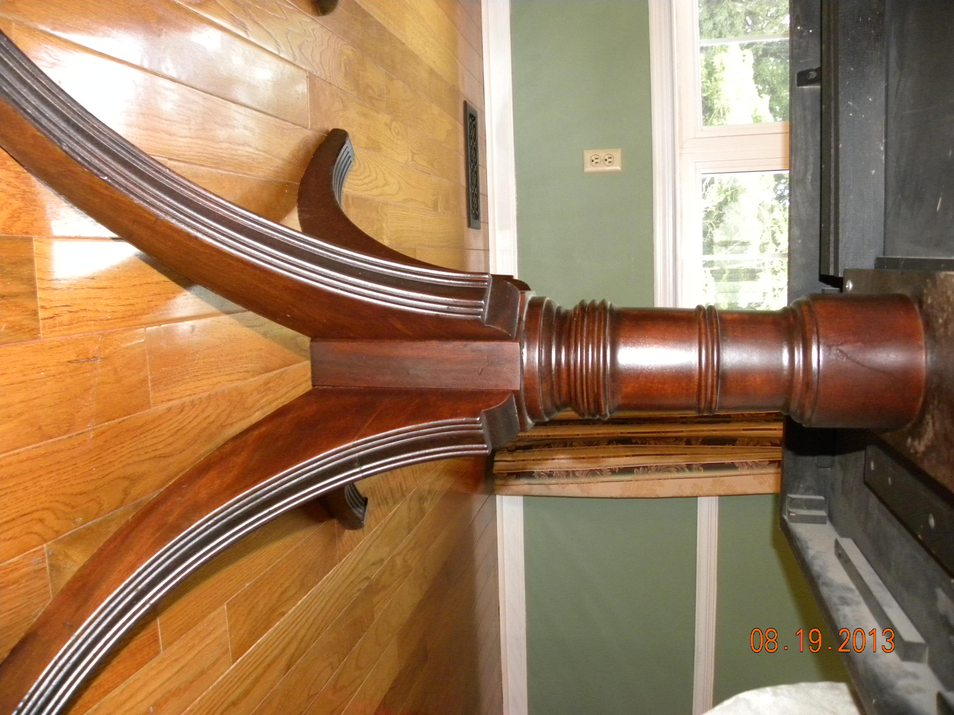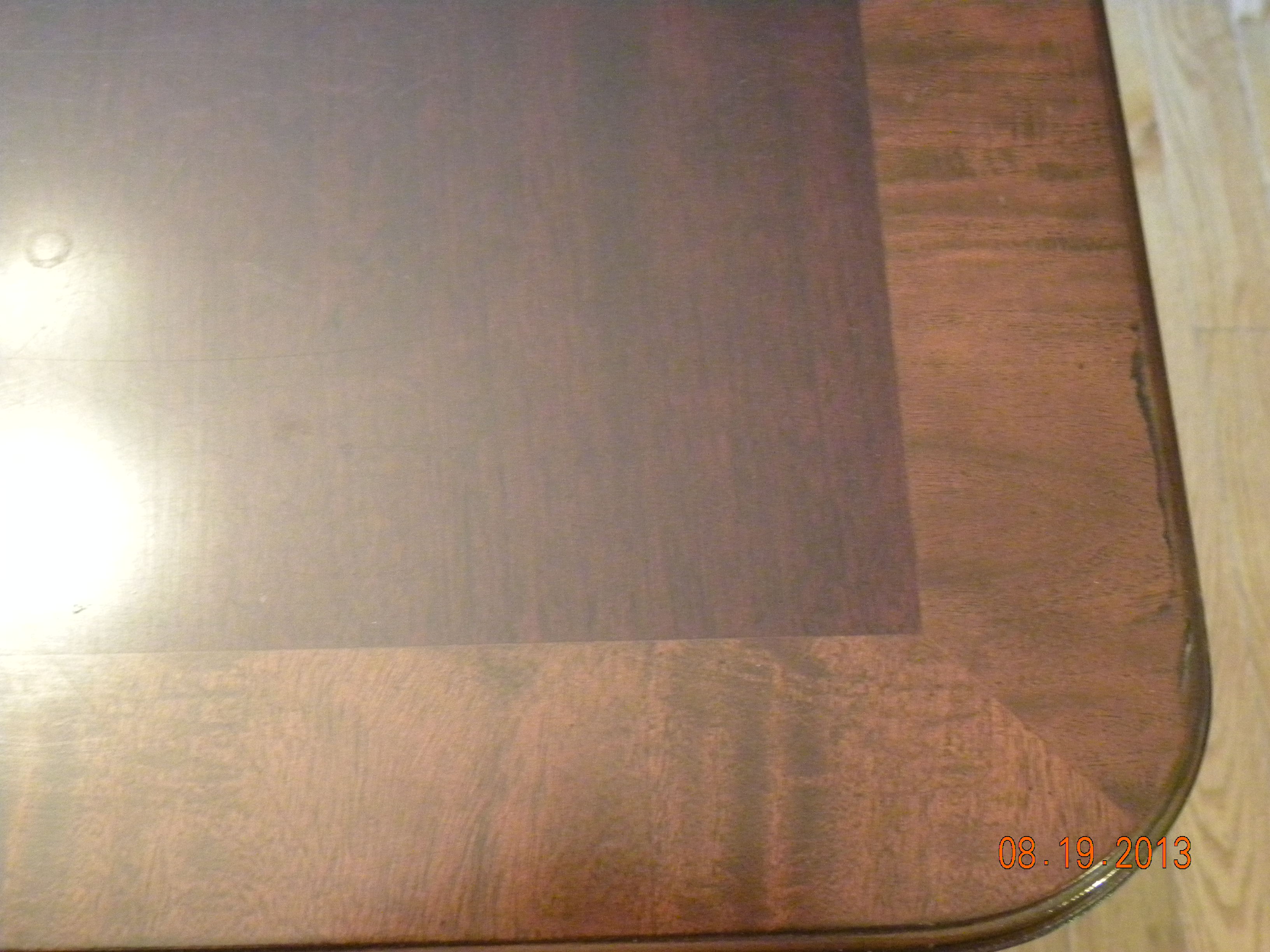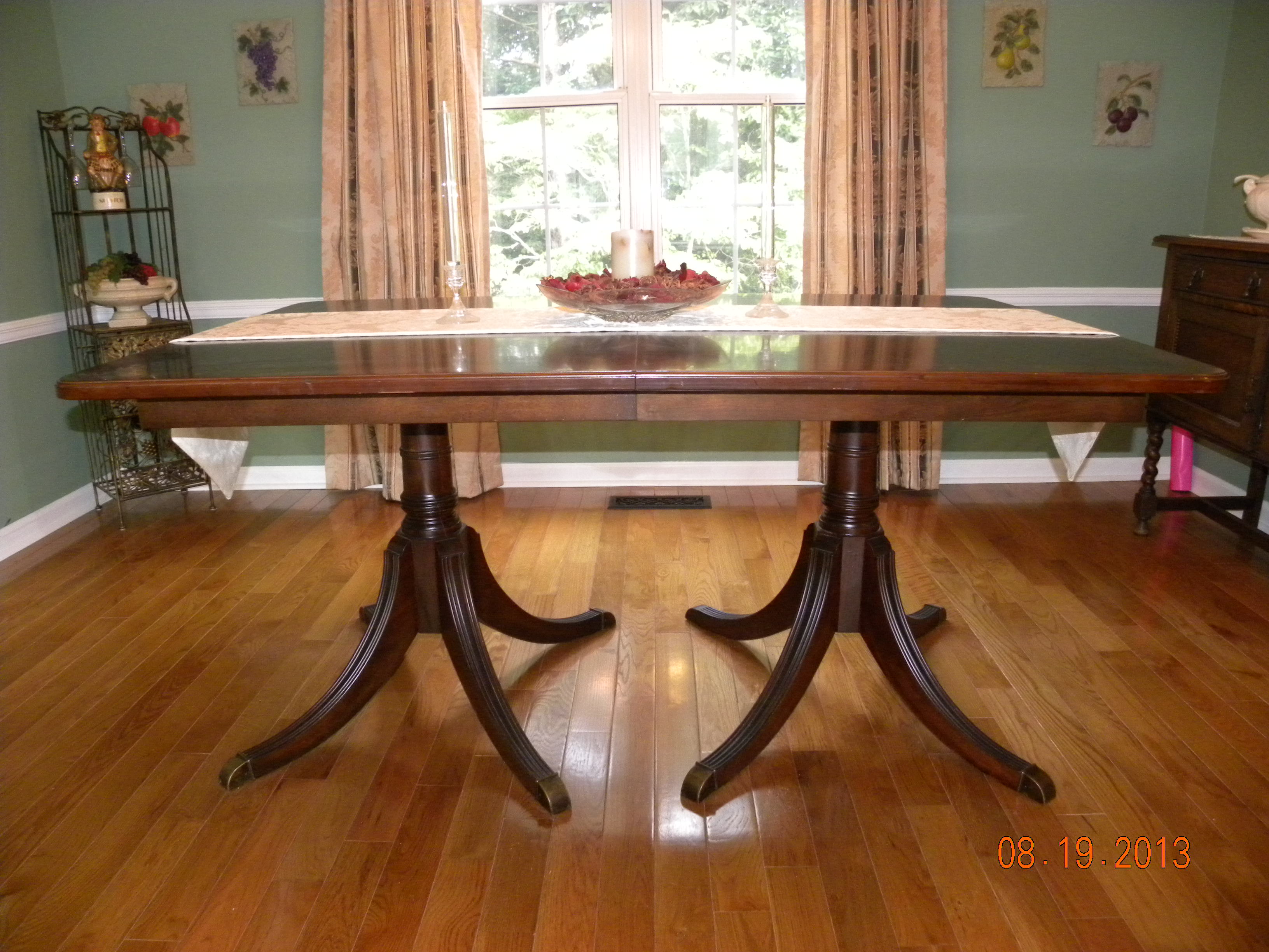 I have a Duncan Phyfe dining room table without the chairs. The table has a place for a leaf, but I have never had the leaf. The table has rounded edges the entire perimeter of the table is banded in a lighter wood. It is in good condition.