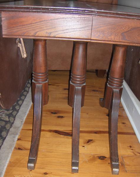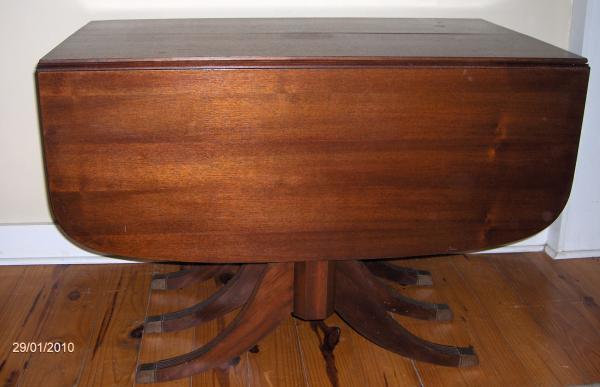 Description Duncan Phyfe style, walnut, drop leaf table. Three pedestals with brass capped feet. Beautiful finish; excellent condition. Overall size -56" long by 42" wide. Would love to learn anything I can about this table - period, value, etc.