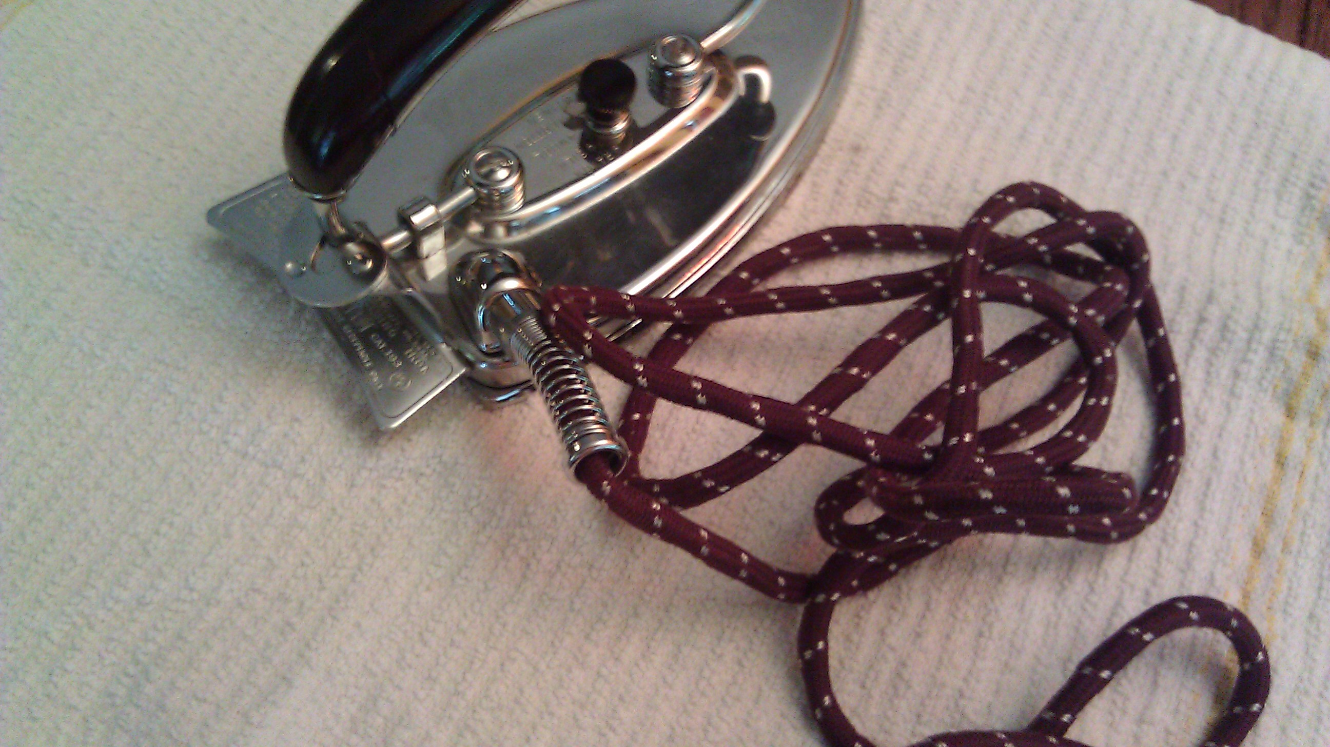 Durabilt Fully Automatic Folding Iron, made by the Winsted Hardware Mfg. Co. of Winsted, Conn. Catalog No. 193 Unit works, is in excellent condition, looks brand new, including the cord, storage bag. Box is yellowed but in good condition. Comes with storage bag, guarantee and a card that says "You are now the owner of a fine iron..." Works on AC current only.