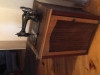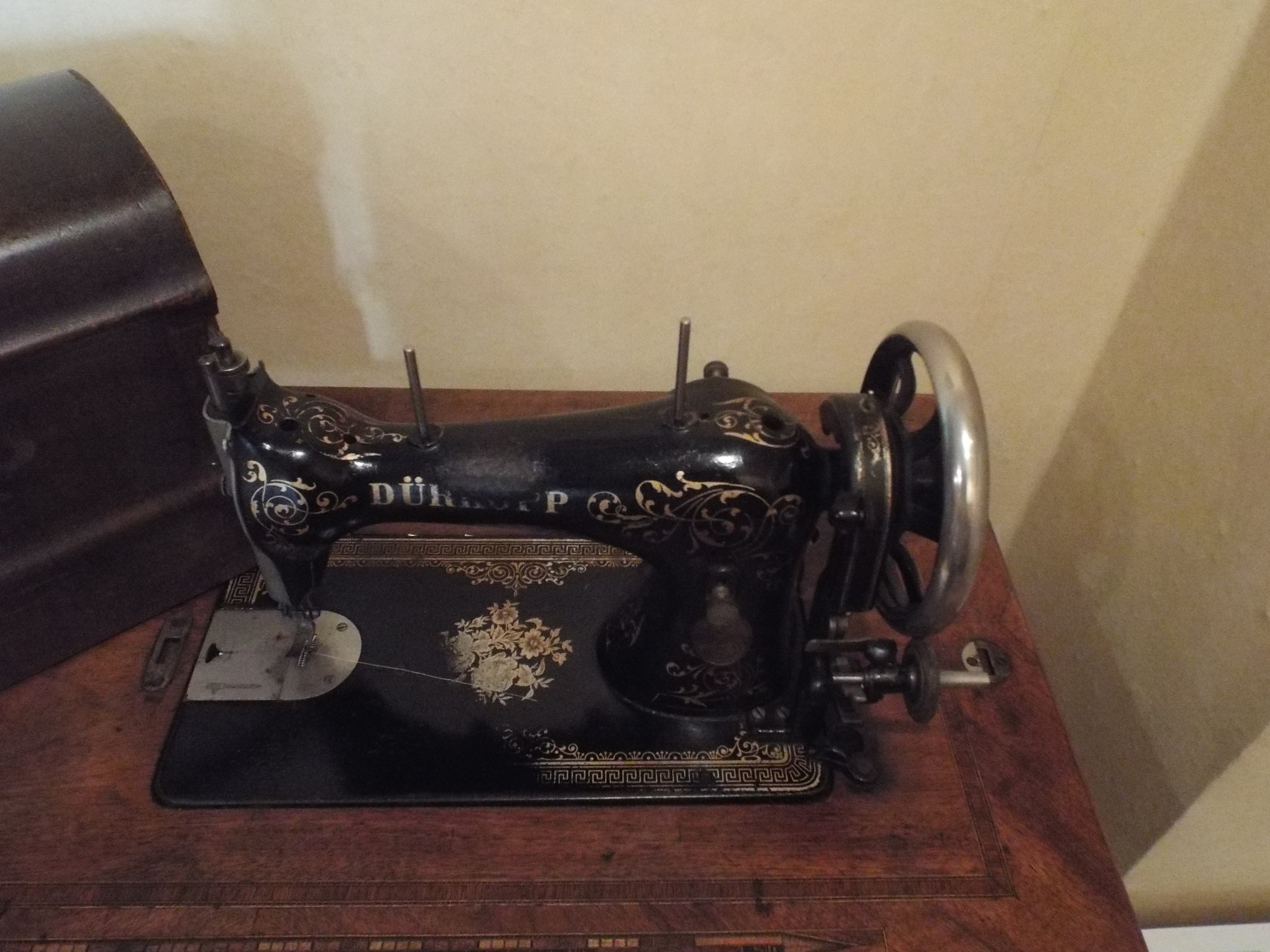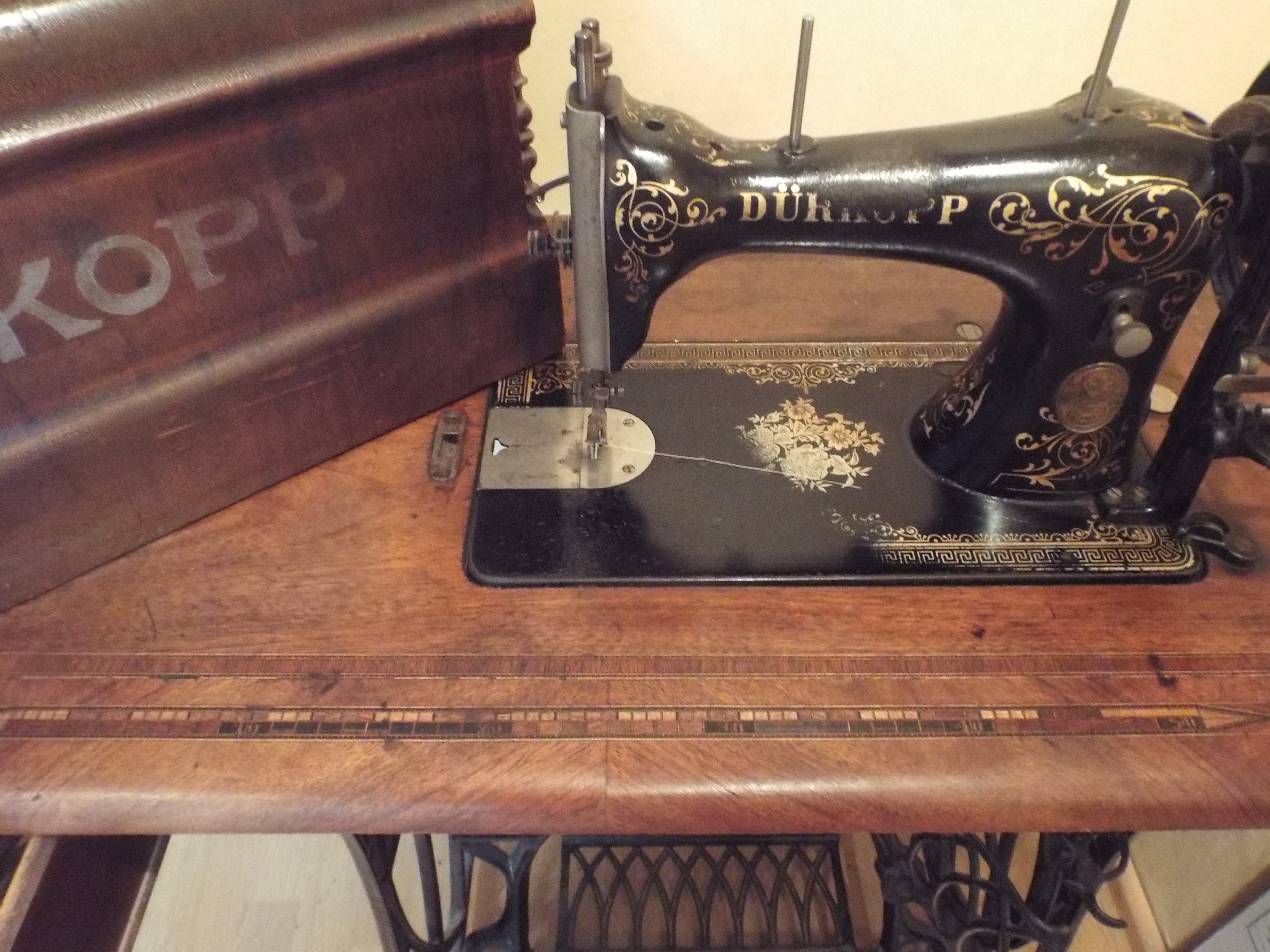 Durkopp treadle sewing machine. Inlay cm tape measure, accessory drawer contains belt for treadle as well as extra sewing accessories. Working condition.