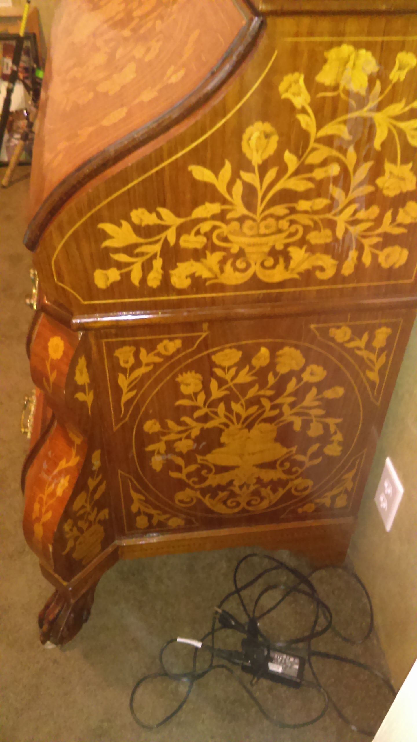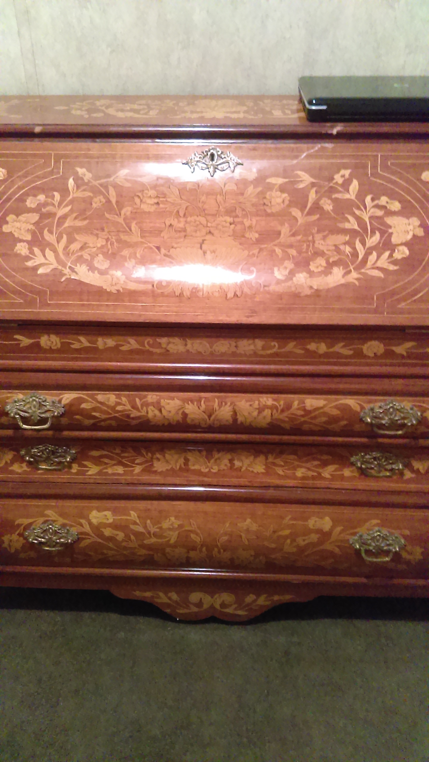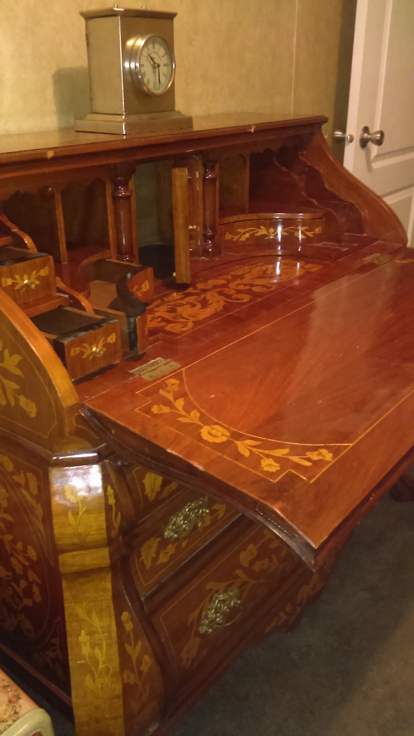 I was told this is a Dutch marquetry drop front bombs desk, circa 1790. The makings on the back of each drawer and on desk itself is Indian Sanskrit.and they are numbers, all brass hardware and claw feet, from best I can tell has never been refinished,all pieces are intact, all joints are dove tail.only two blemishes on top, other then that no splits in wood,very solid and beautiful.
