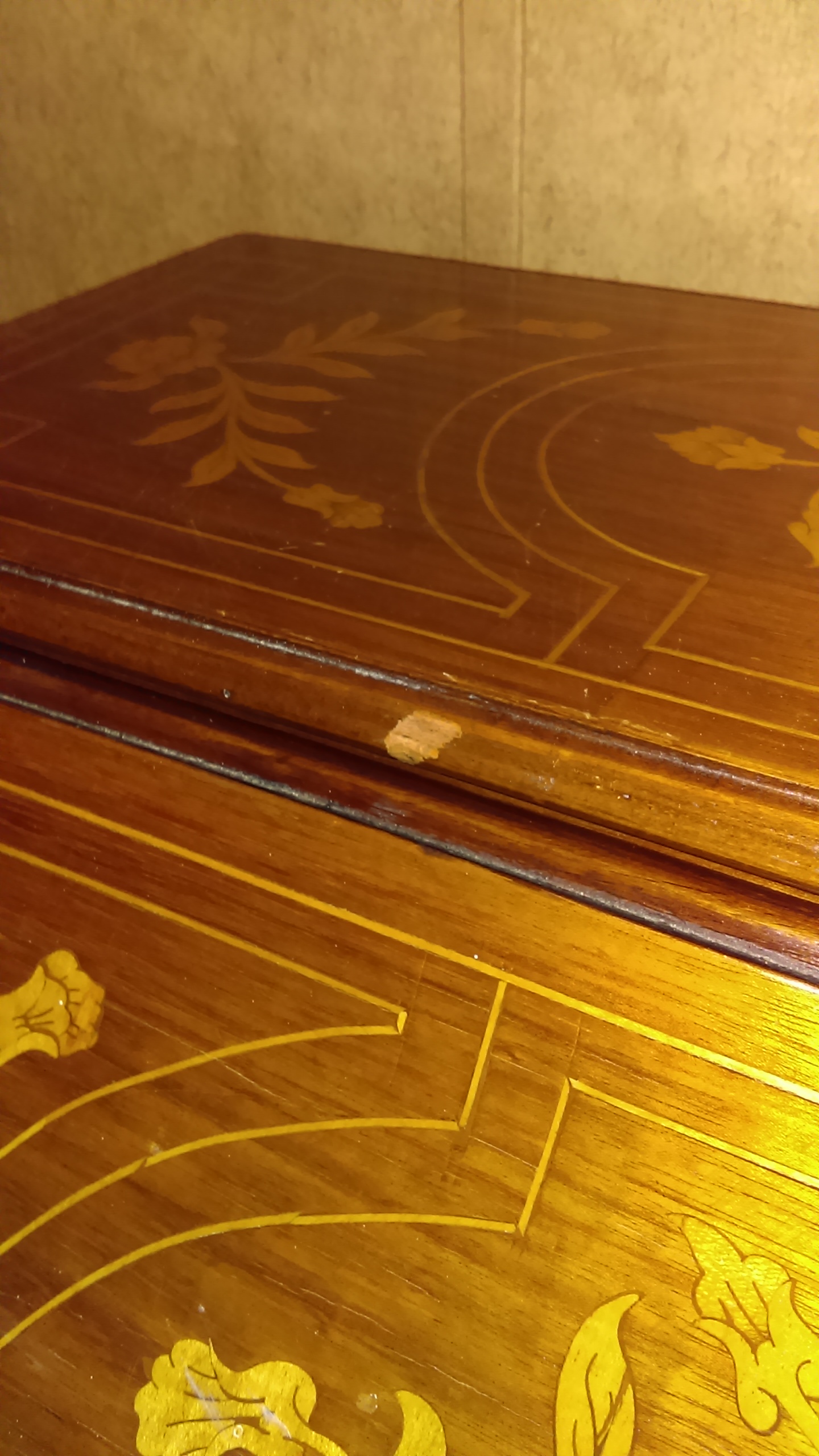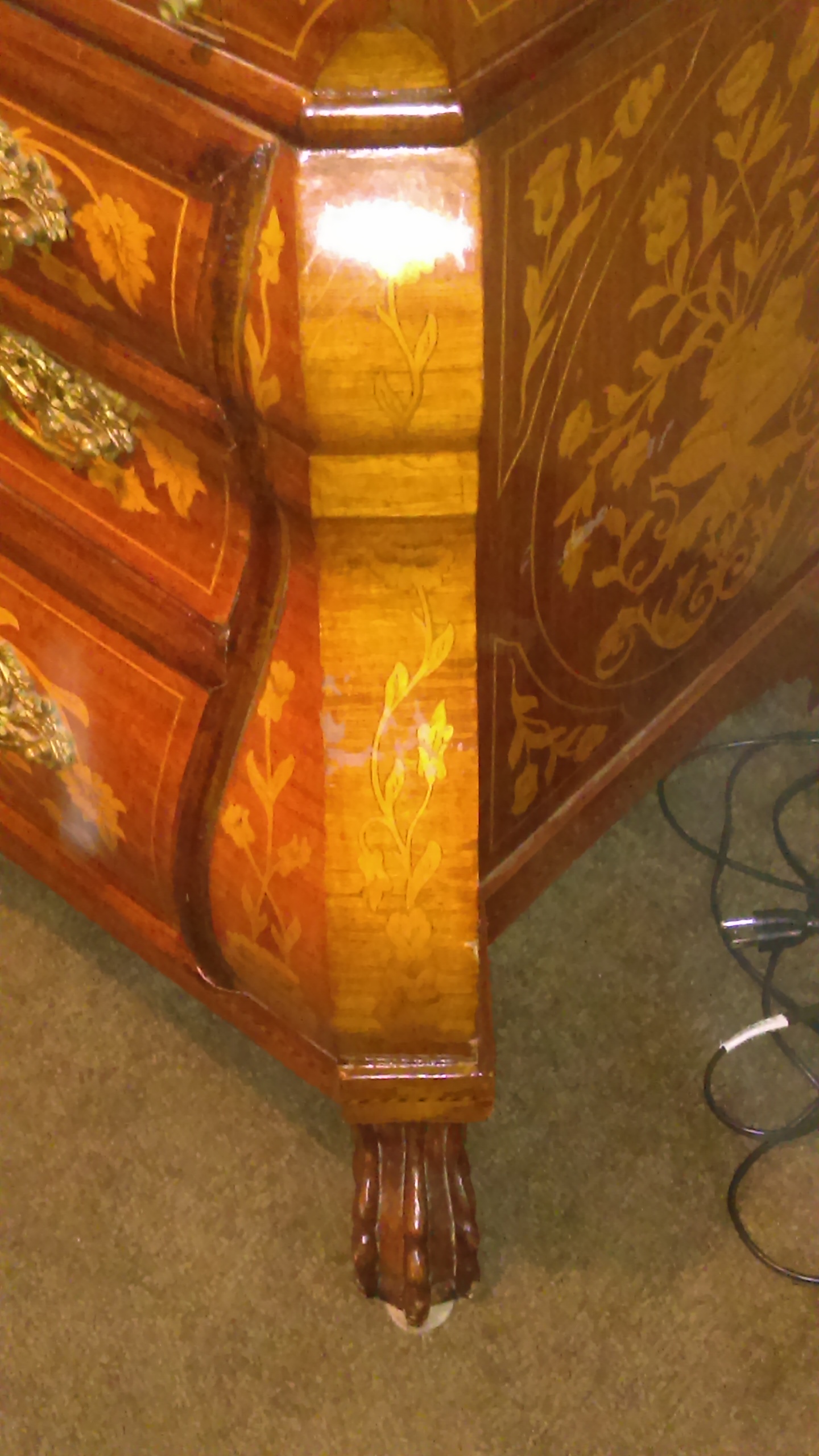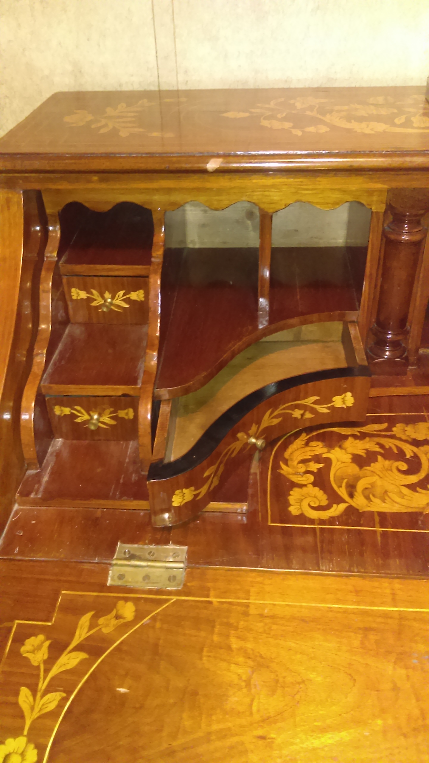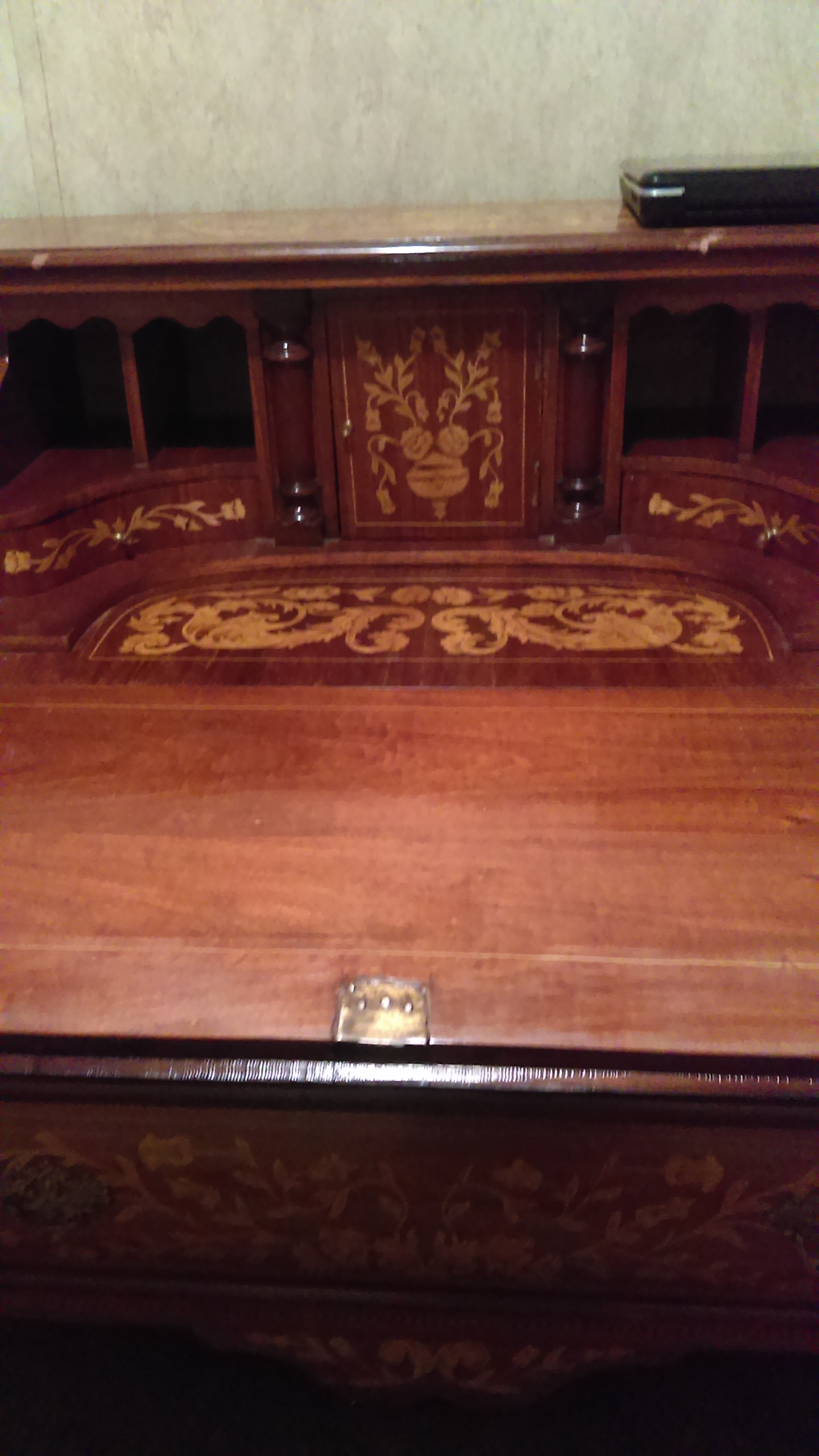 I was told this is a Dutch marquetry drop front bombs desk, circa 1790. The makings on the back of each drawer and on desk itself is Indian Sanskrit.and they are numbers, all brass hardware and claw feet, from best I can tell has never been refinished,all pieces are intact, all joints are dove tail.only two blemishes on top, other then that no splits in wood,very solid and beautiful.