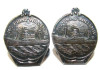 scene in center of plate of windmills by a river with boats and people on shore.all around the outside are scenes of people danceing,singing or playing instruments all in what appears to be clothing from the 1700's or perhaps 1800's.in between each scene is some sort of some type of medieval animal.