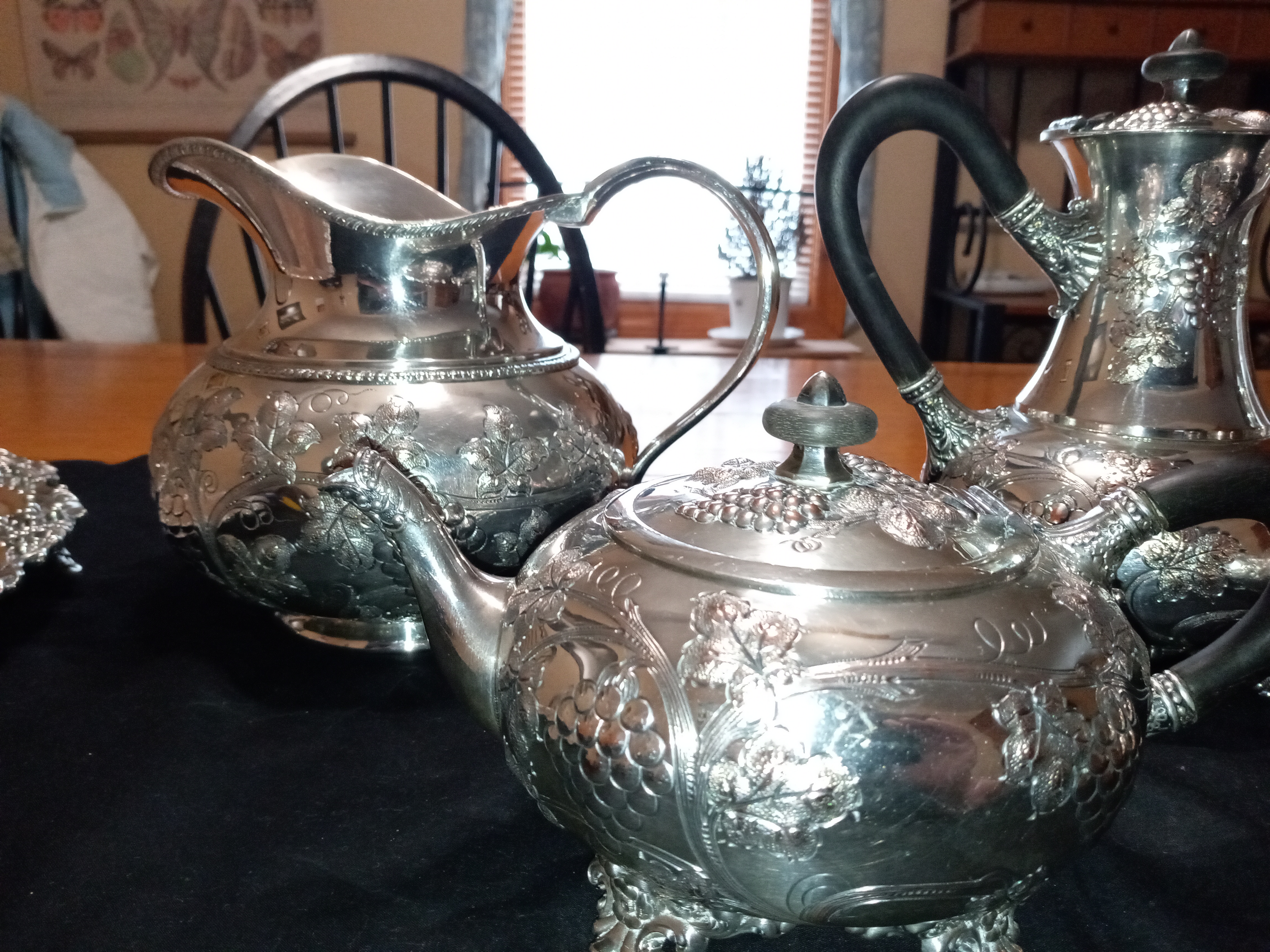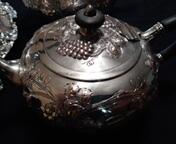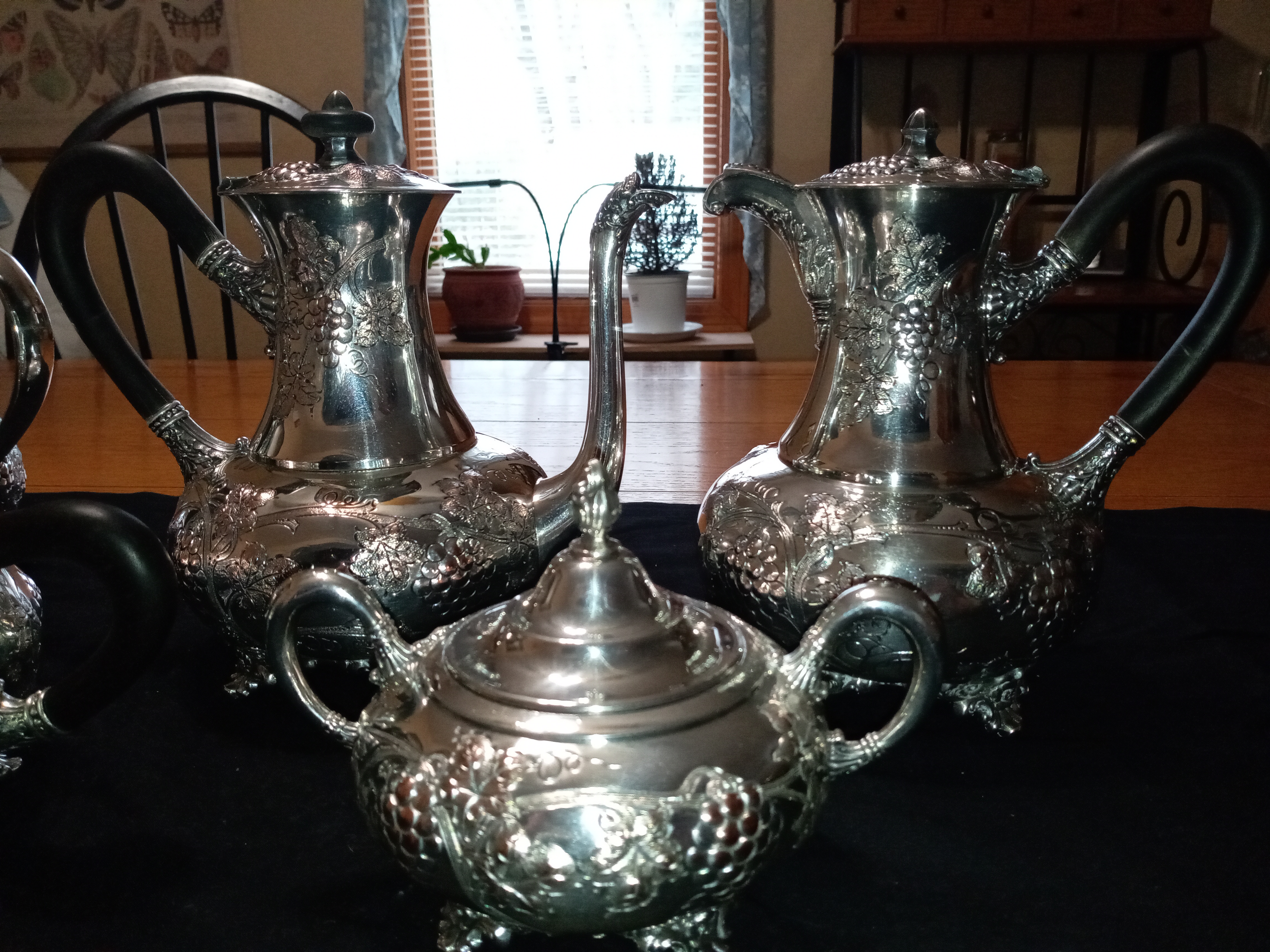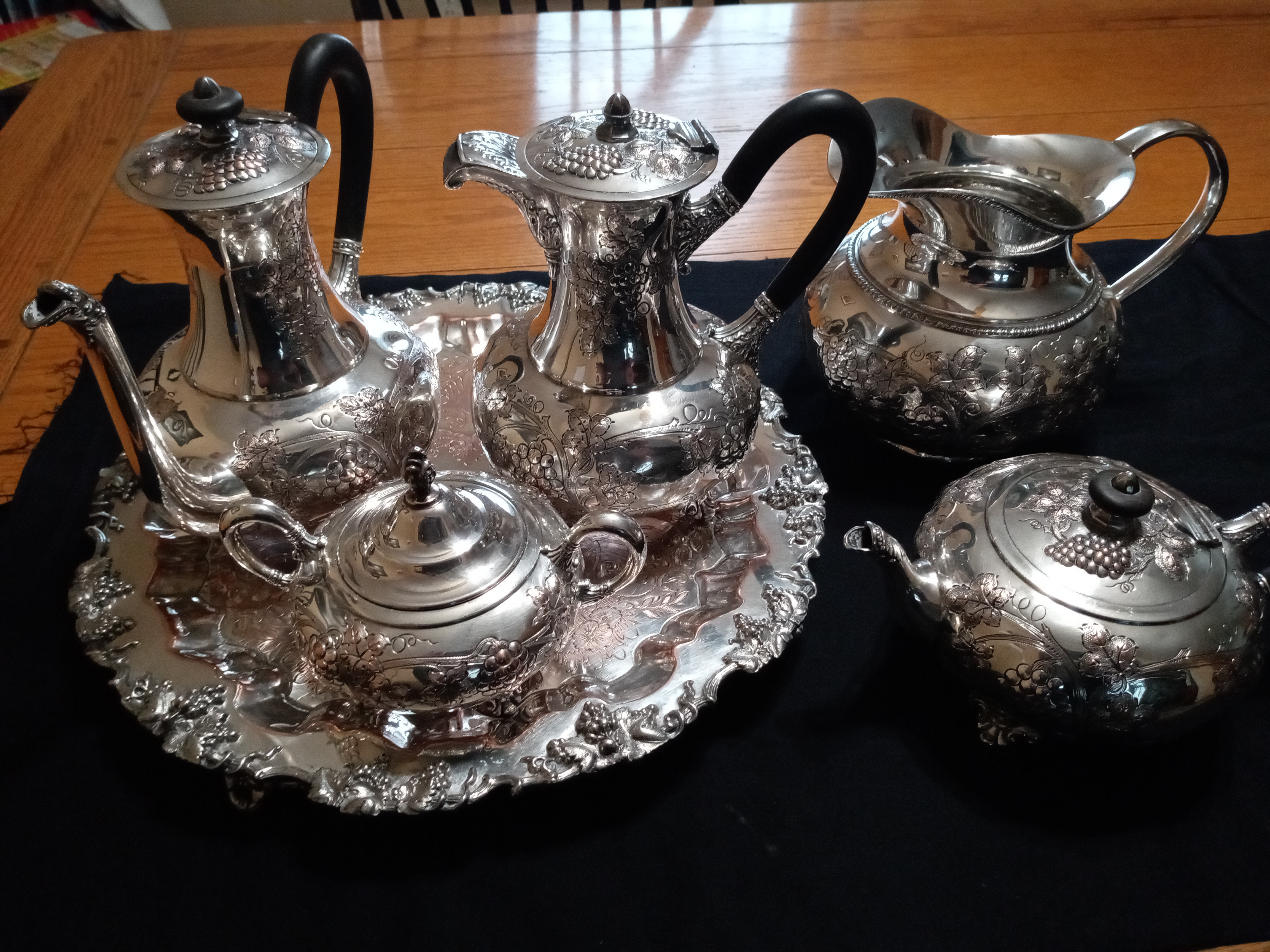 E G Webster Coffee/Tea set in silverplate hand chased and repoussé with solid ebony handles. This is a matching set with grape leaves and grapes with floral feet and hinged lids