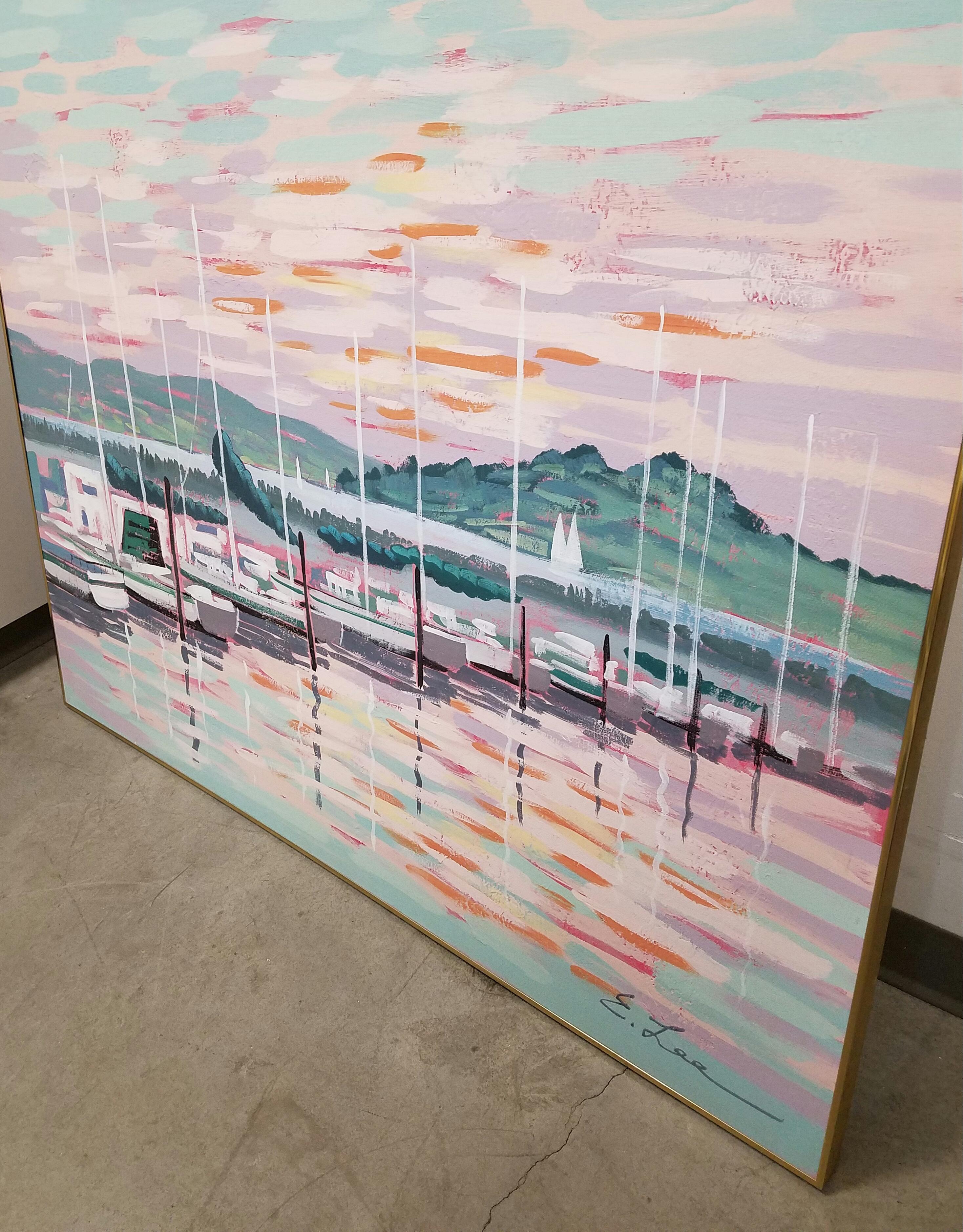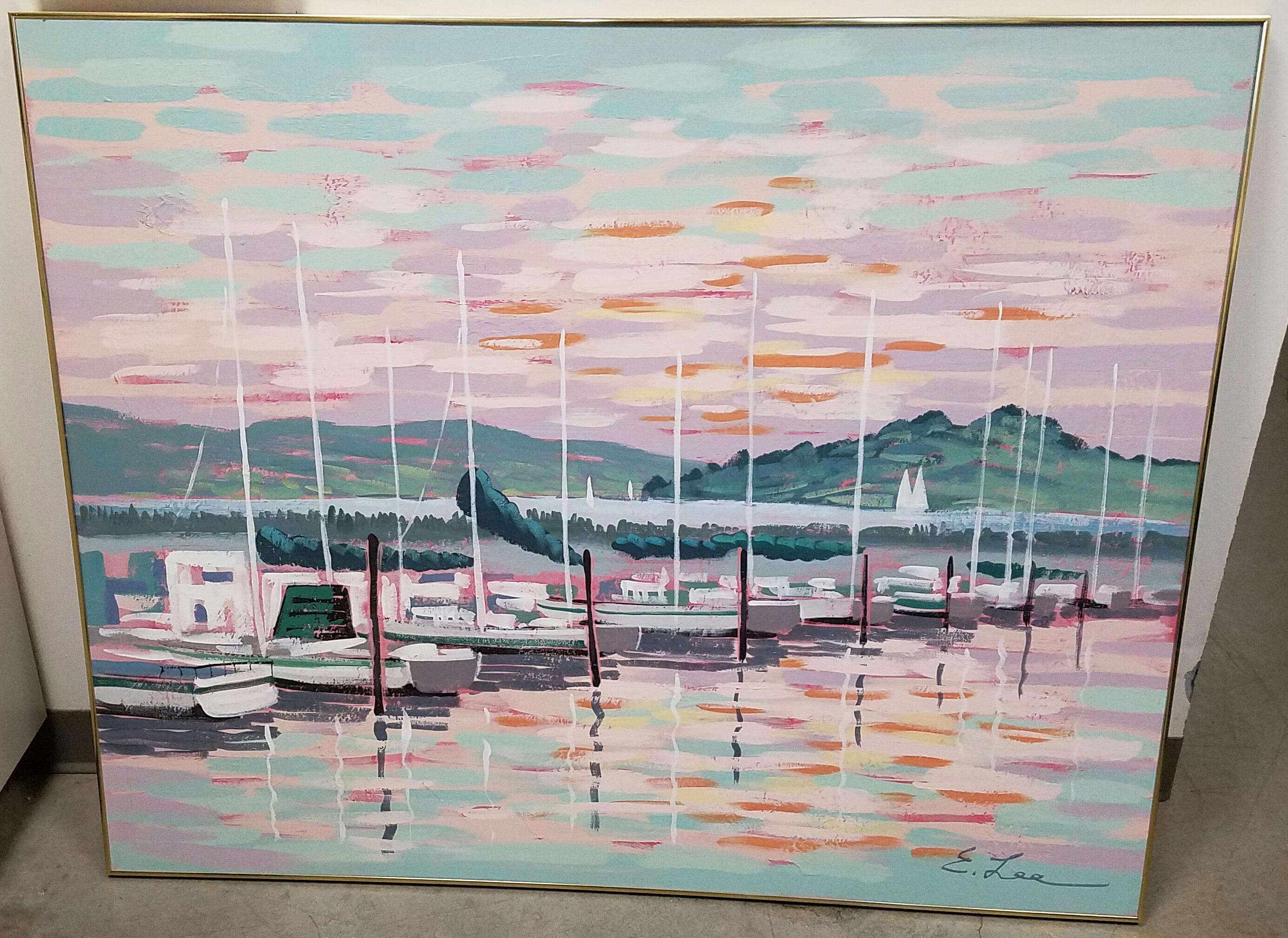 Signed E. LEE Painting IBM#01729 58 84 Sunset Boats. 48x36