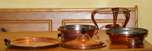This chafing dishes is in fairly good shape. It is missing the long wooden handle and the lid to the Sterno container. There are a few dings in it and the rim of the Sterno container in slightly bent in one spot.