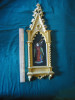 Item size is app 40x50cm (incl original frame) Frame and painting are damaged but show lots of "character" It is hand painted on leather, which was then stretched on hardwood (chestnut) as is customary and clearly original (I think). These icons usually have been kept there for generations, hanging in a small byzantine church or peoples homes.
